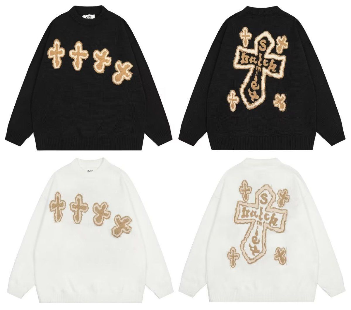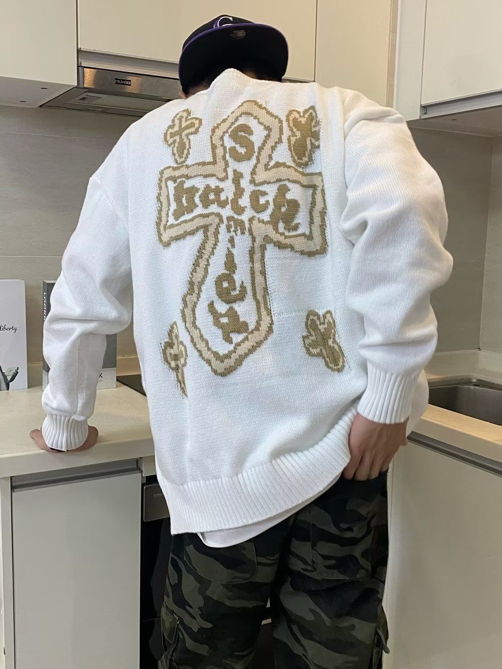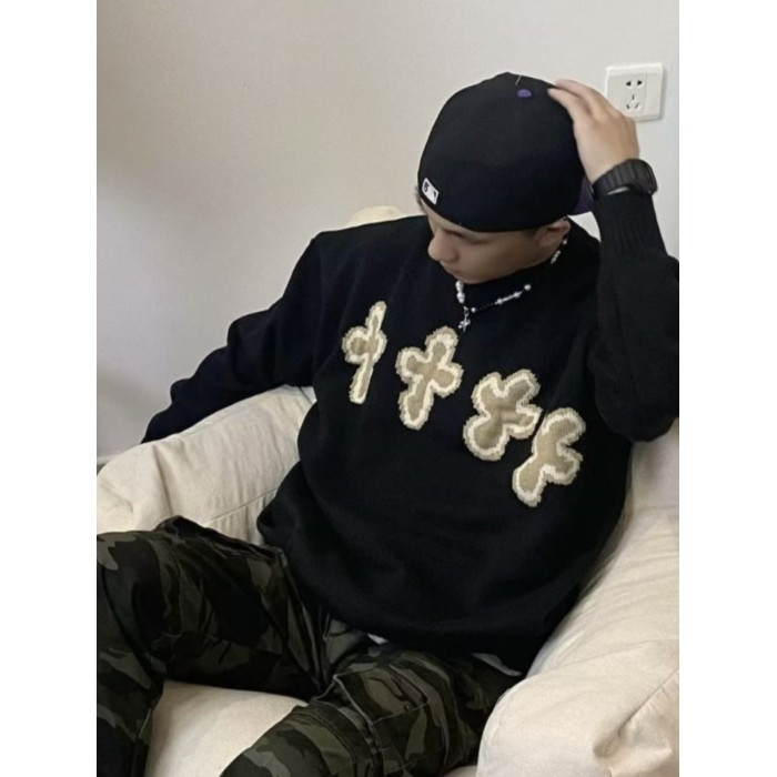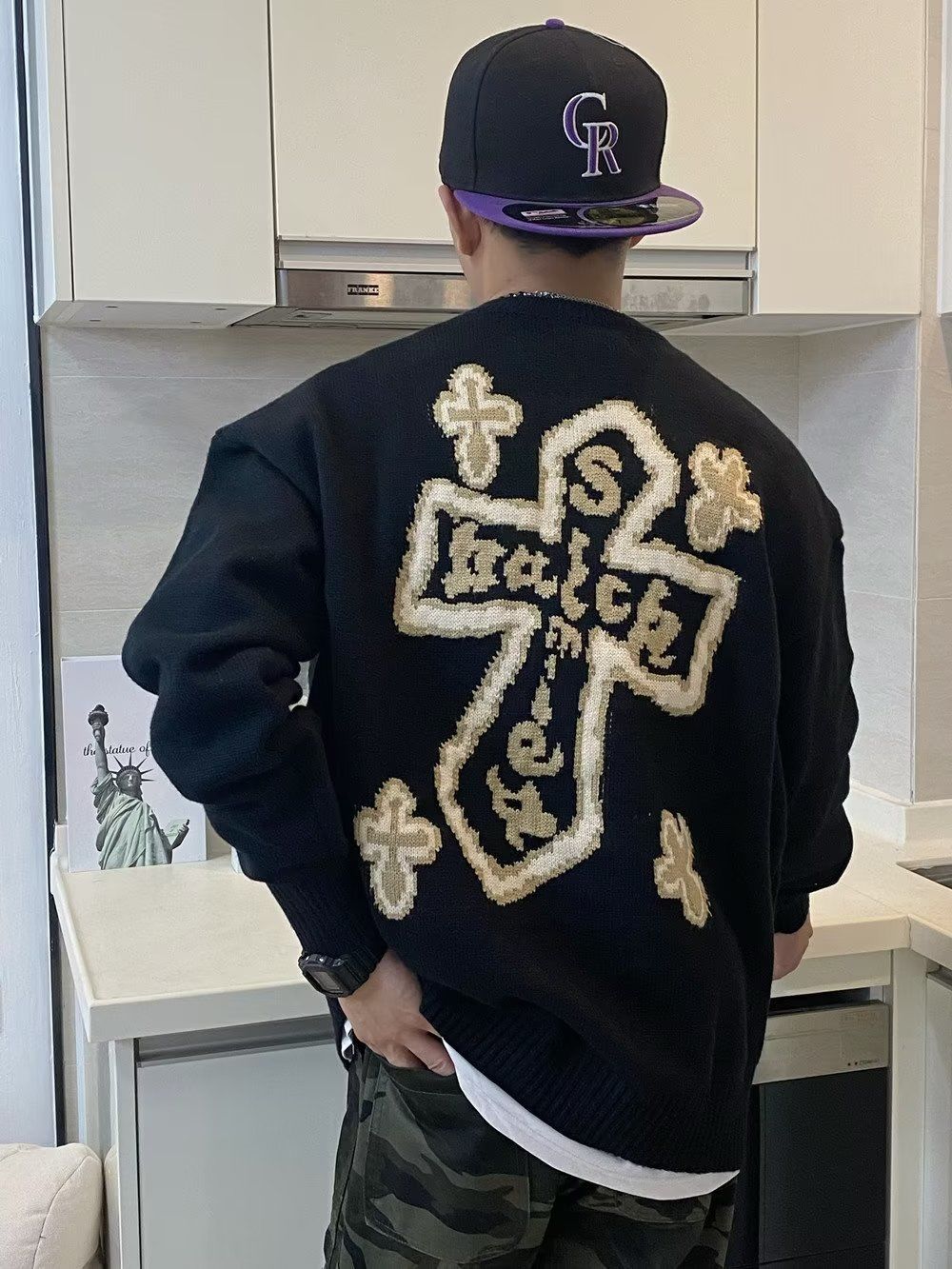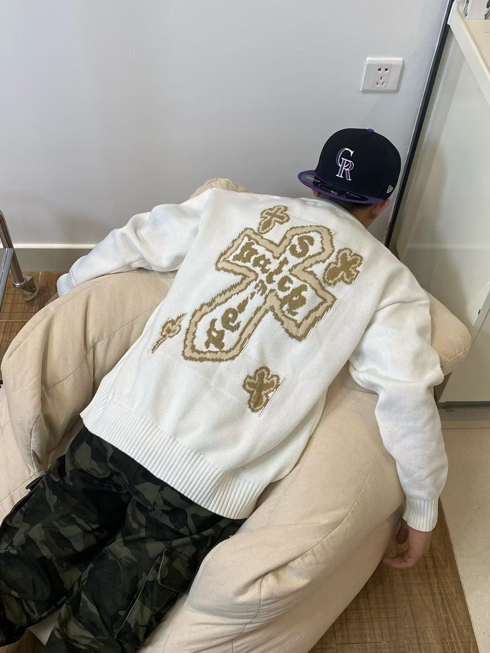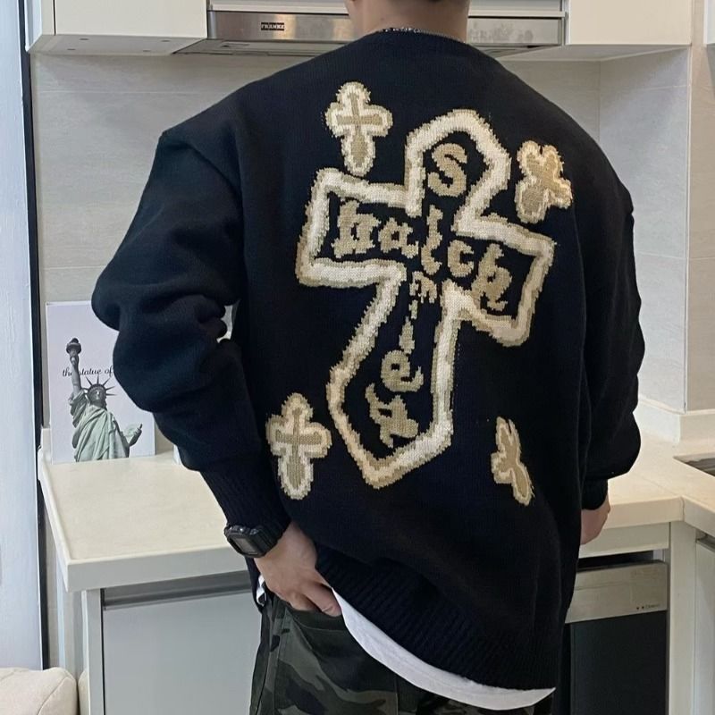 韓國買手貨高級高街十字架塗鴉毛衣男女款復古小衆嘻哈情侶針織衫