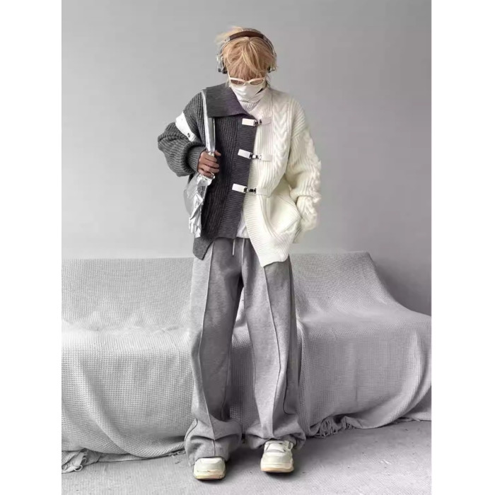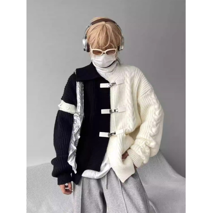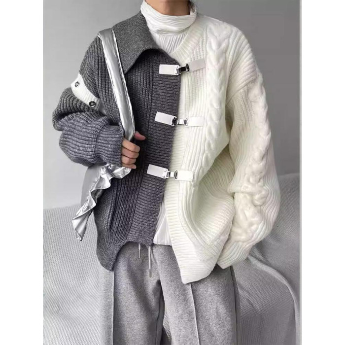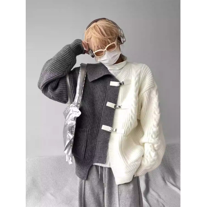 小衆設計感不規則撞色拼接毛衣男女同款寬松解搆金屬針織開衫外套