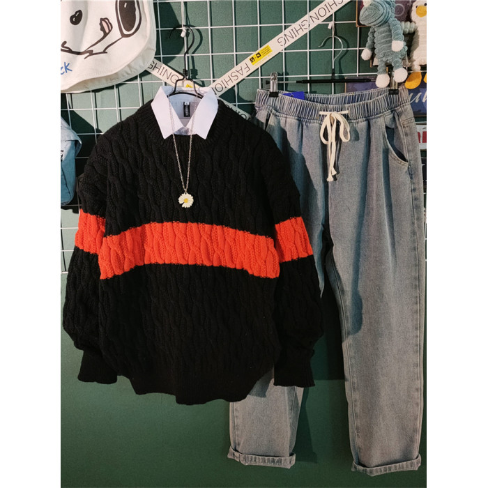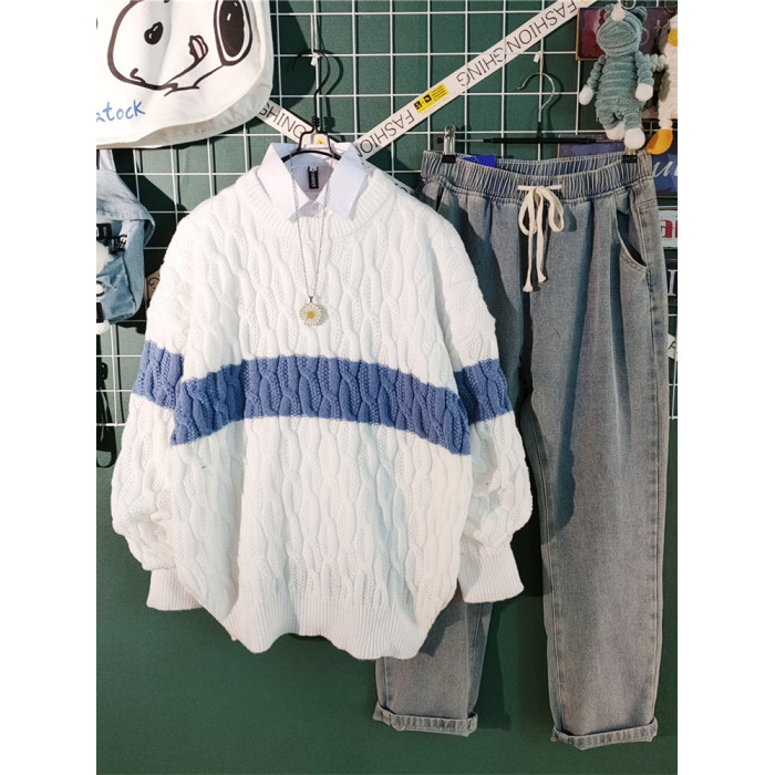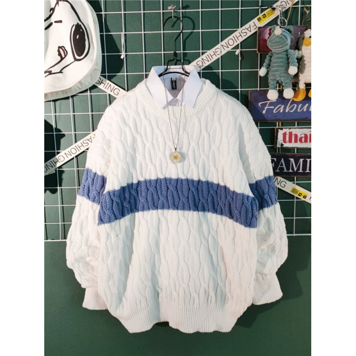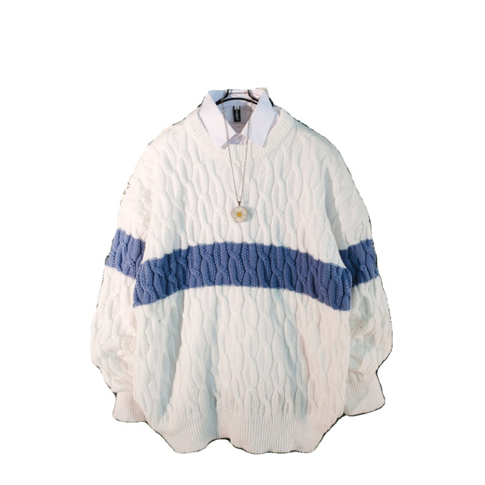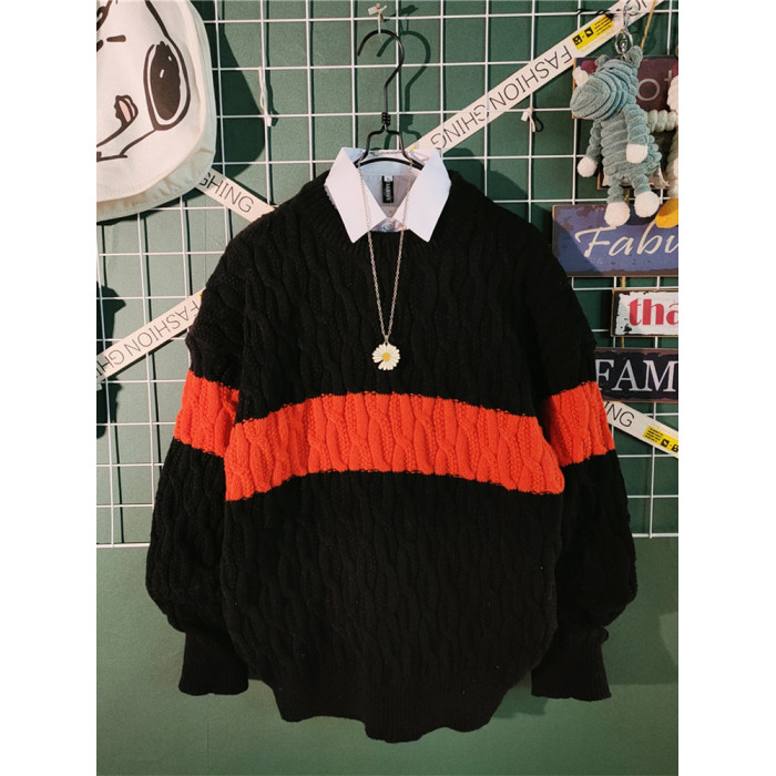 日系慵懶風拼色毛衣男冬季加厚圓領情侶百搭麻花針織衫線衣男外套