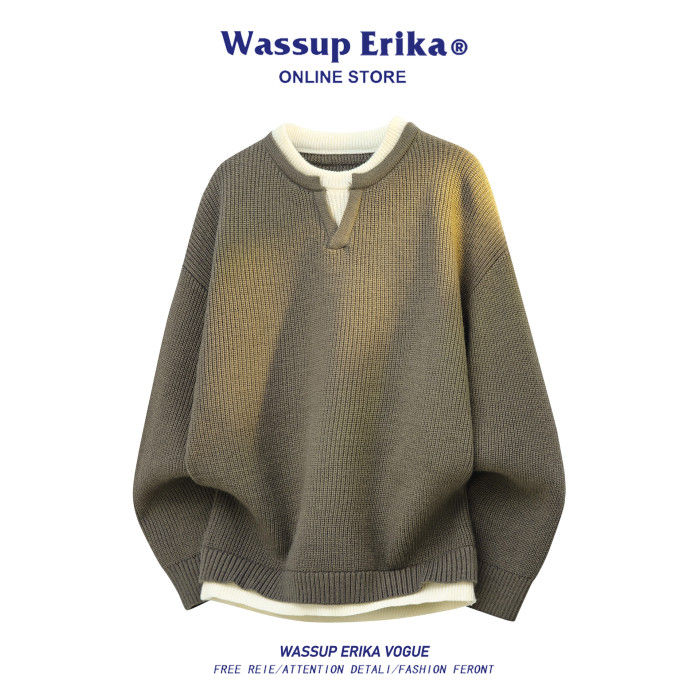 WASSUP ERIKA日系休閒假兩件針織衫男秋季套頭上衣情侶百搭毛衣女