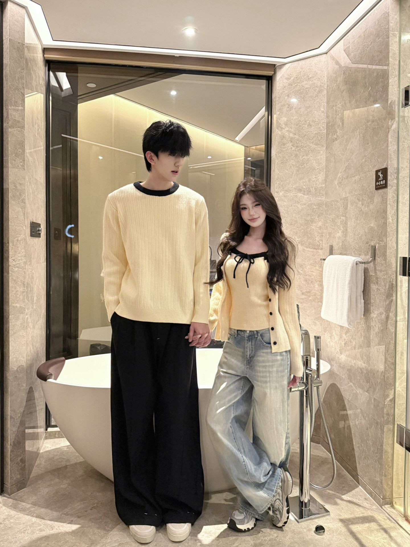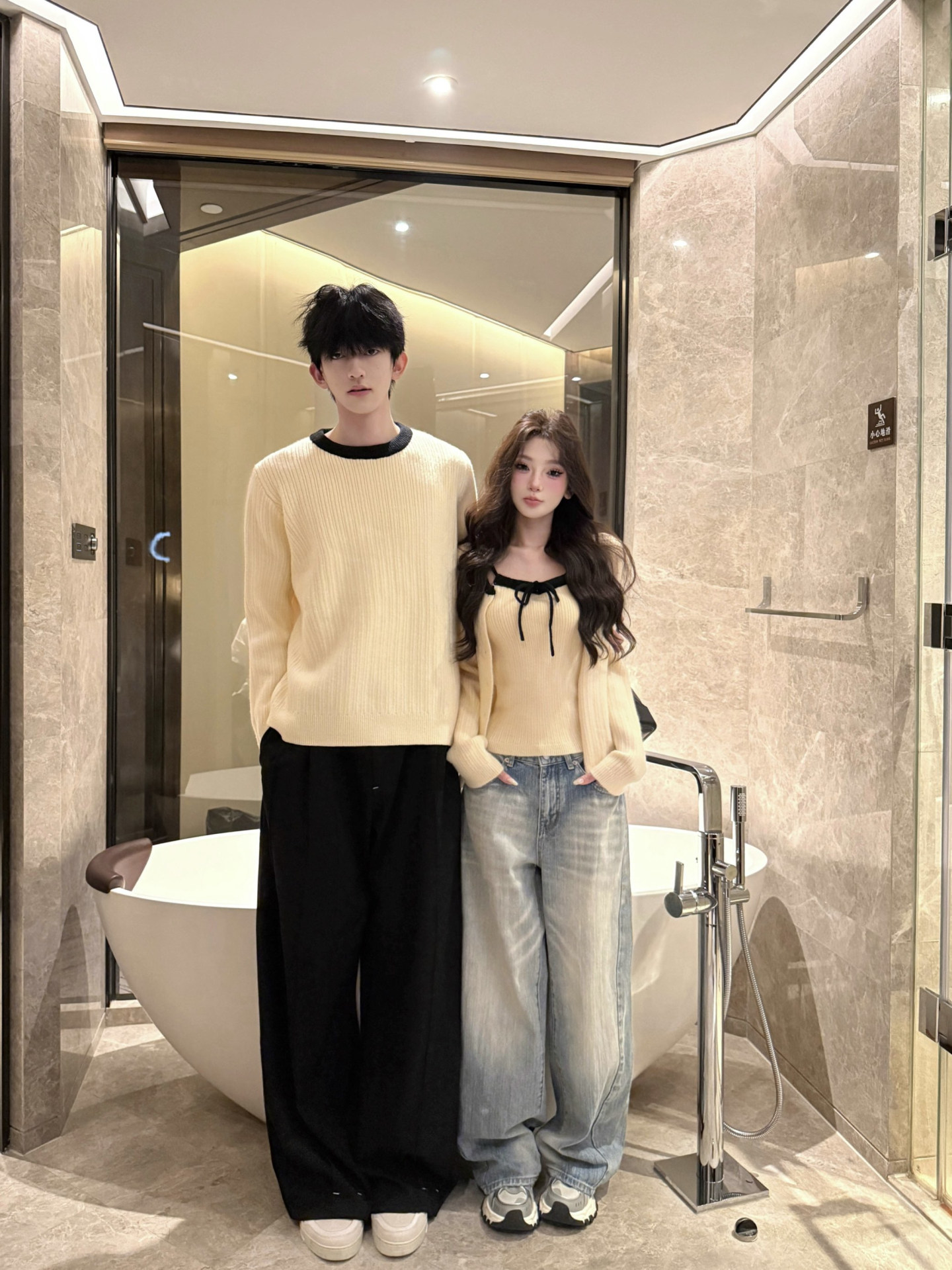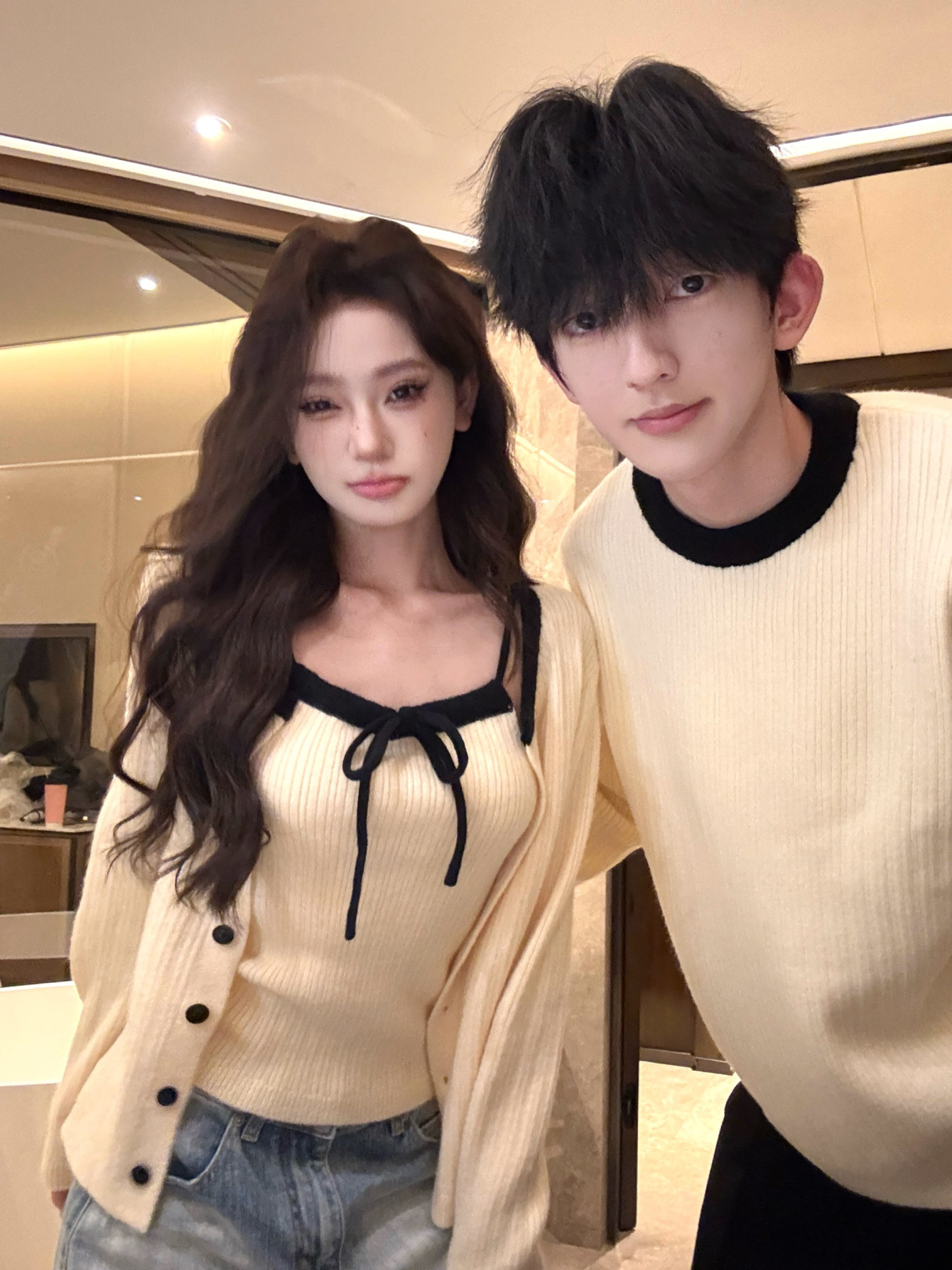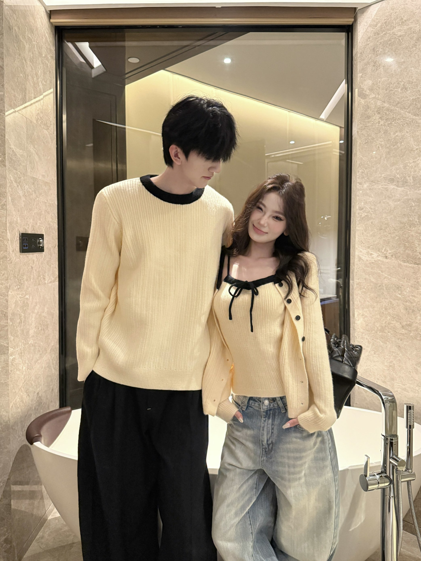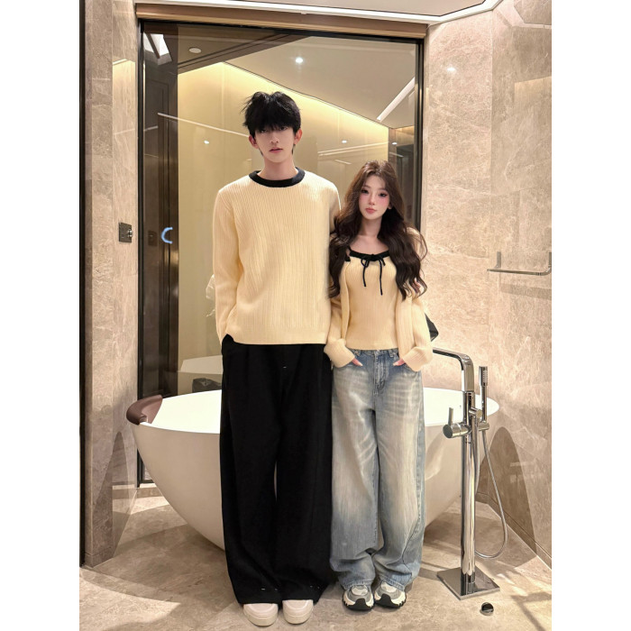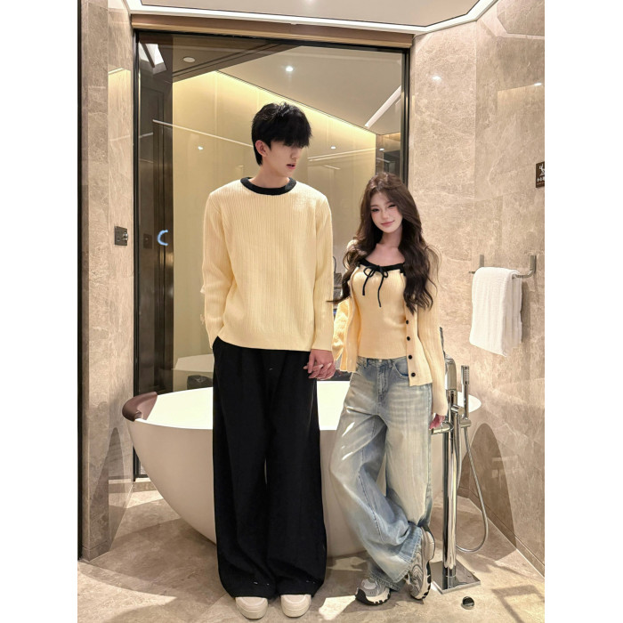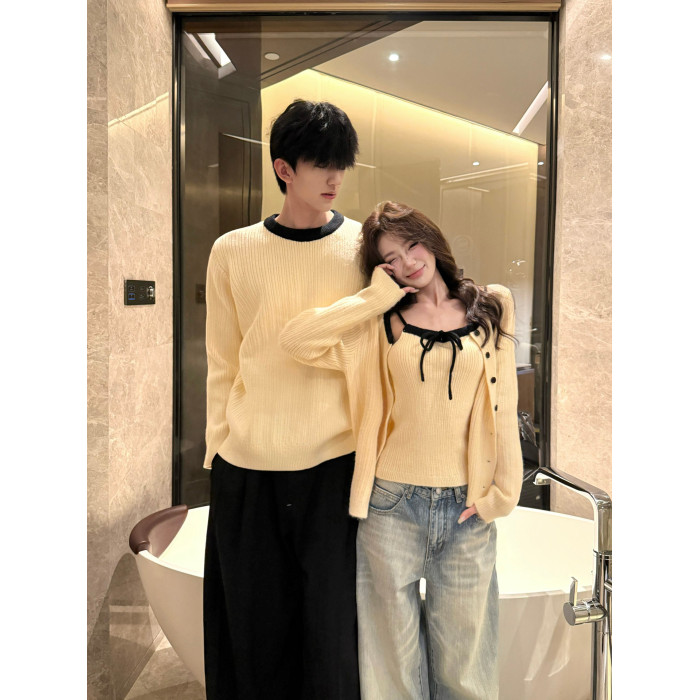 韓系氛圍感情侶裝毛衣秋冬季小衆設計感溫柔針織開衫配吊帶兩件套