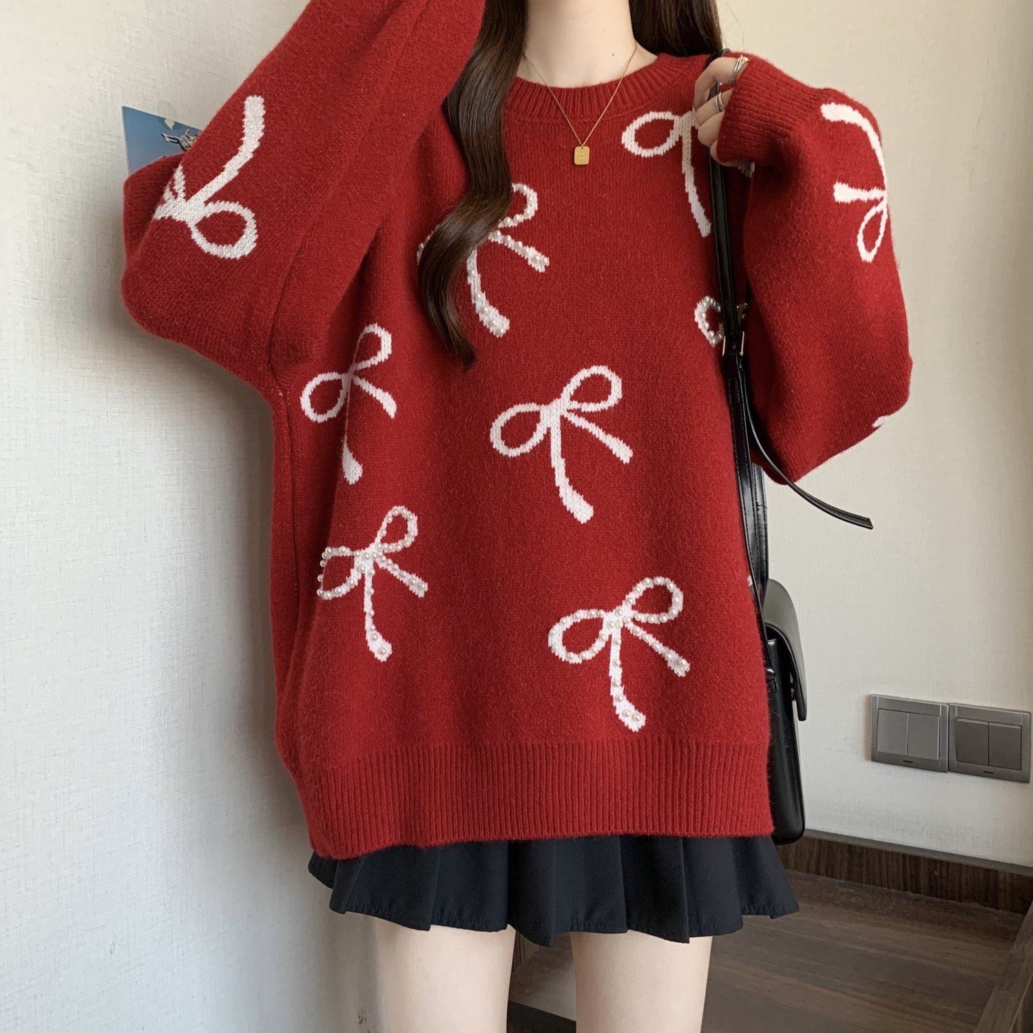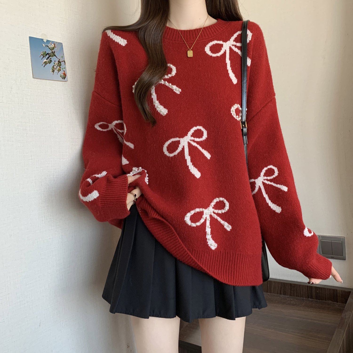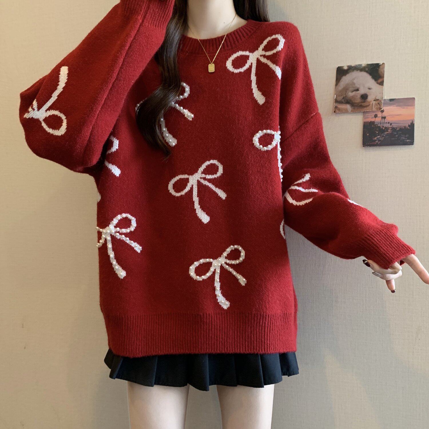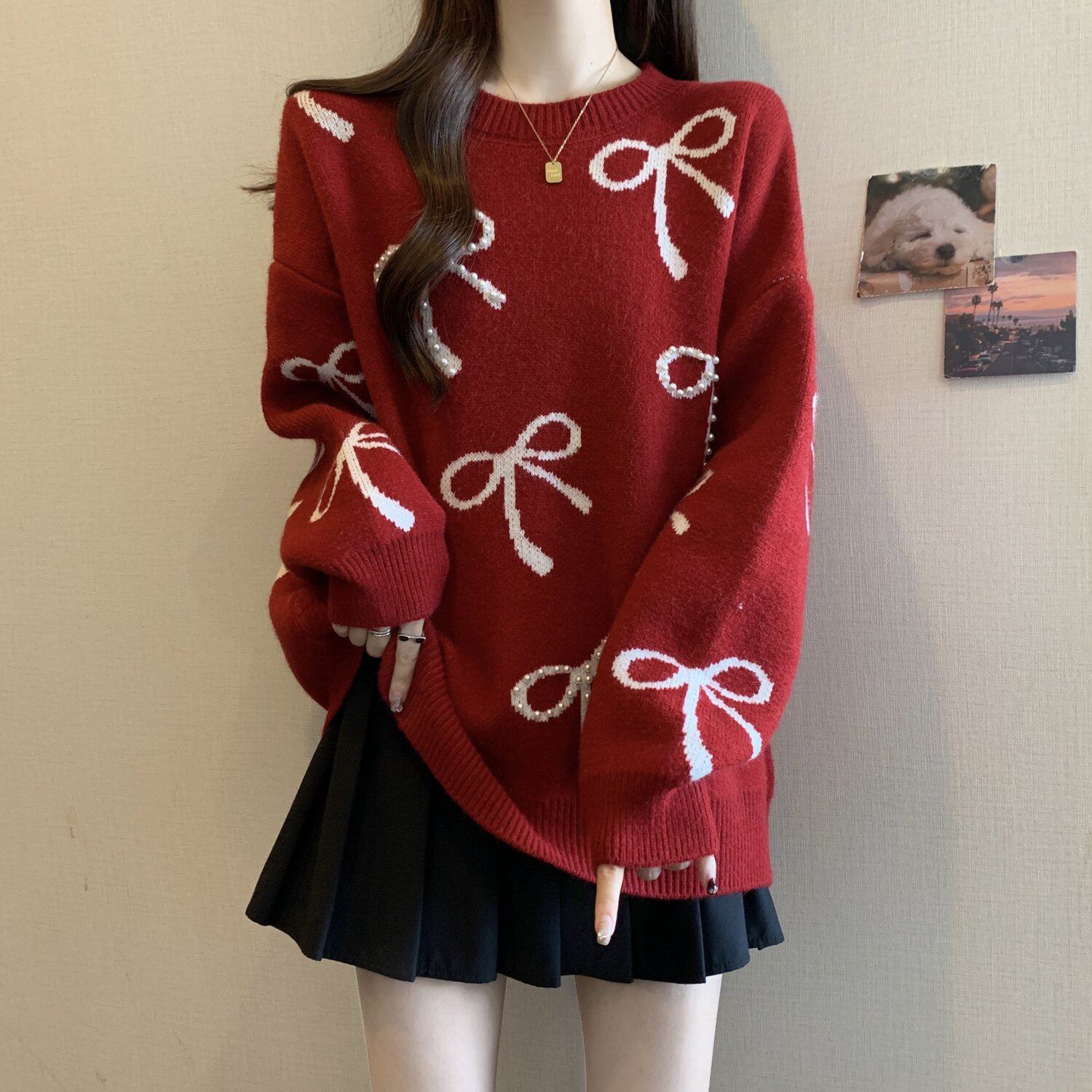 蝴蝶結紅色正肩毛衣女2025秋季新款大碼胖mm中長款針織衫減齡上衣