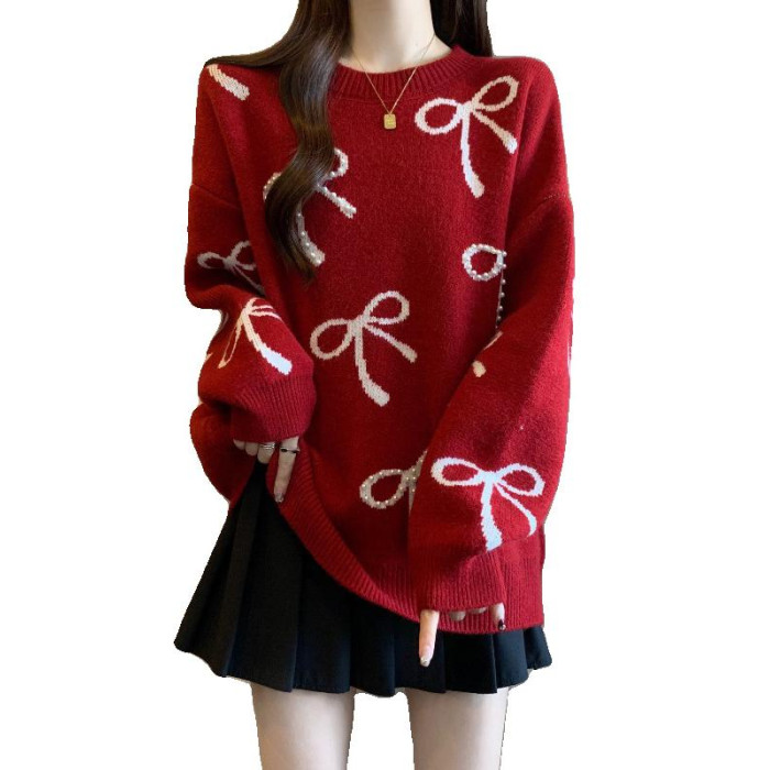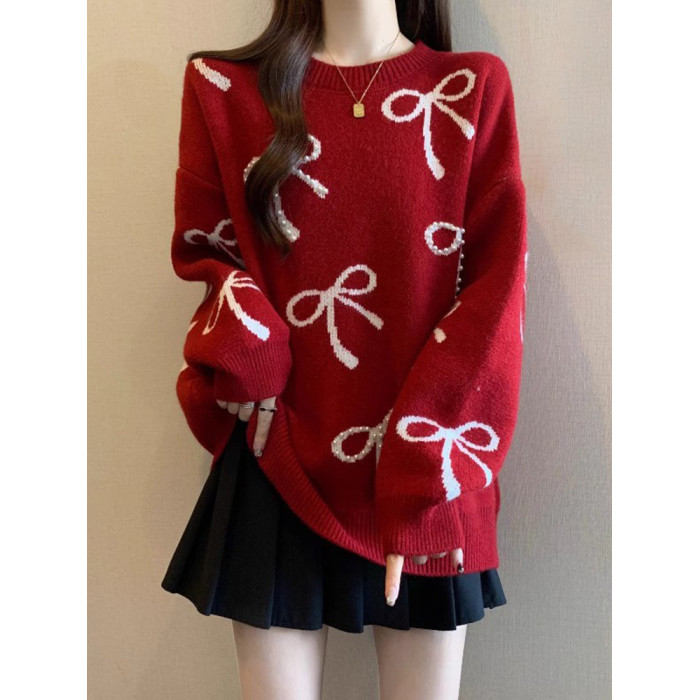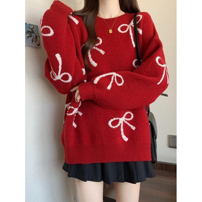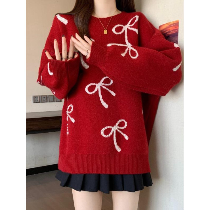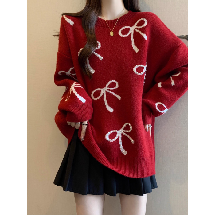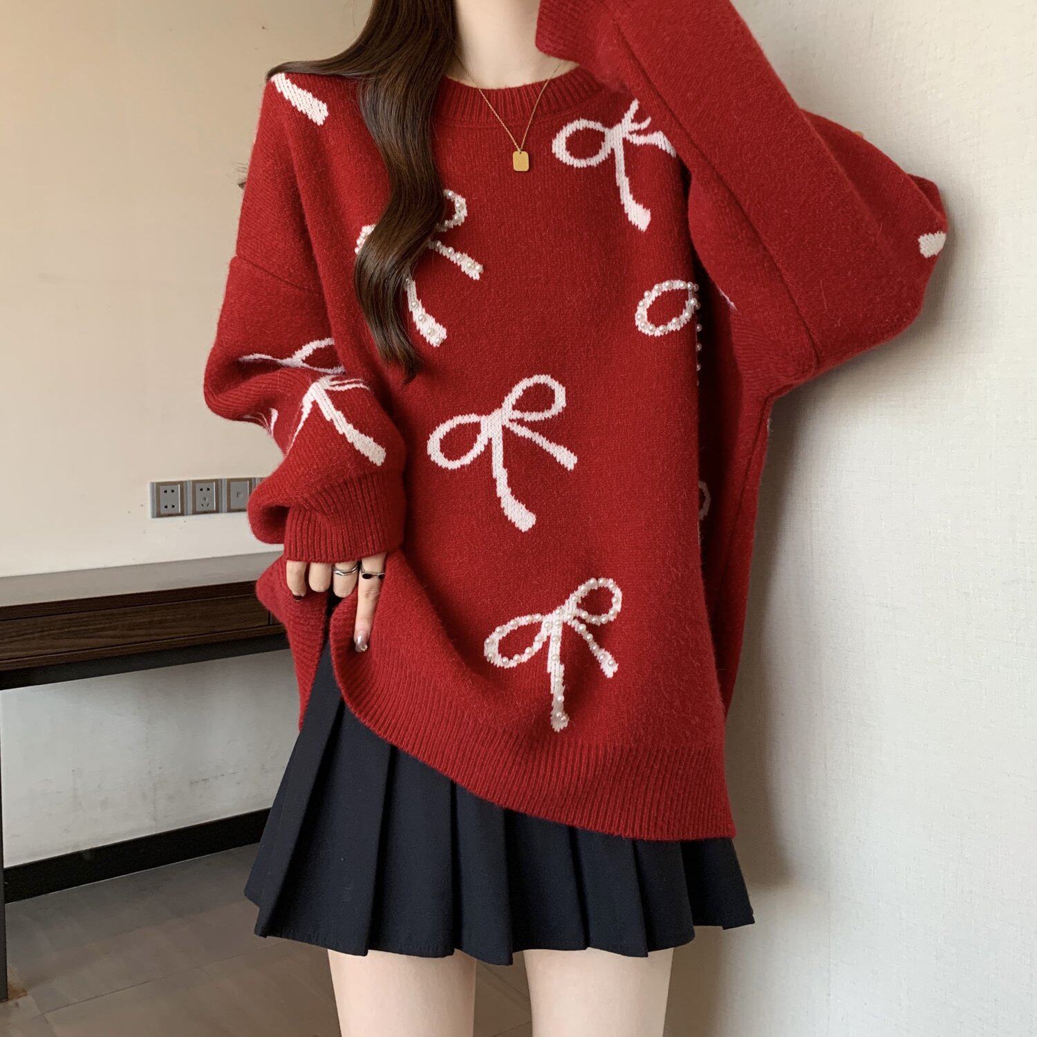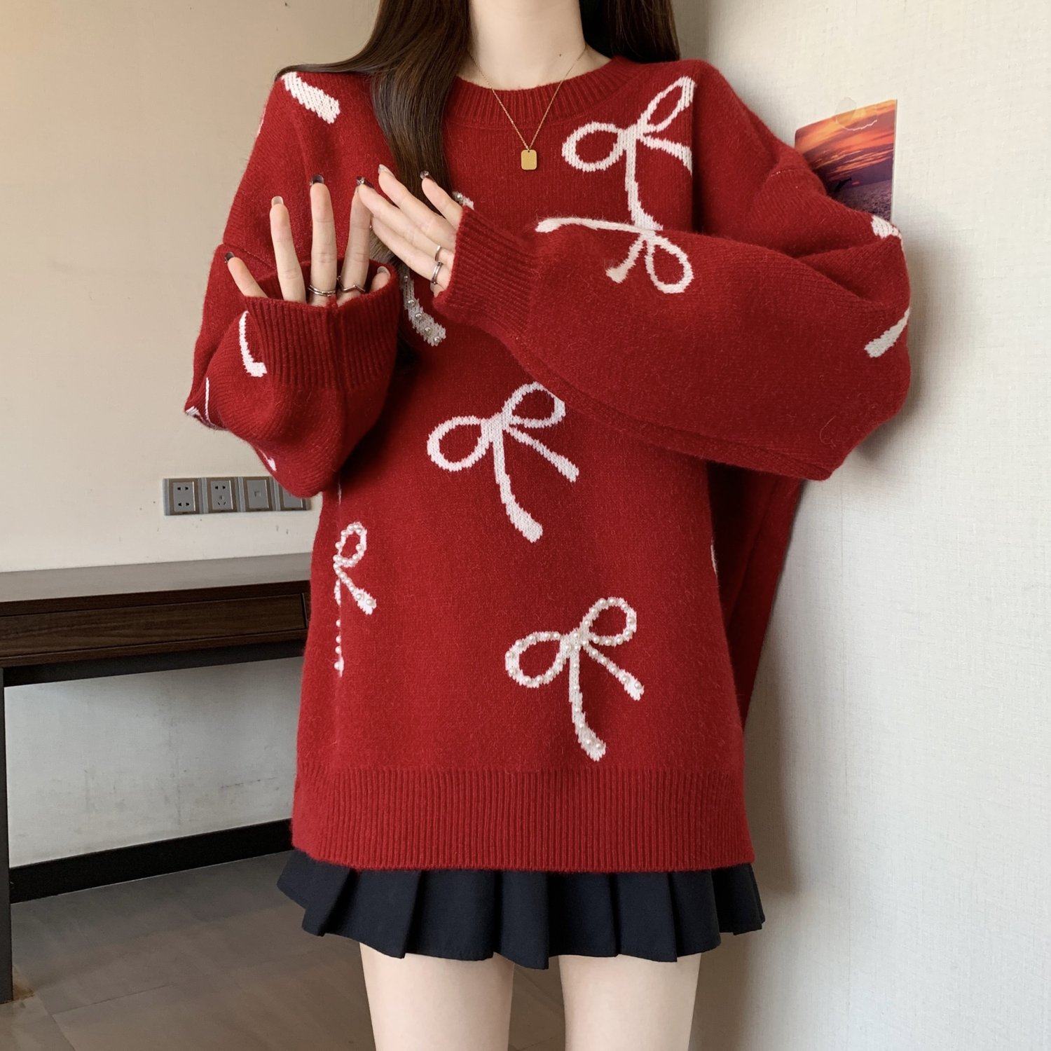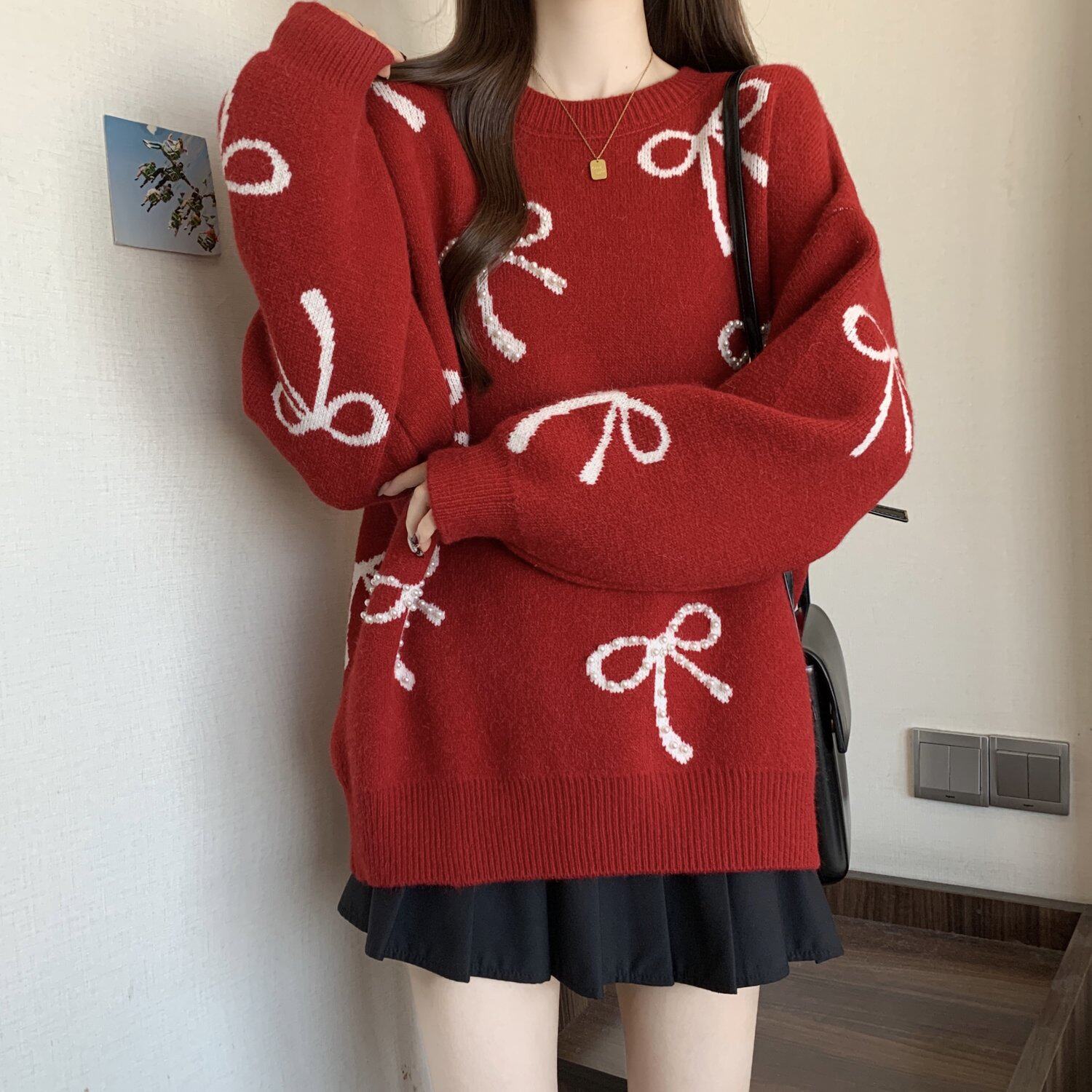 蝴蝶結紅色正肩毛衣女2025秋季新款大碼胖mm中長款針織衫減齡上衣