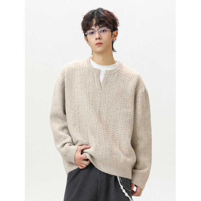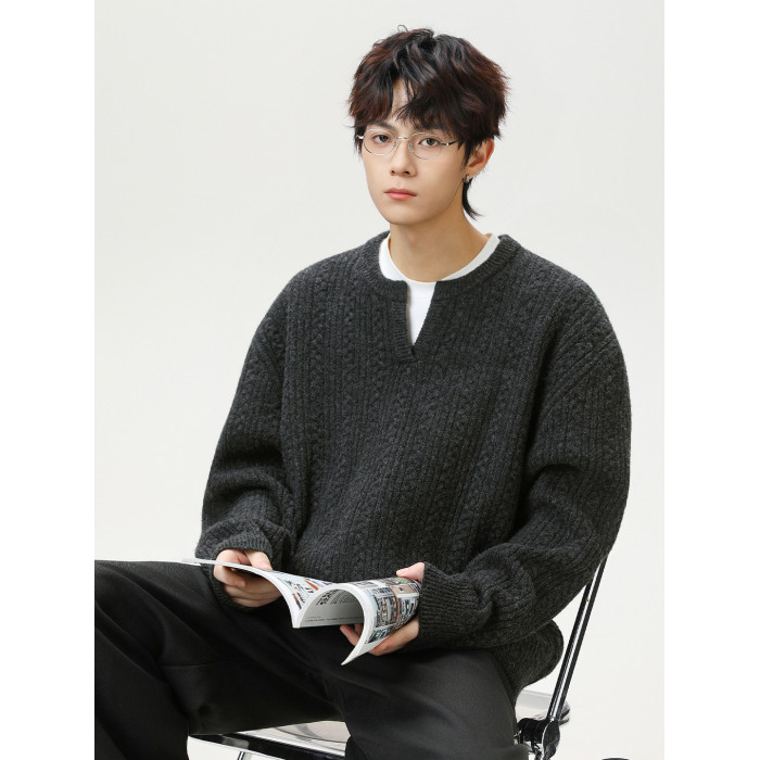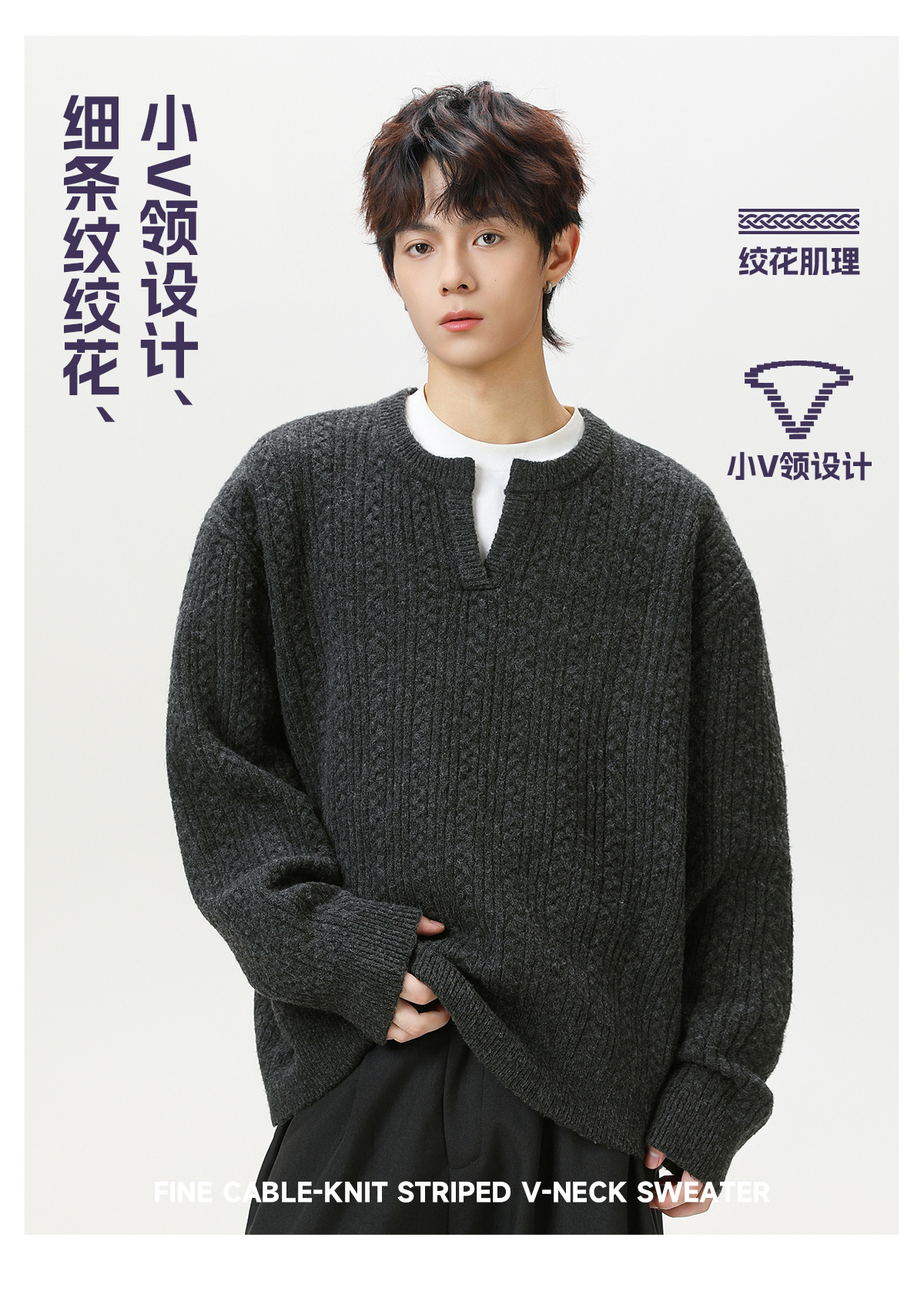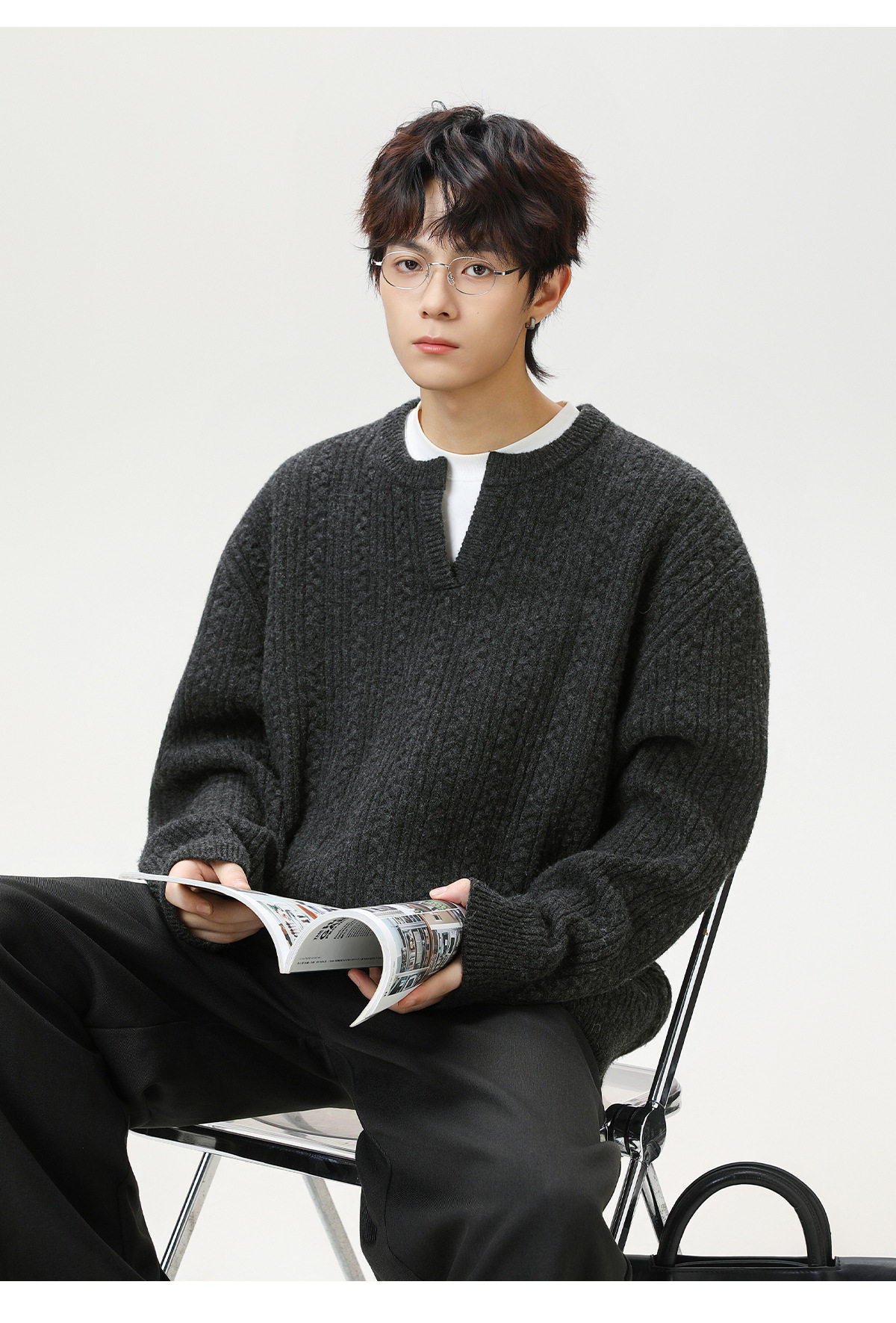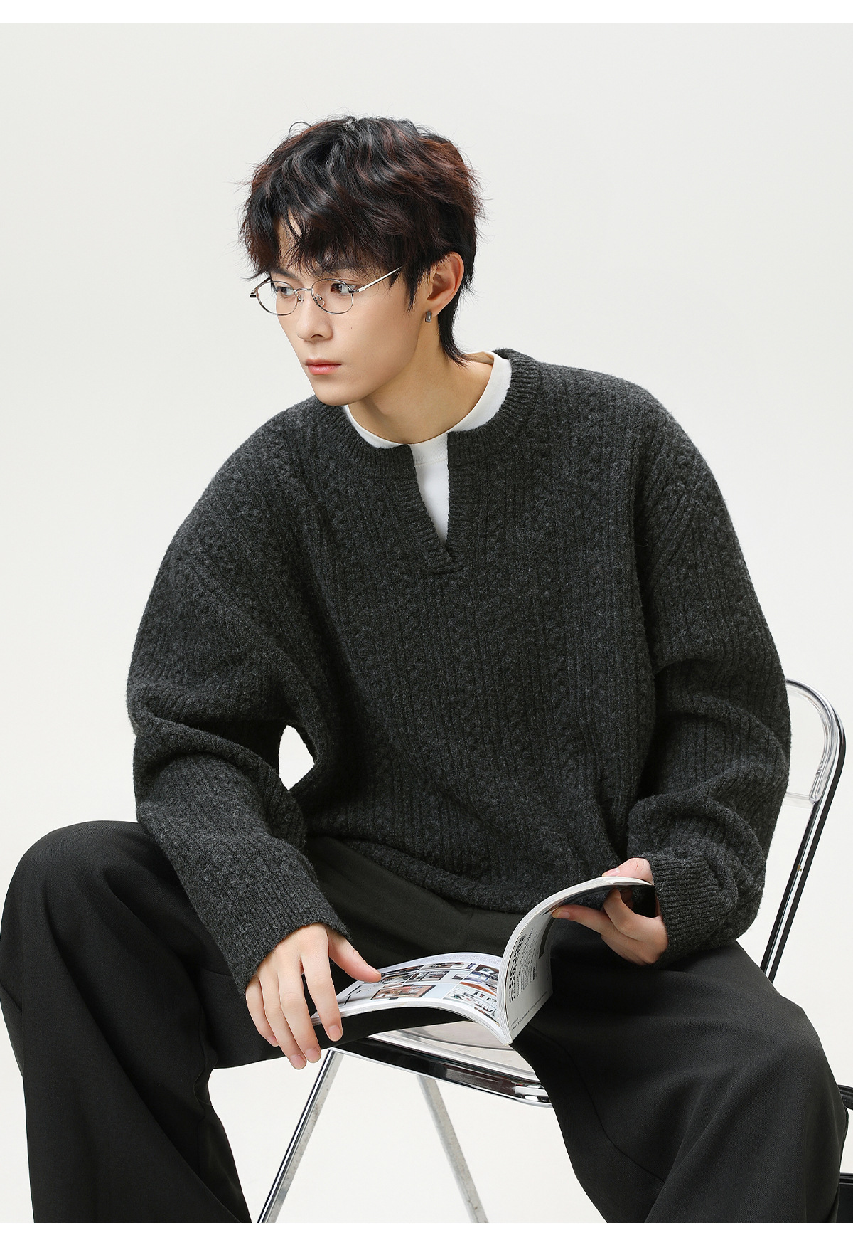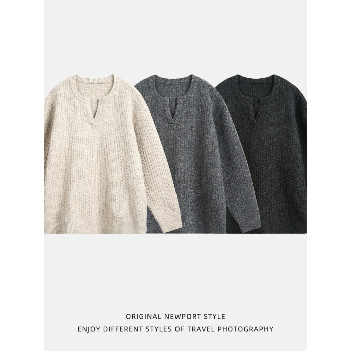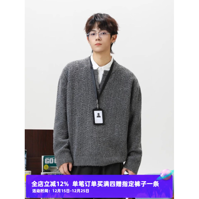 SYP日系不系男生秋冬立體絞花肌理復古寬松重磅小v領毛衣針織衫