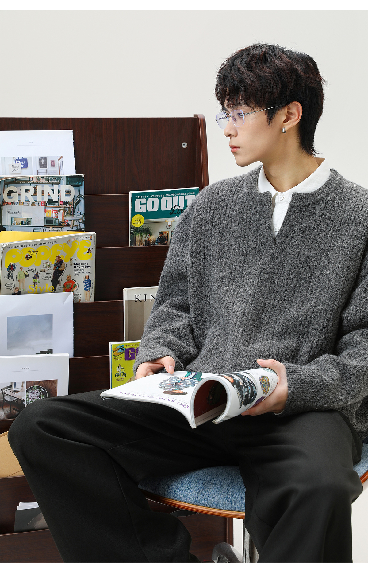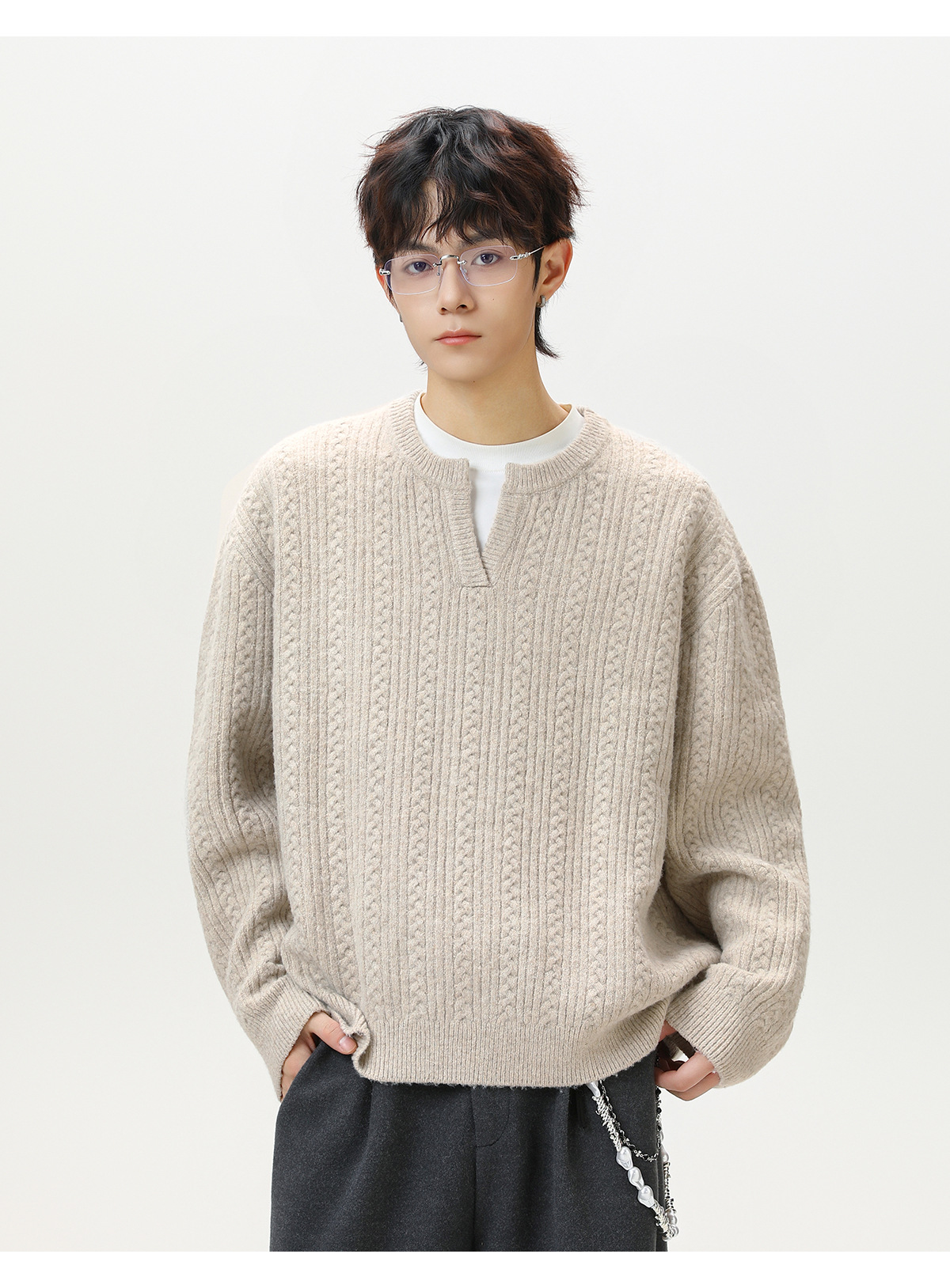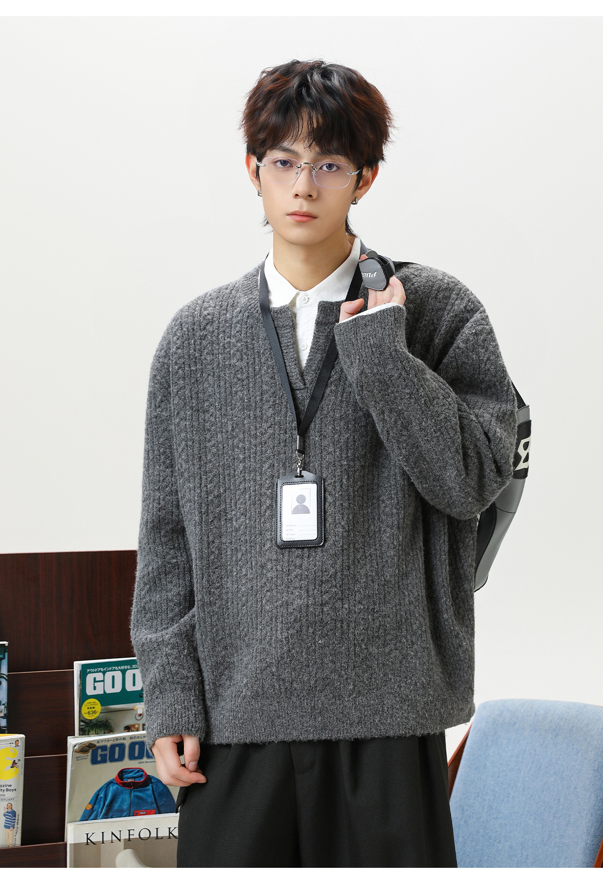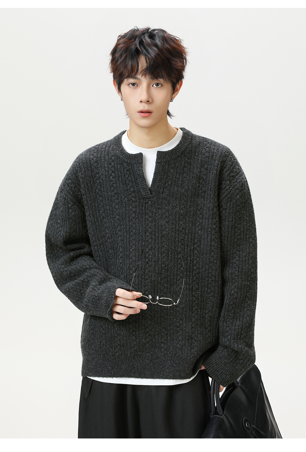 SYP日系不系男生秋冬立體絞花肌理復古寬松重磅小v領毛衣針織衫