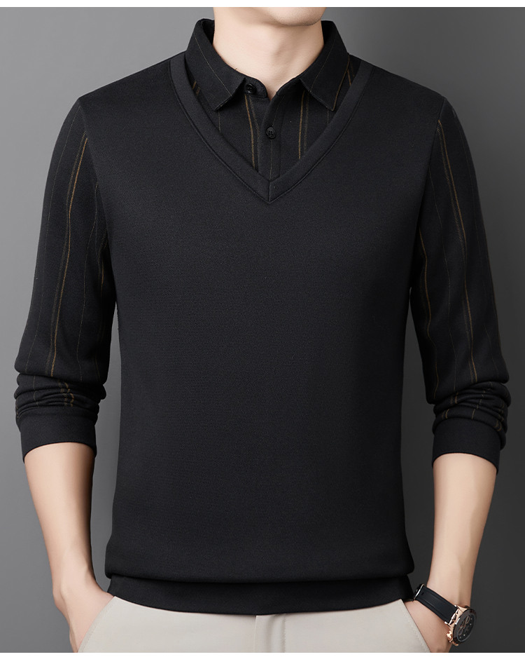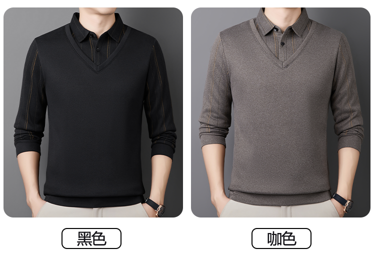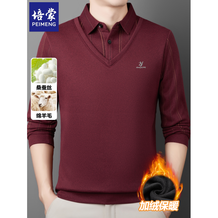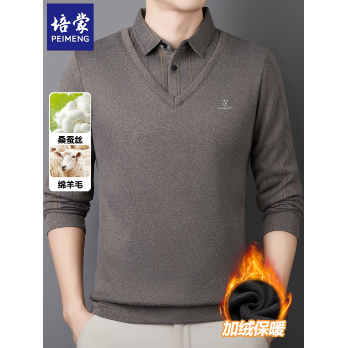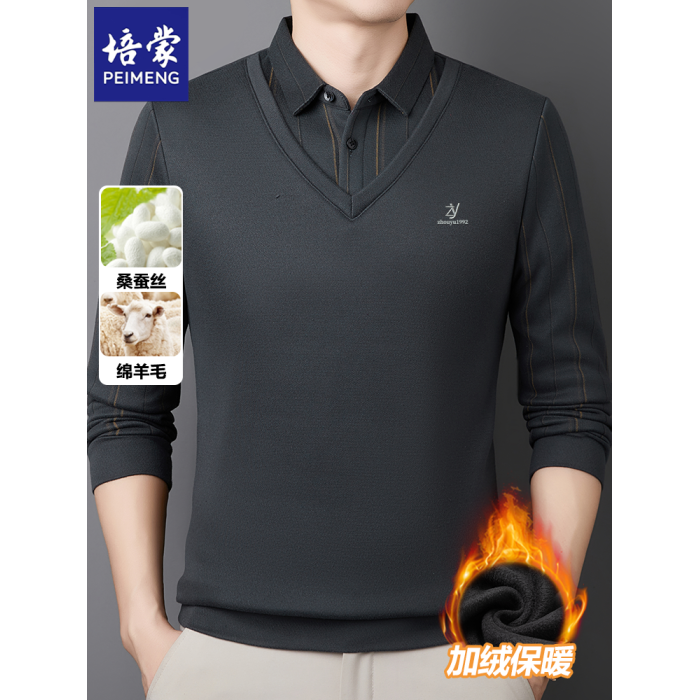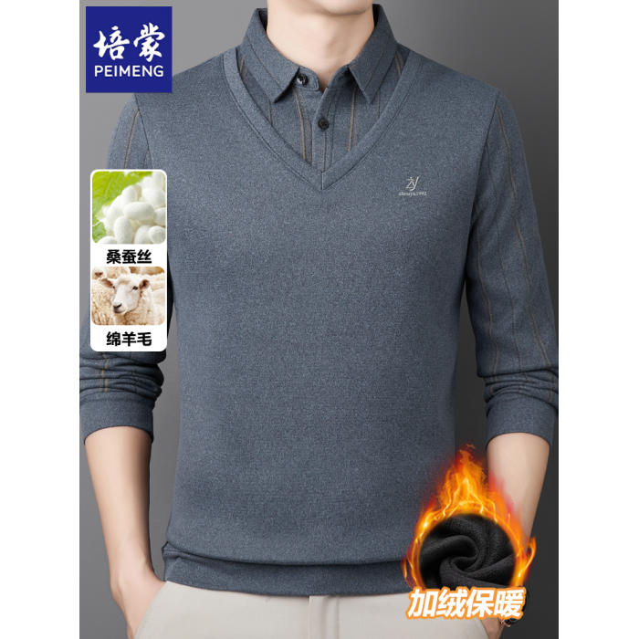 培矇2025年冬季新款假兩件保暖針織衫商務休閒加絨加厚男上衣毛衣