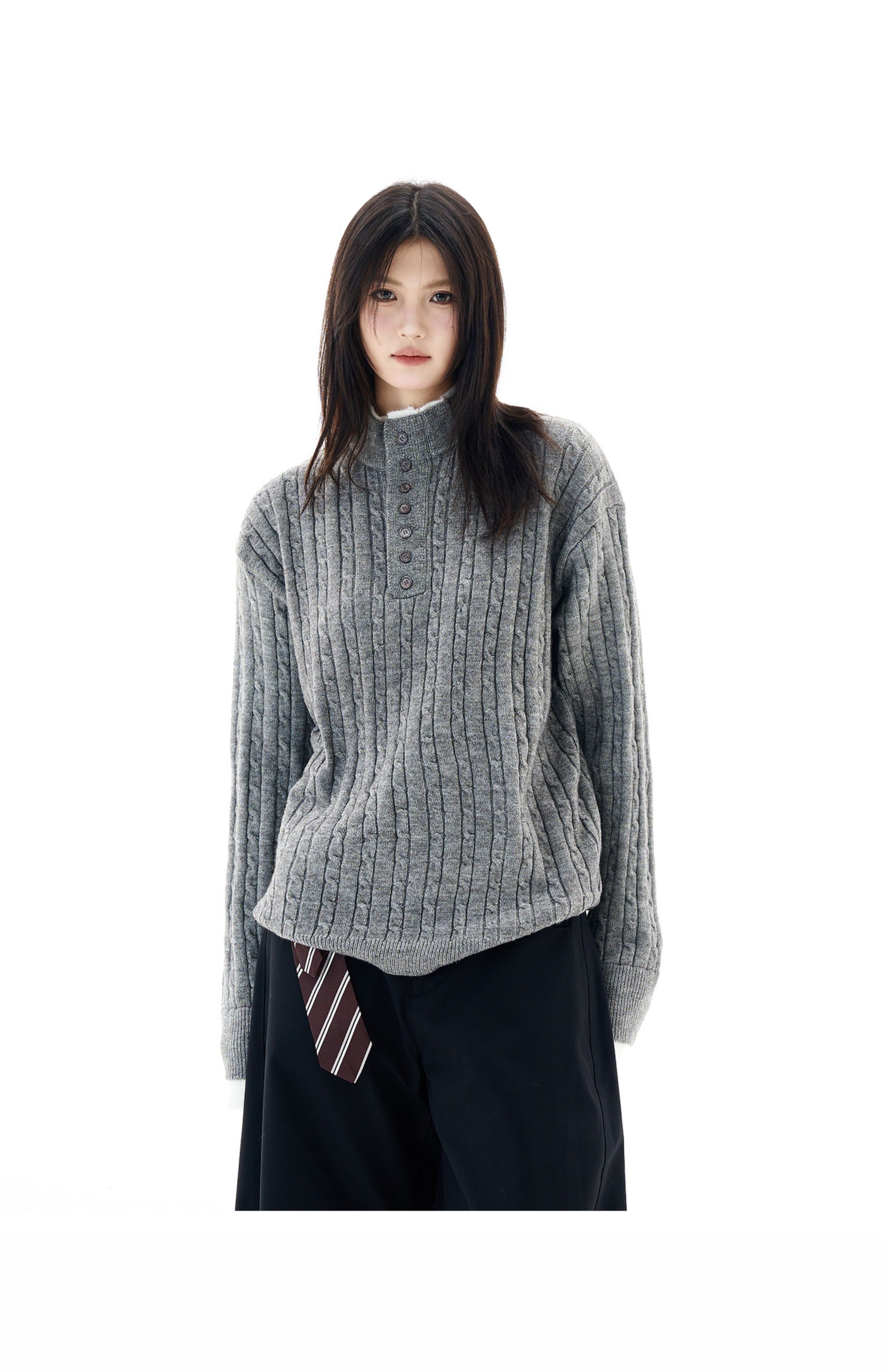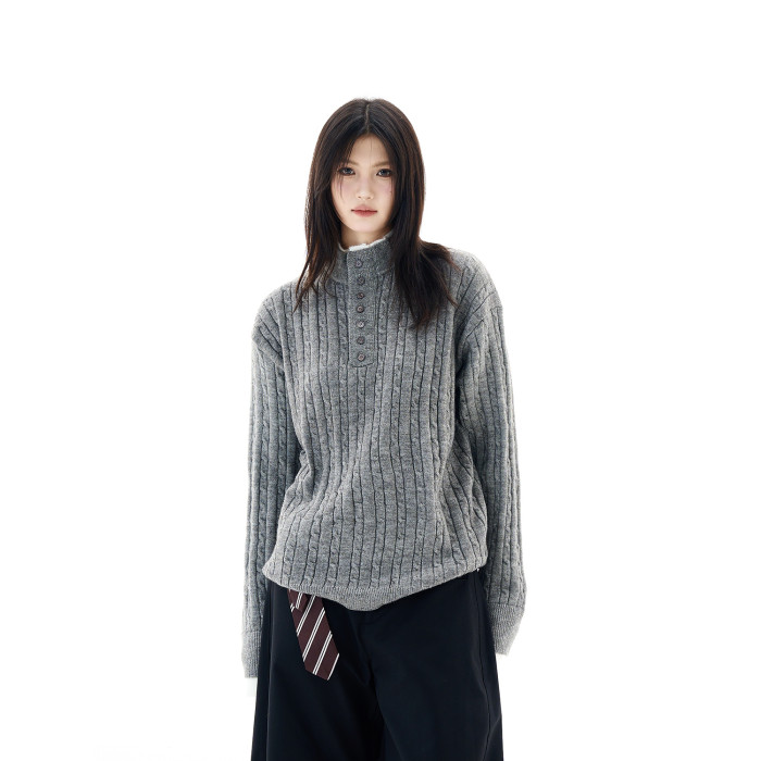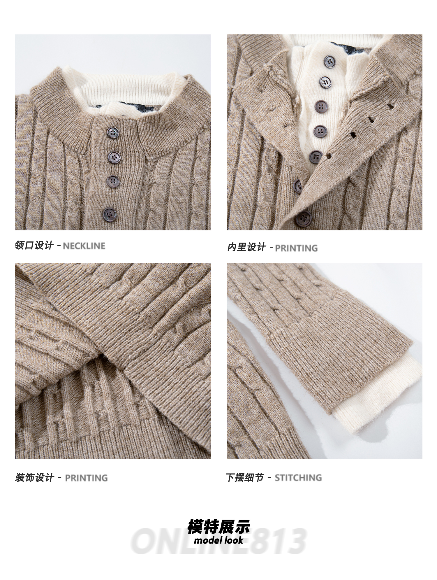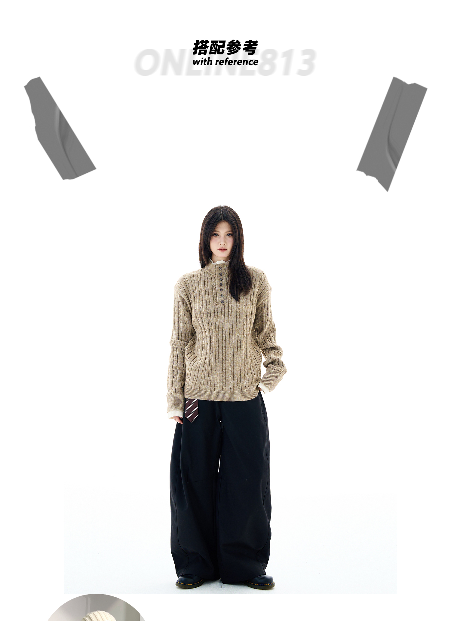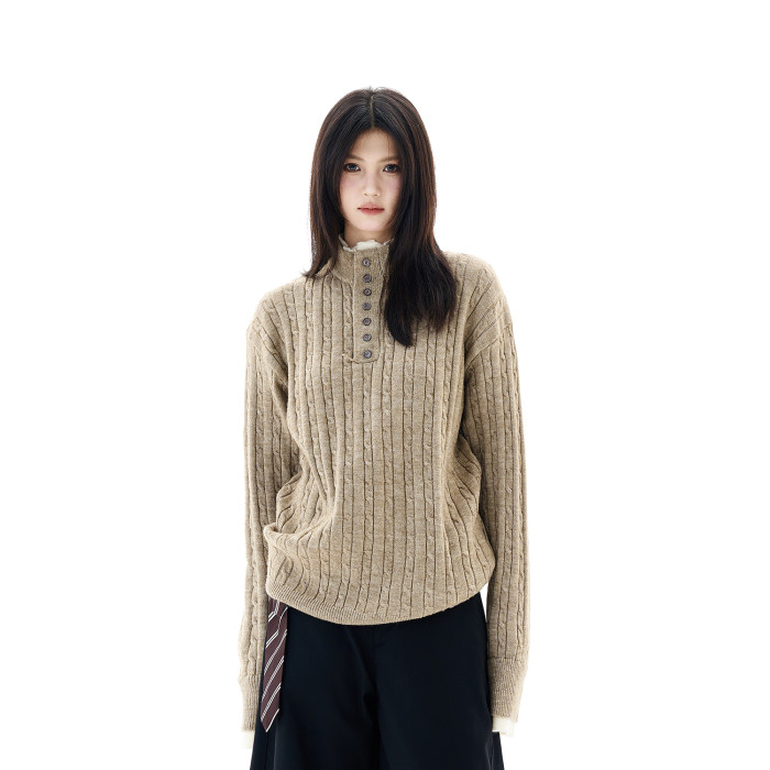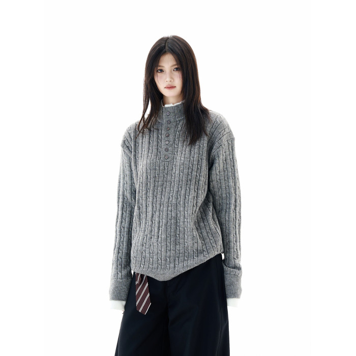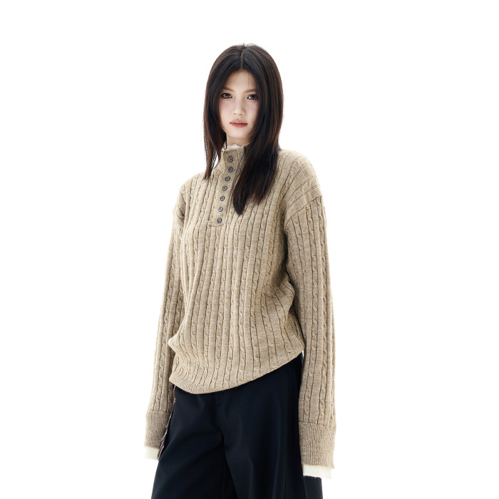 OEOT美式假兩件設計麻花亨利領毛衣男女慵懶高級感寬松套頭針織衫