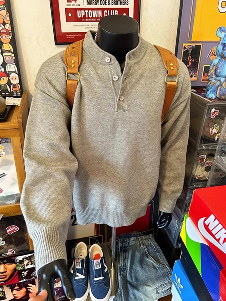 灰色美式亨利領針織毛衣男長袖慵懶風cleanfit內搭打底針織衫外套