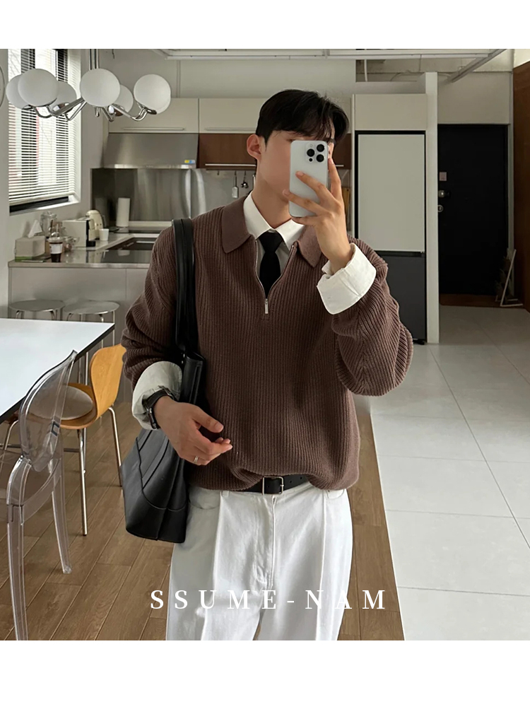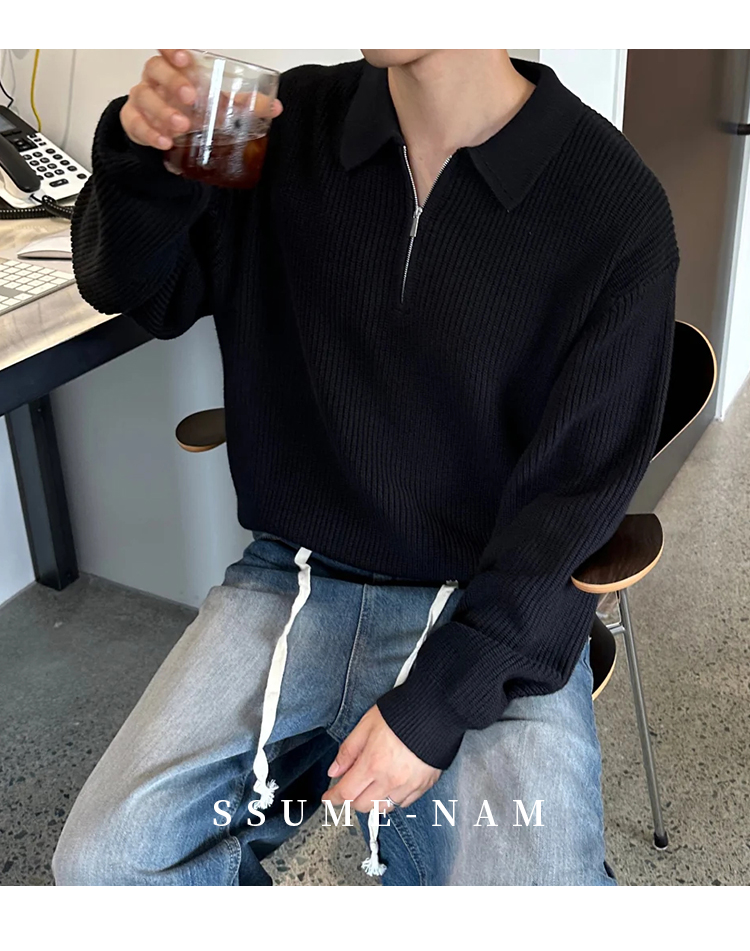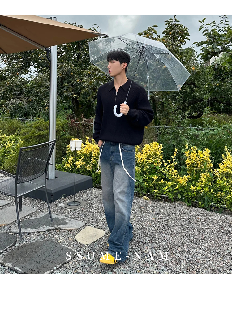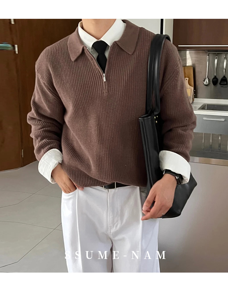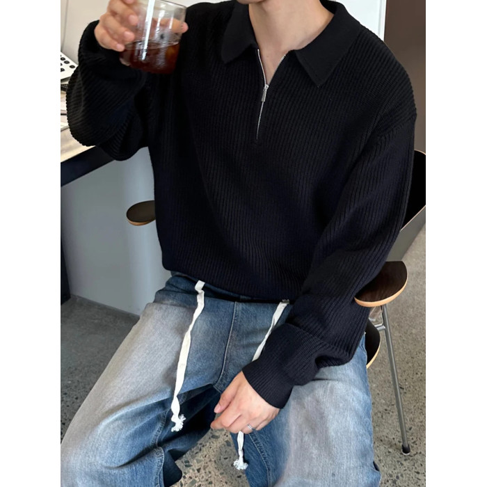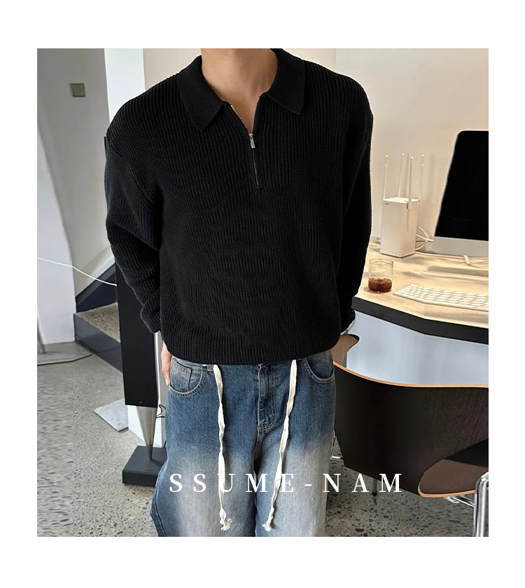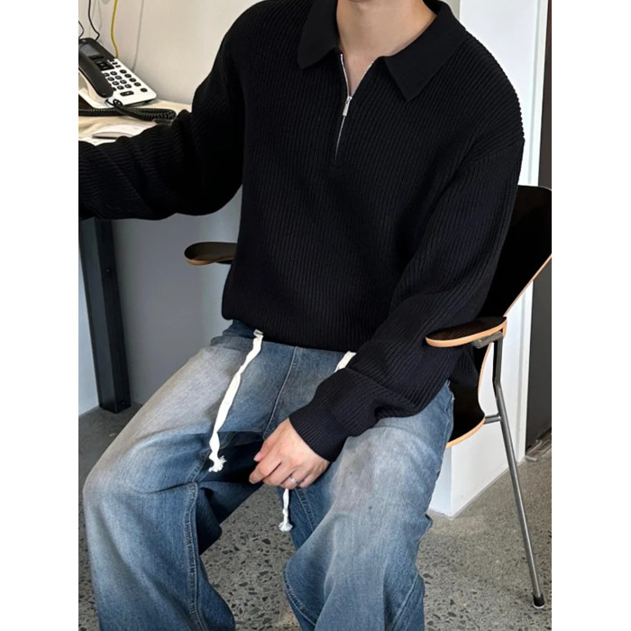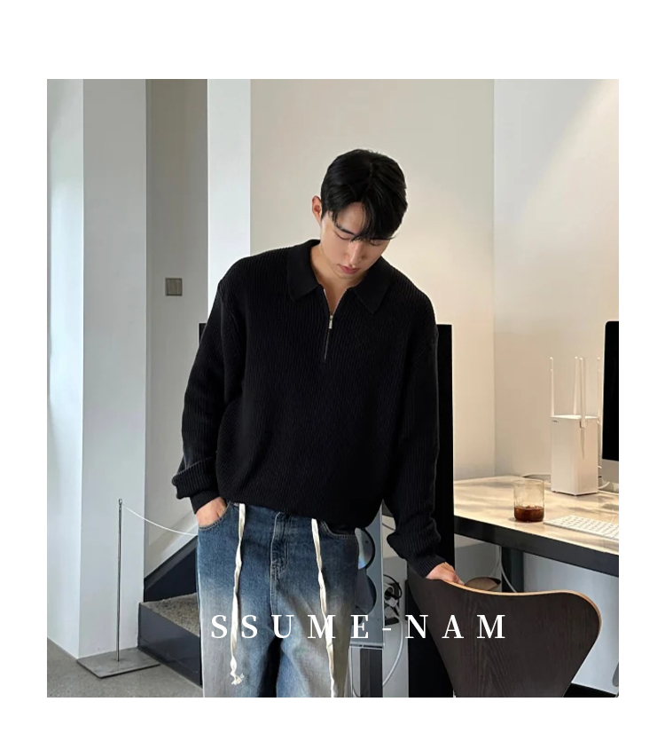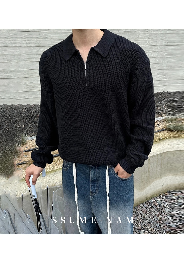 SSUMENAM「老錢風 半拉鍊」黑色POLO衫毛衣男秋季高級翻領針織衫