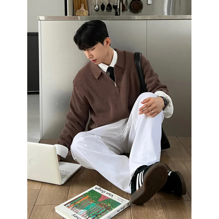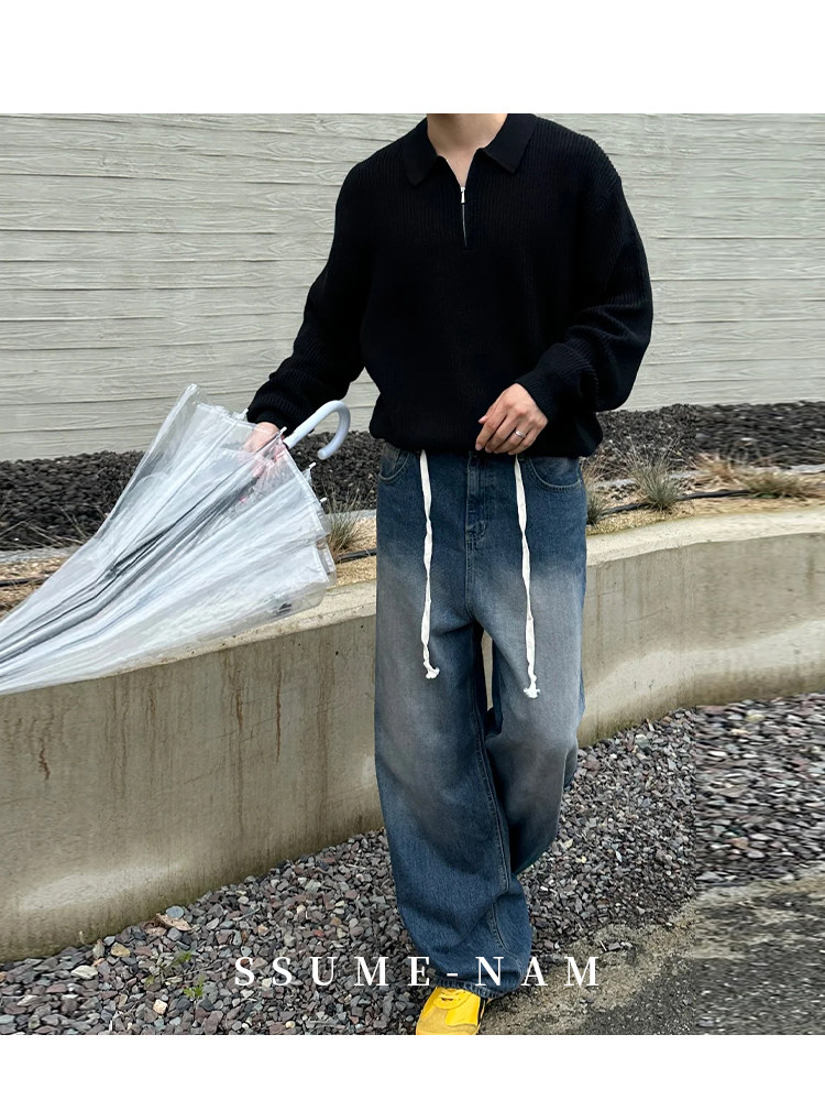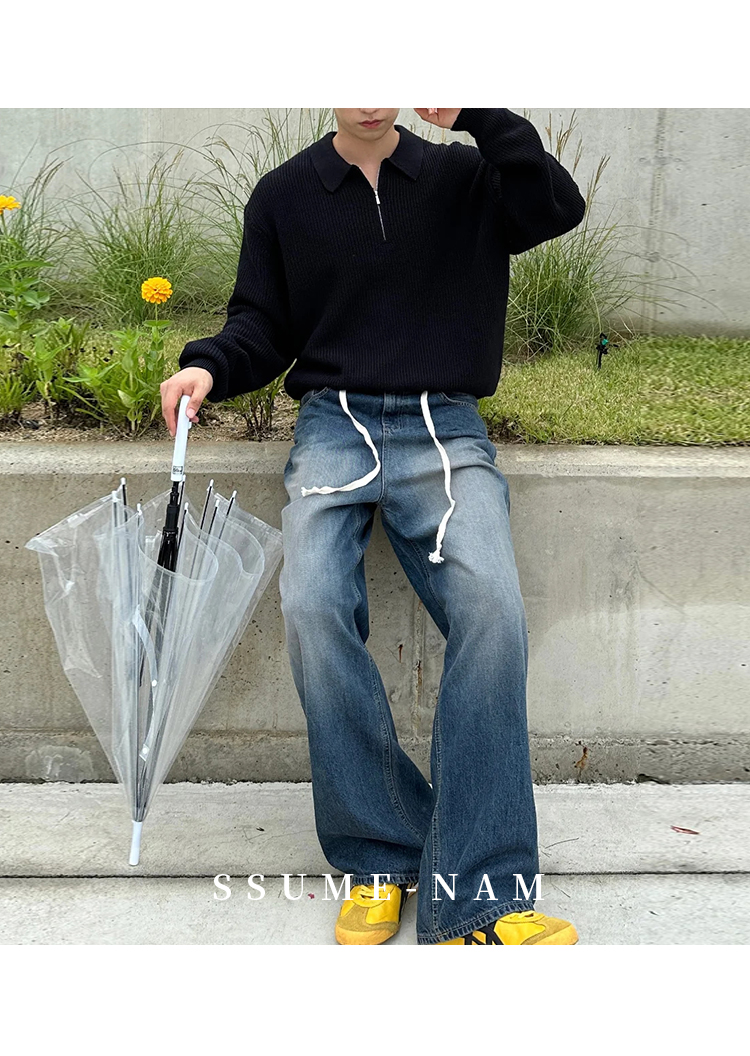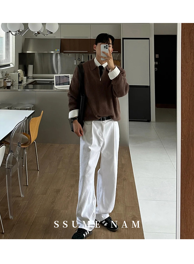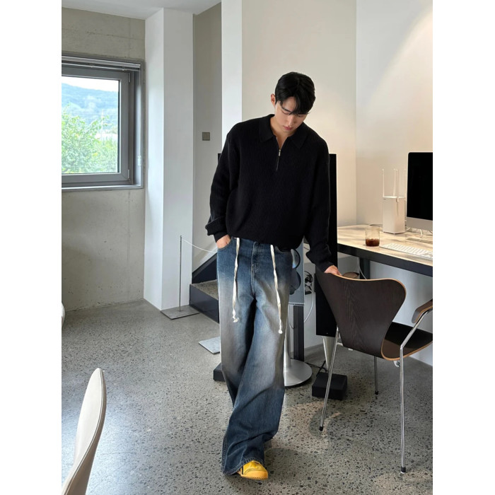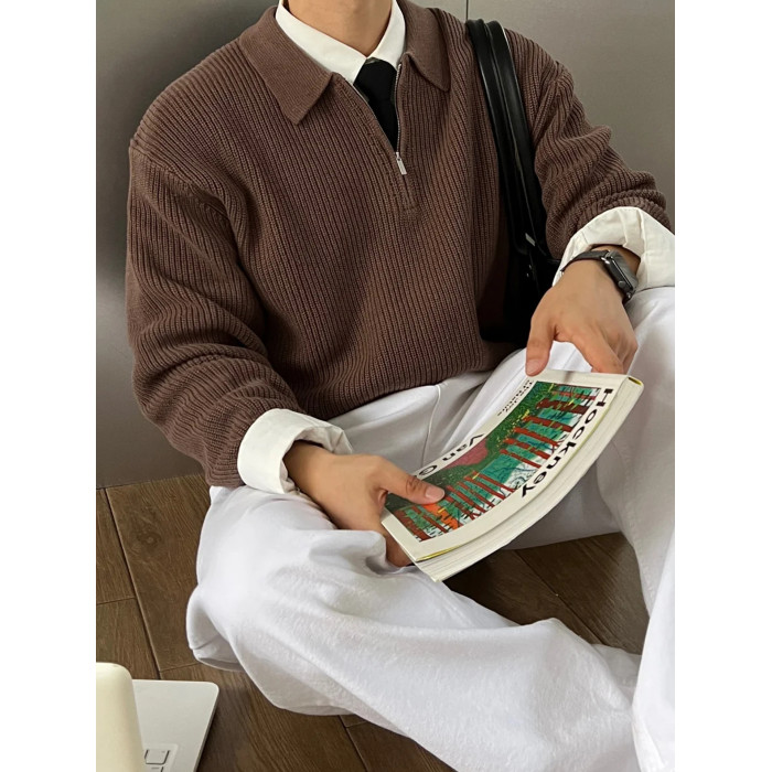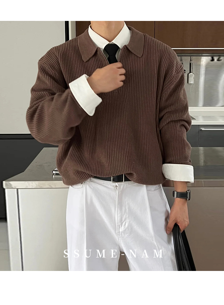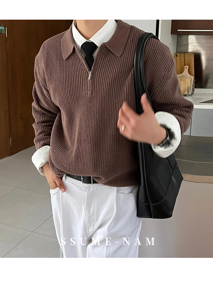 SSUMENAM「老錢風 半拉鍊」黑色POLO衫毛衣男秋季高級翻領針織衫