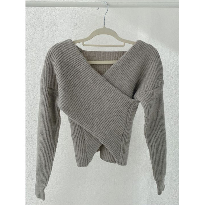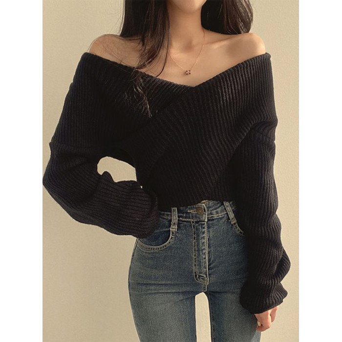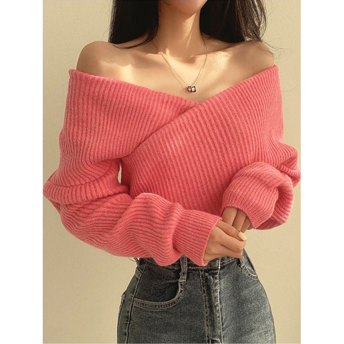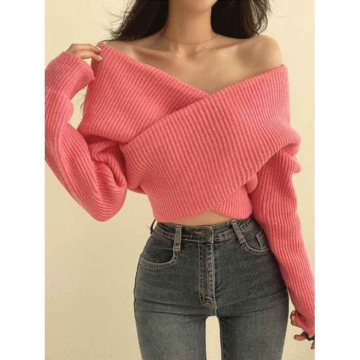 法式一字領交叉露肩針織毛衣女春秋新高級感絕美不規則長袖短上衣