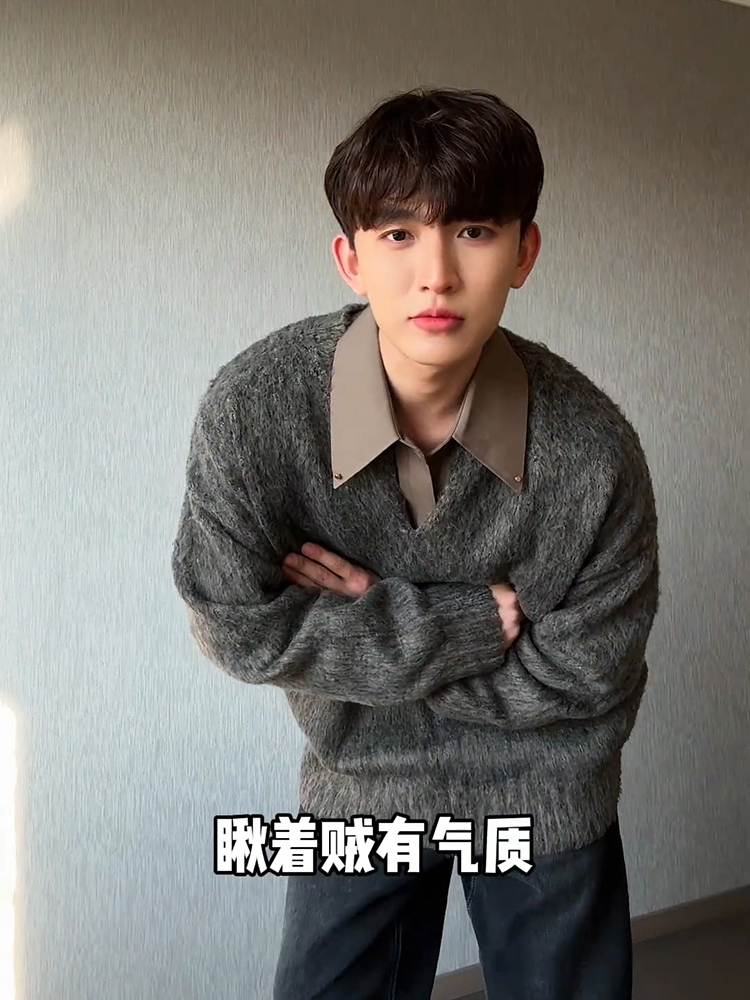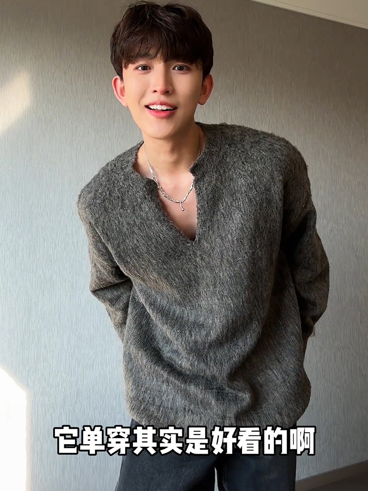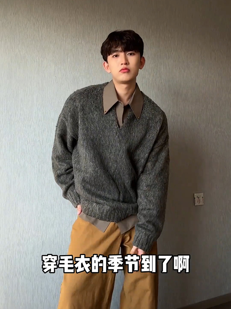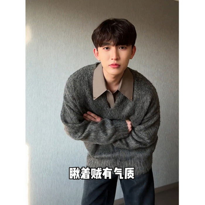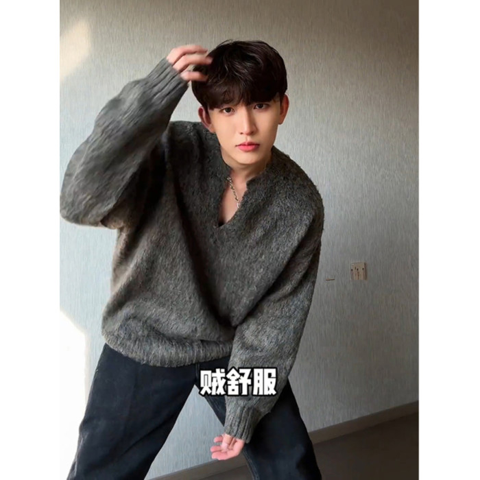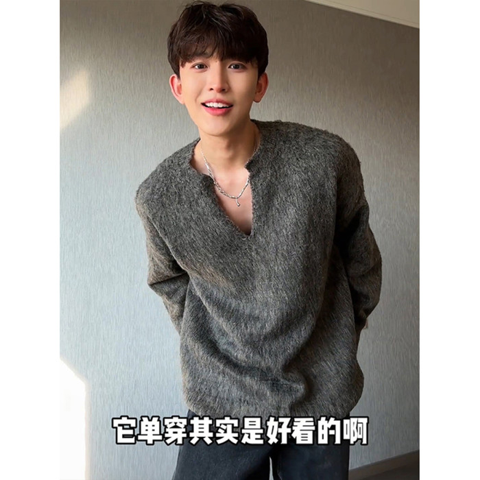 灰色馬海毛v領毛衣男秋冬季慵懶風韓系穿搭針織衫痞帥高級感外套