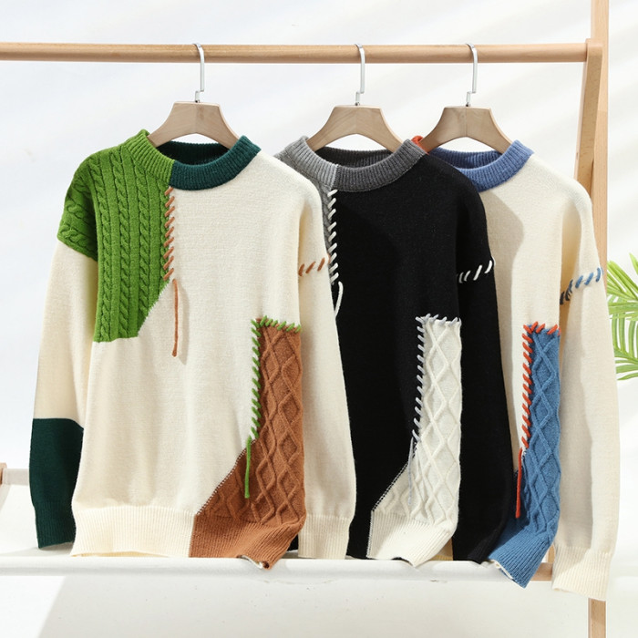 拼色圓領毛衣男秋冬季寬松潮牌保暖針織衫青少年慵懶風休閒打底衫
