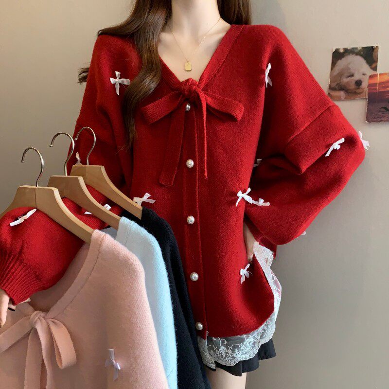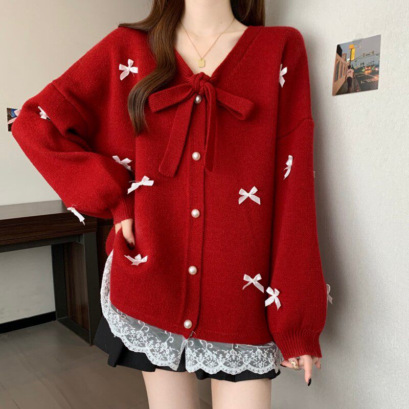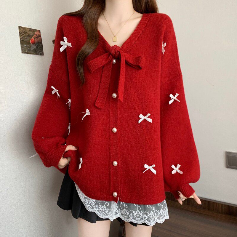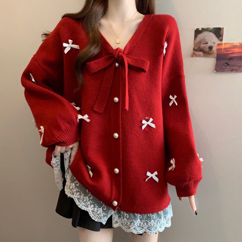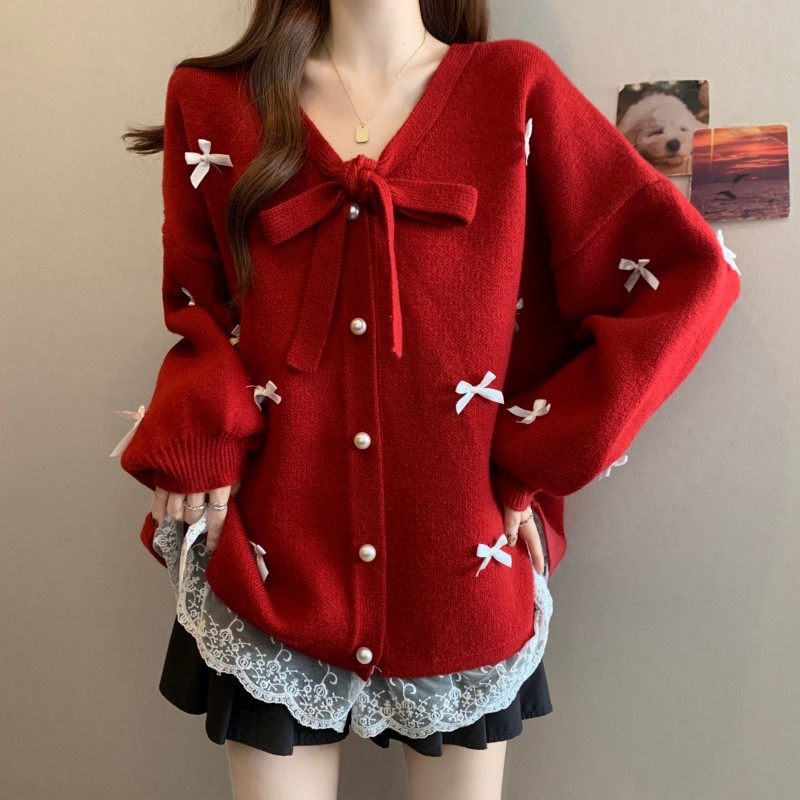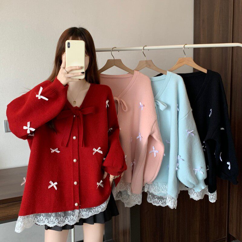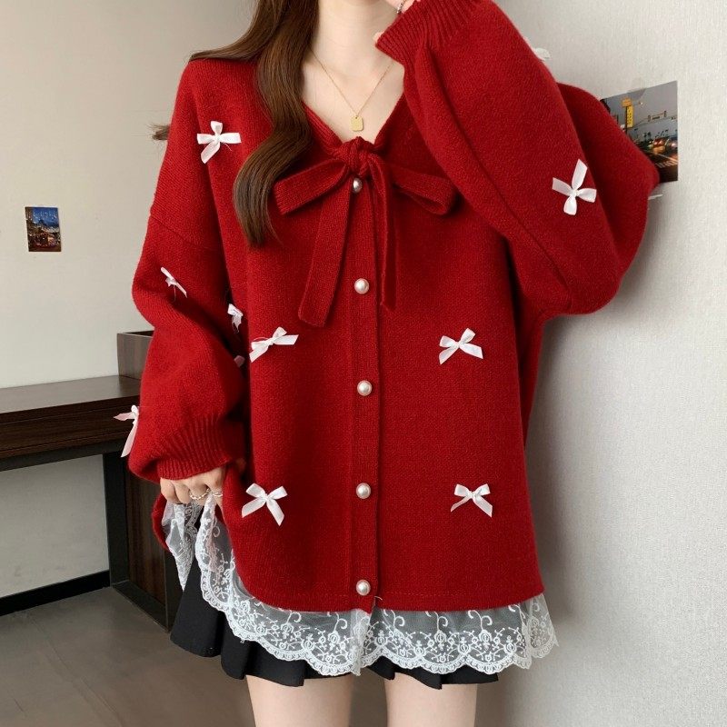 假兩件紅色蝴蝶結針織開衫毛衣外套女2025秋冬新款胖mm中長款上衣