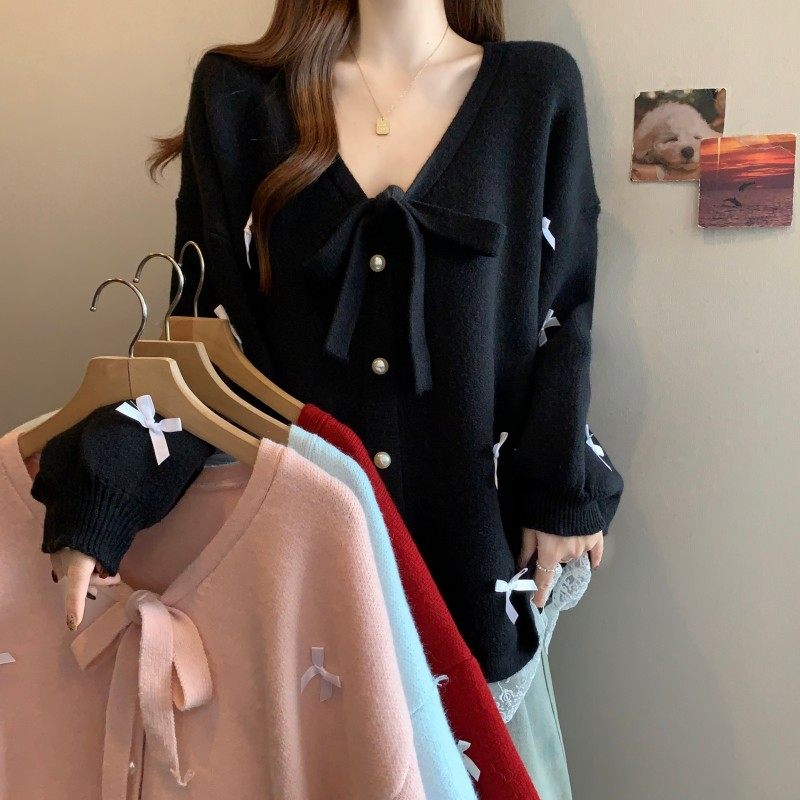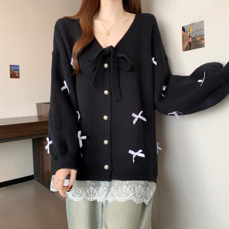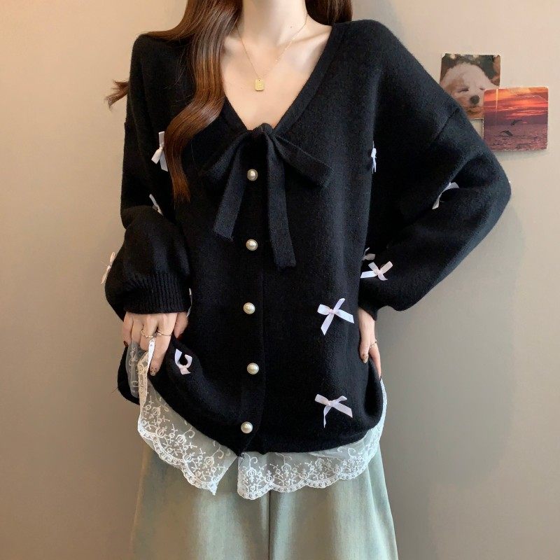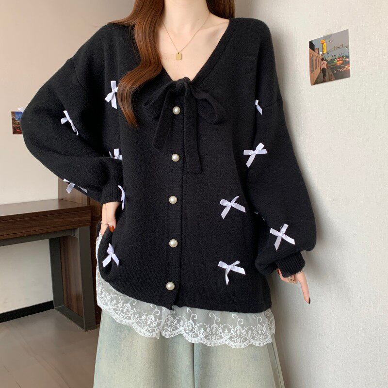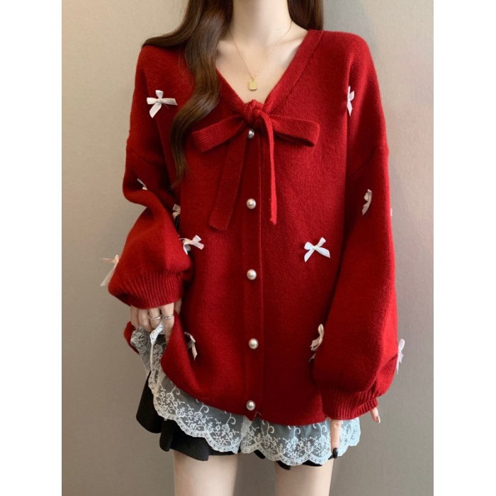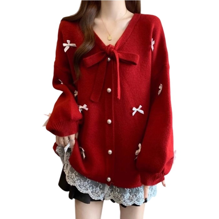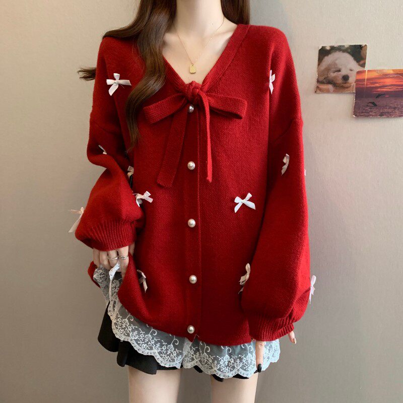 假兩件紅色蝴蝶結針織開衫毛衣外套女2025秋冬新款胖mm中長款上衣