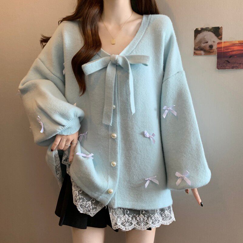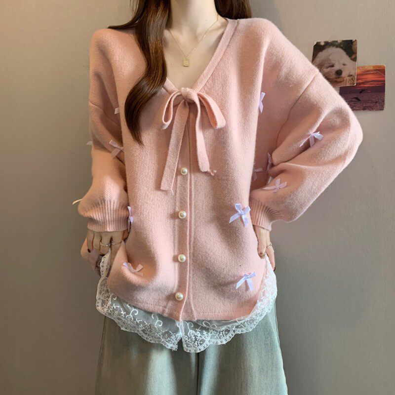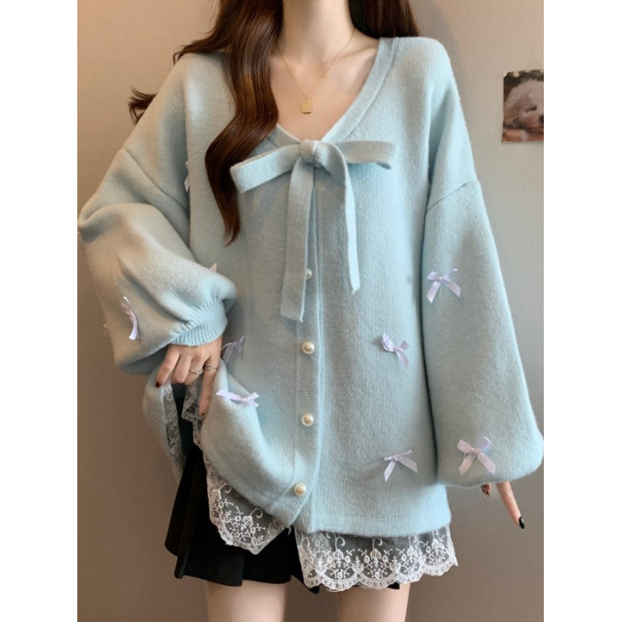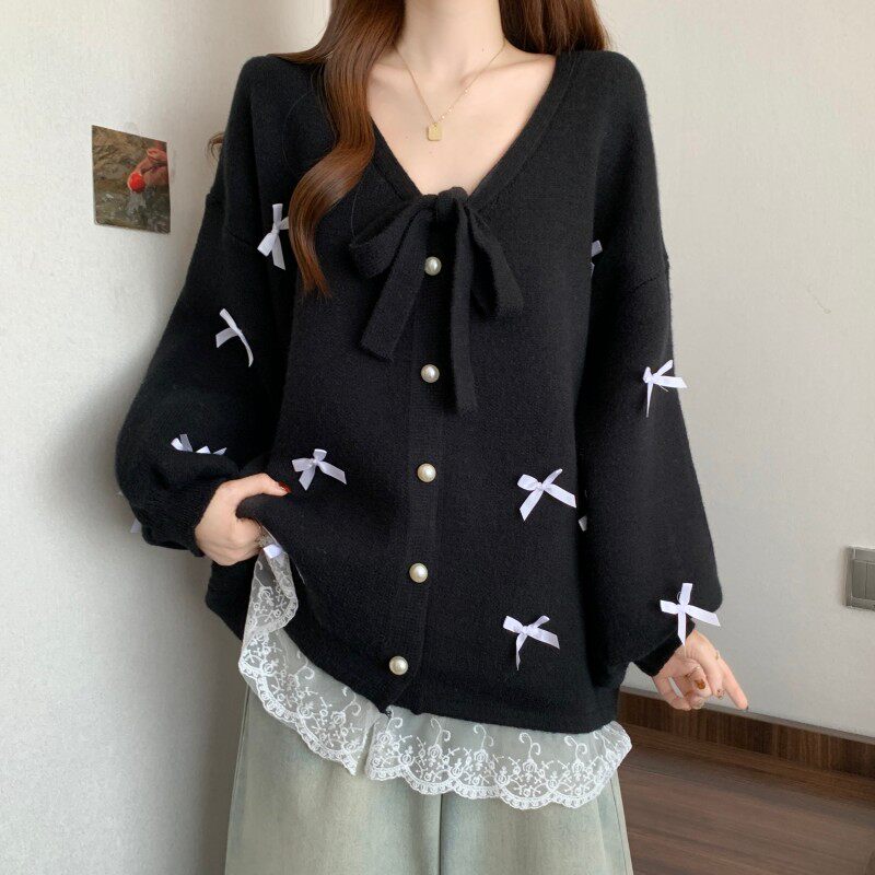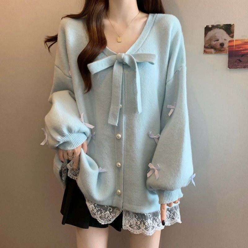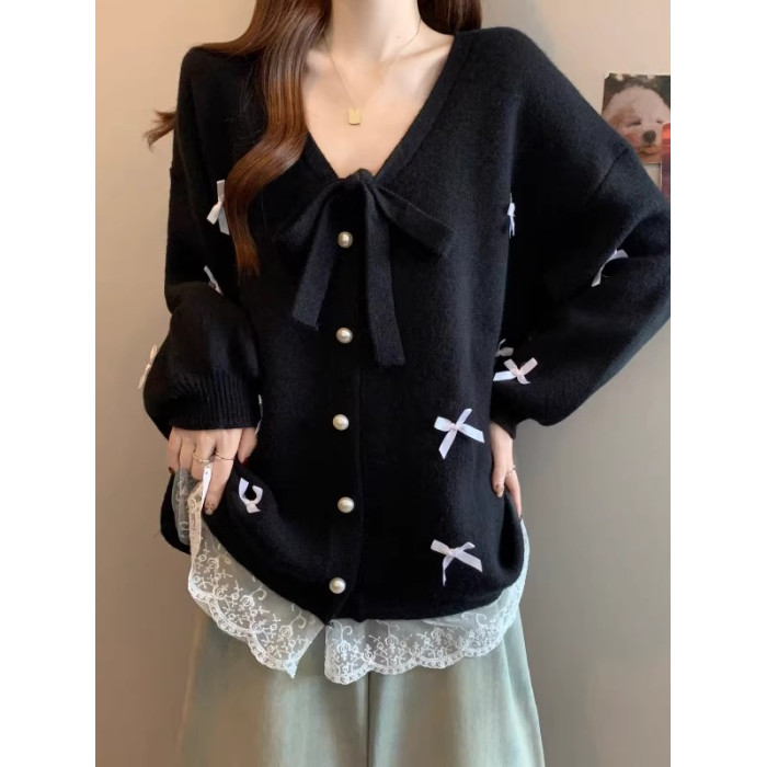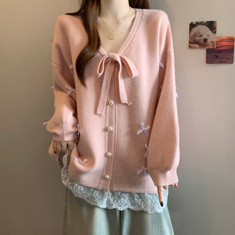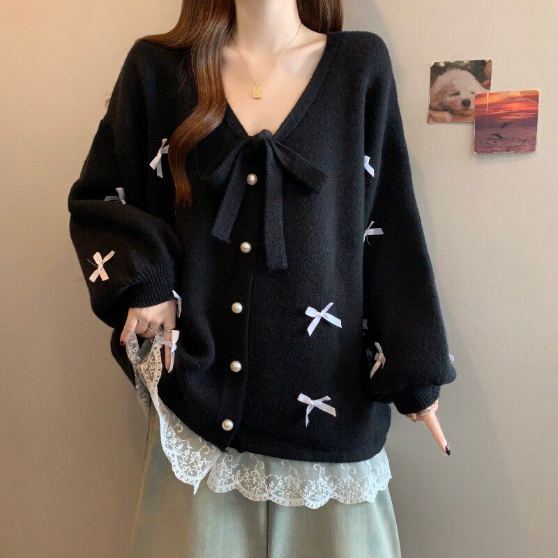 假兩件紅色蝴蝶結針織開衫毛衣外套女2025秋冬新款胖mm中長款上衣