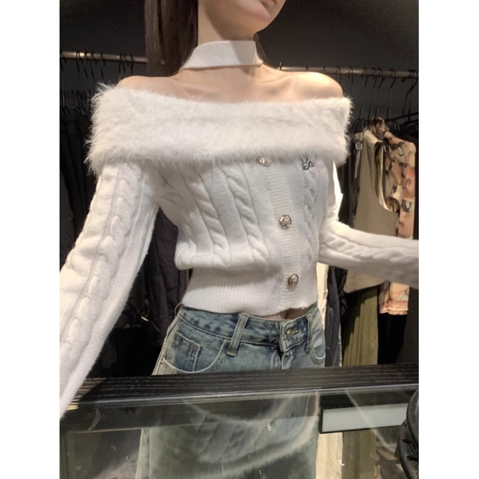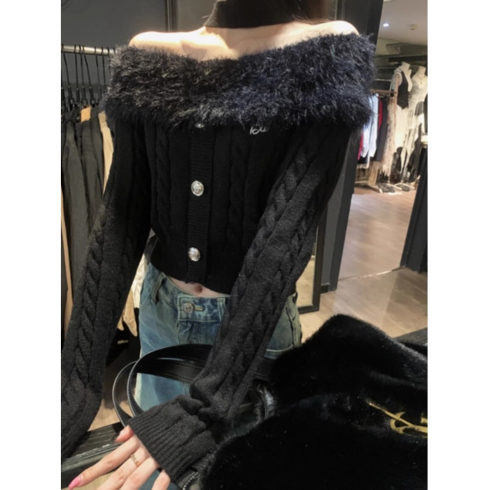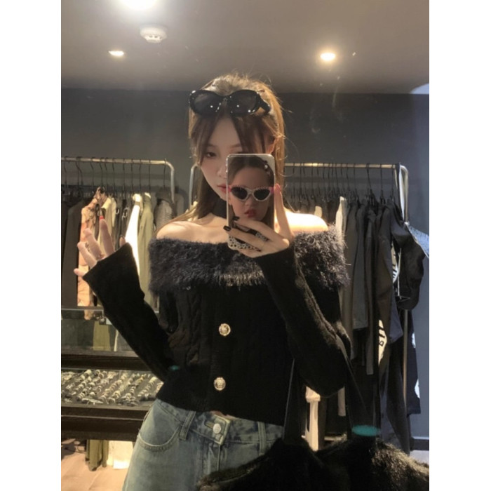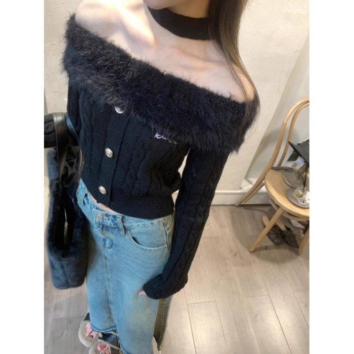 設計感毛領一字肩t恤女2025冬季韓系性感修身辣妹露肩針織衫上衣