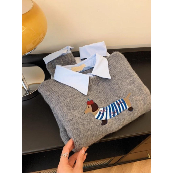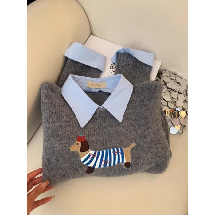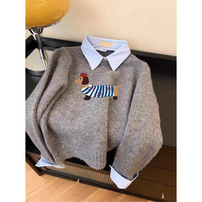 小狗卡通軟糯灰色假兩件襯衫領針織衫女上衣2025秋新款翻領毛衣冬