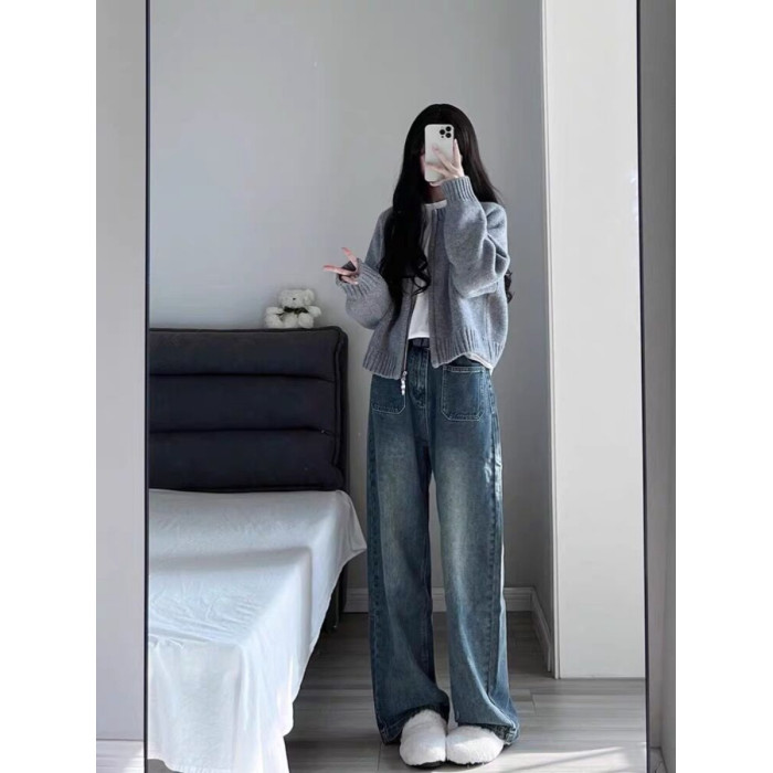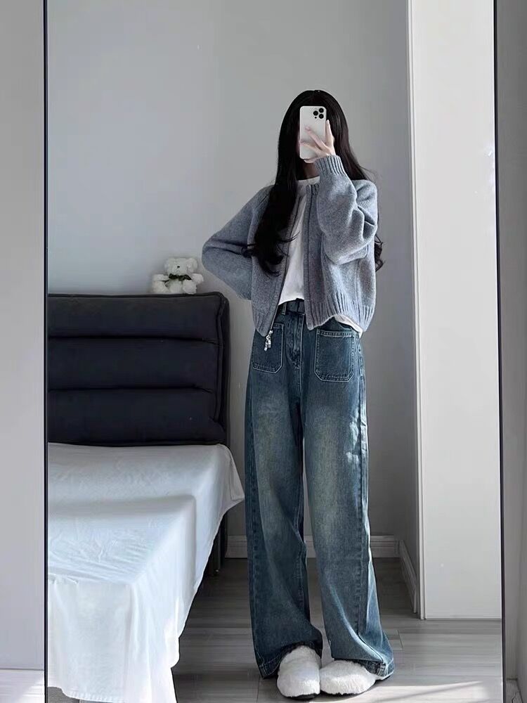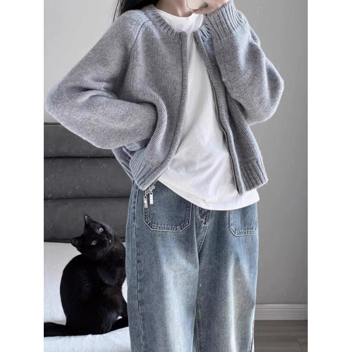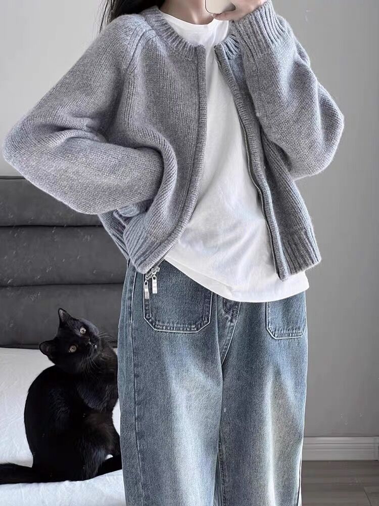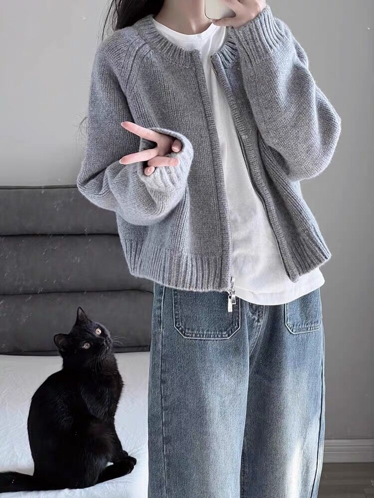 灰色短款毛衣外套女2025秋冬裝新款寬松加厚拉鍊開衫長袖針織上衣