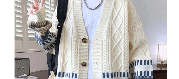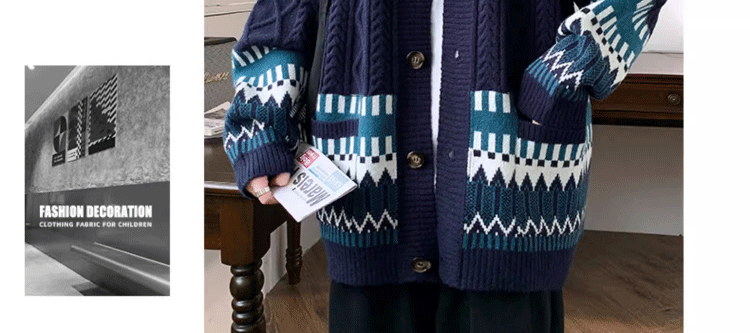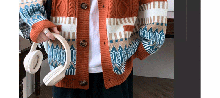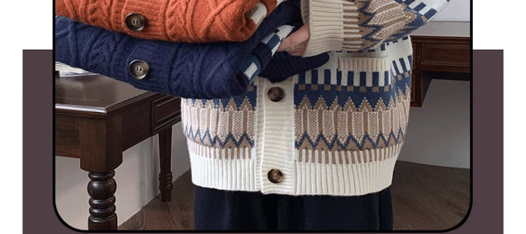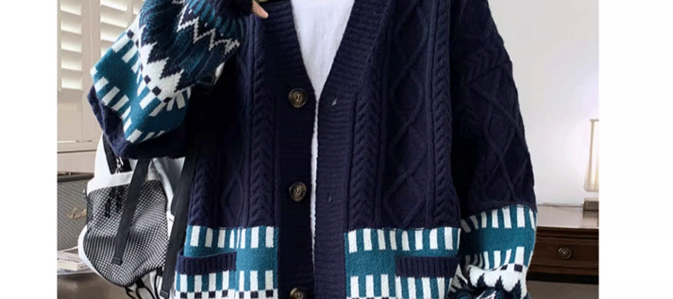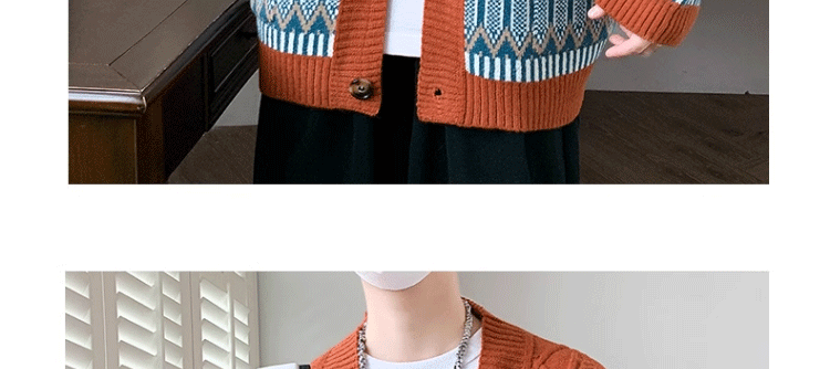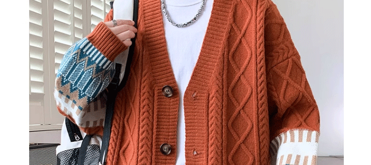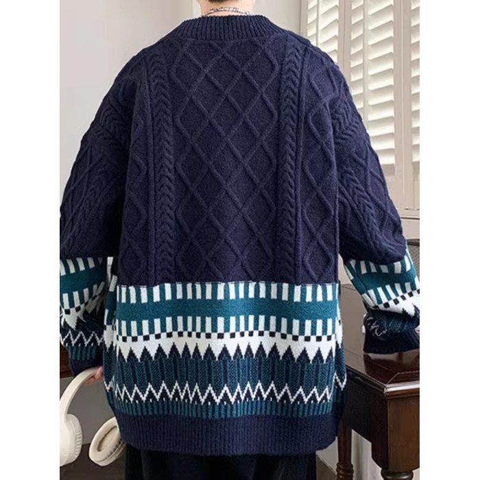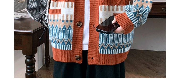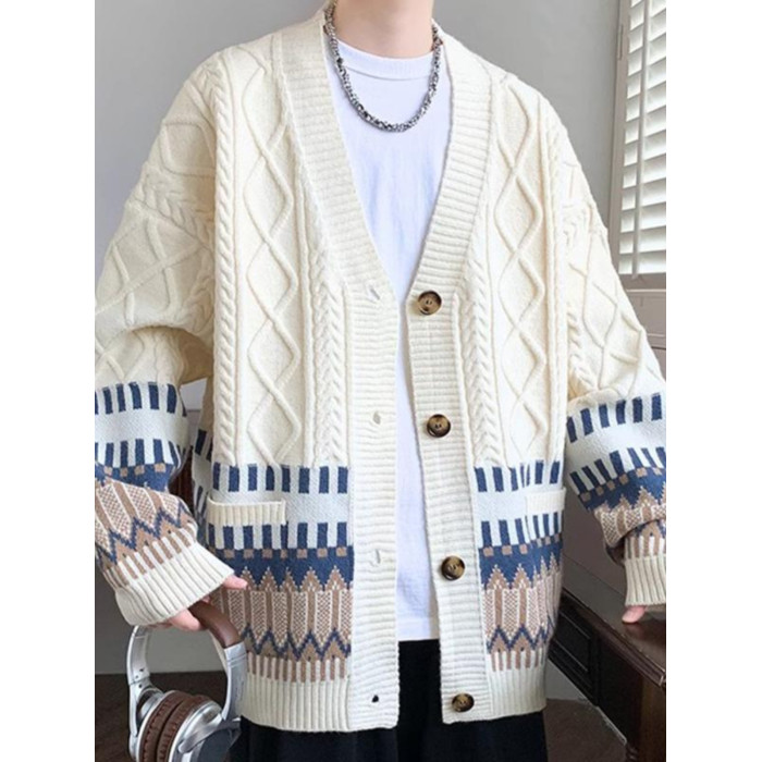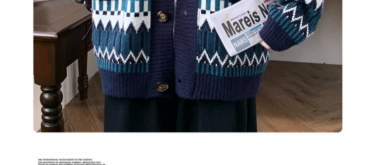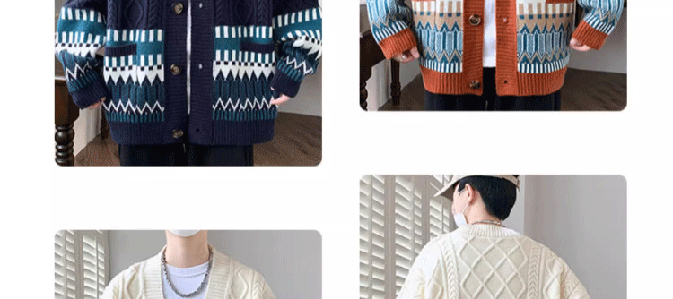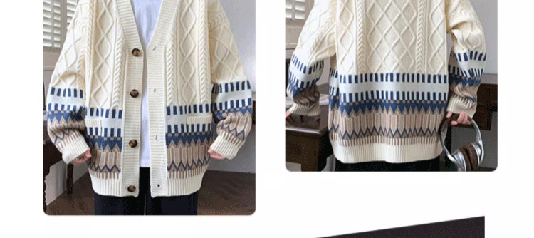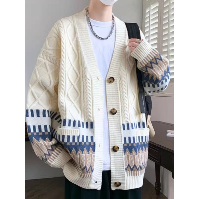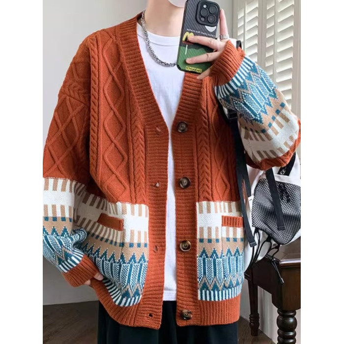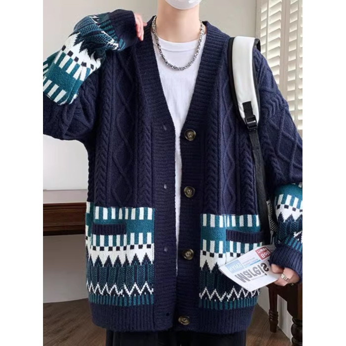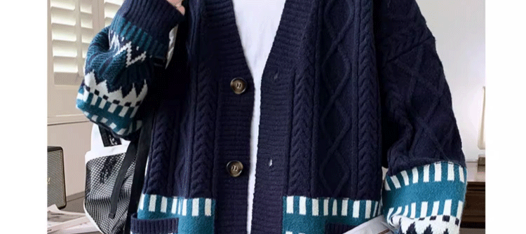 日系復古拼接菱格V領開衫毛衣男寬松痞帥潮牌休閒針織衫情侶外套