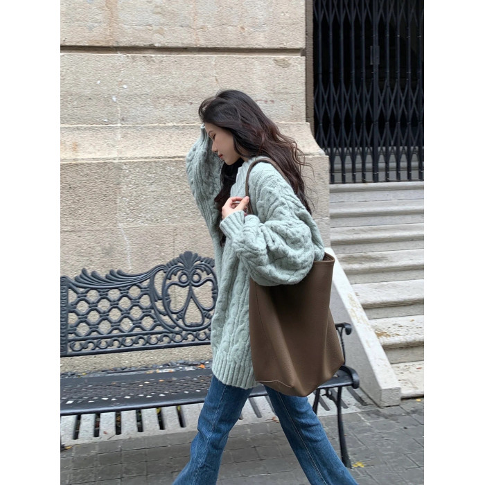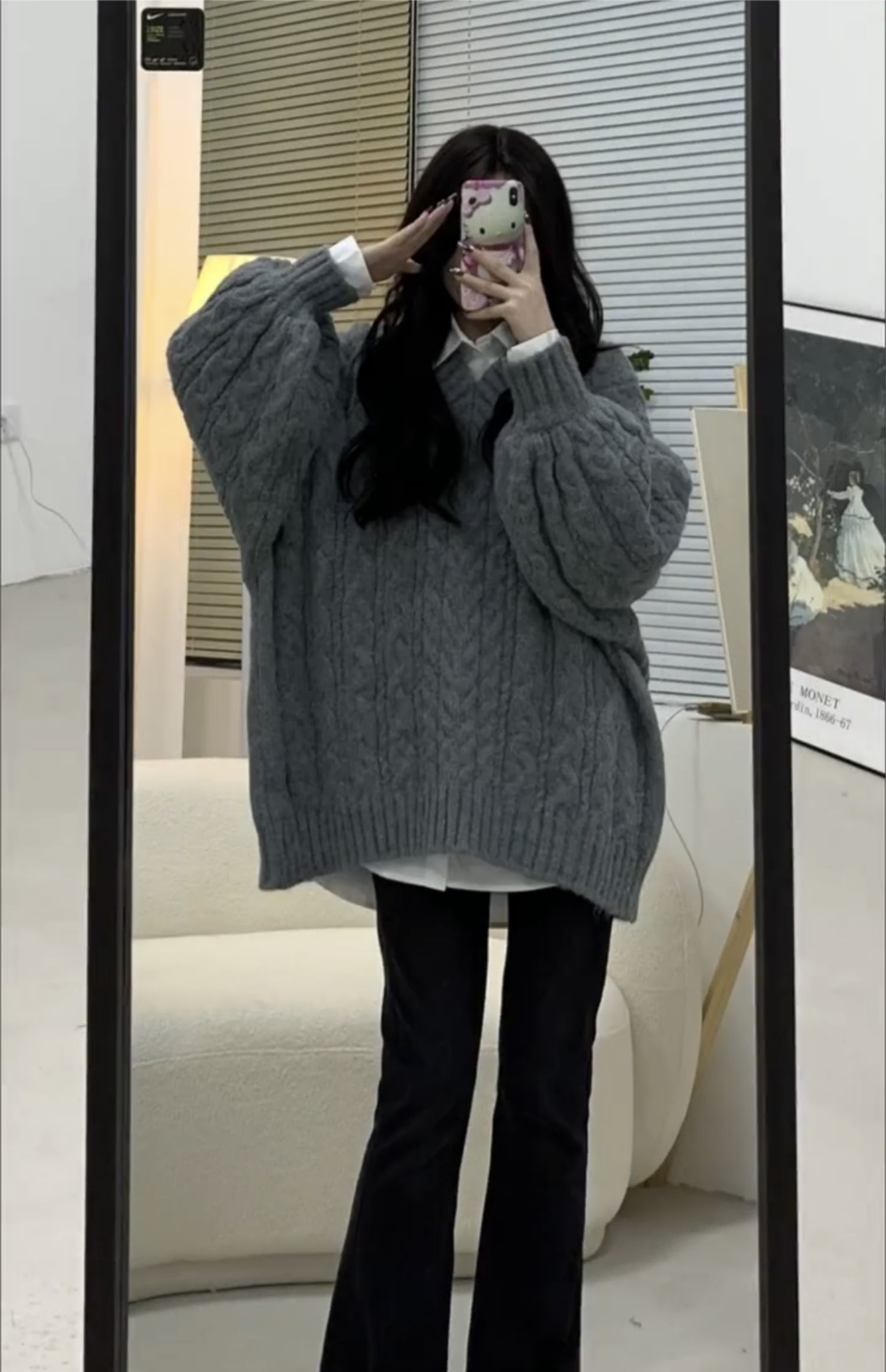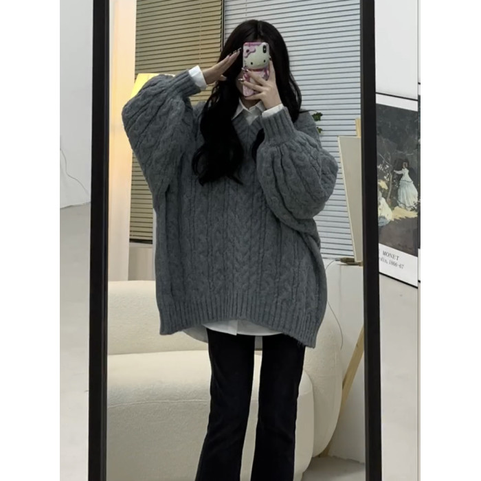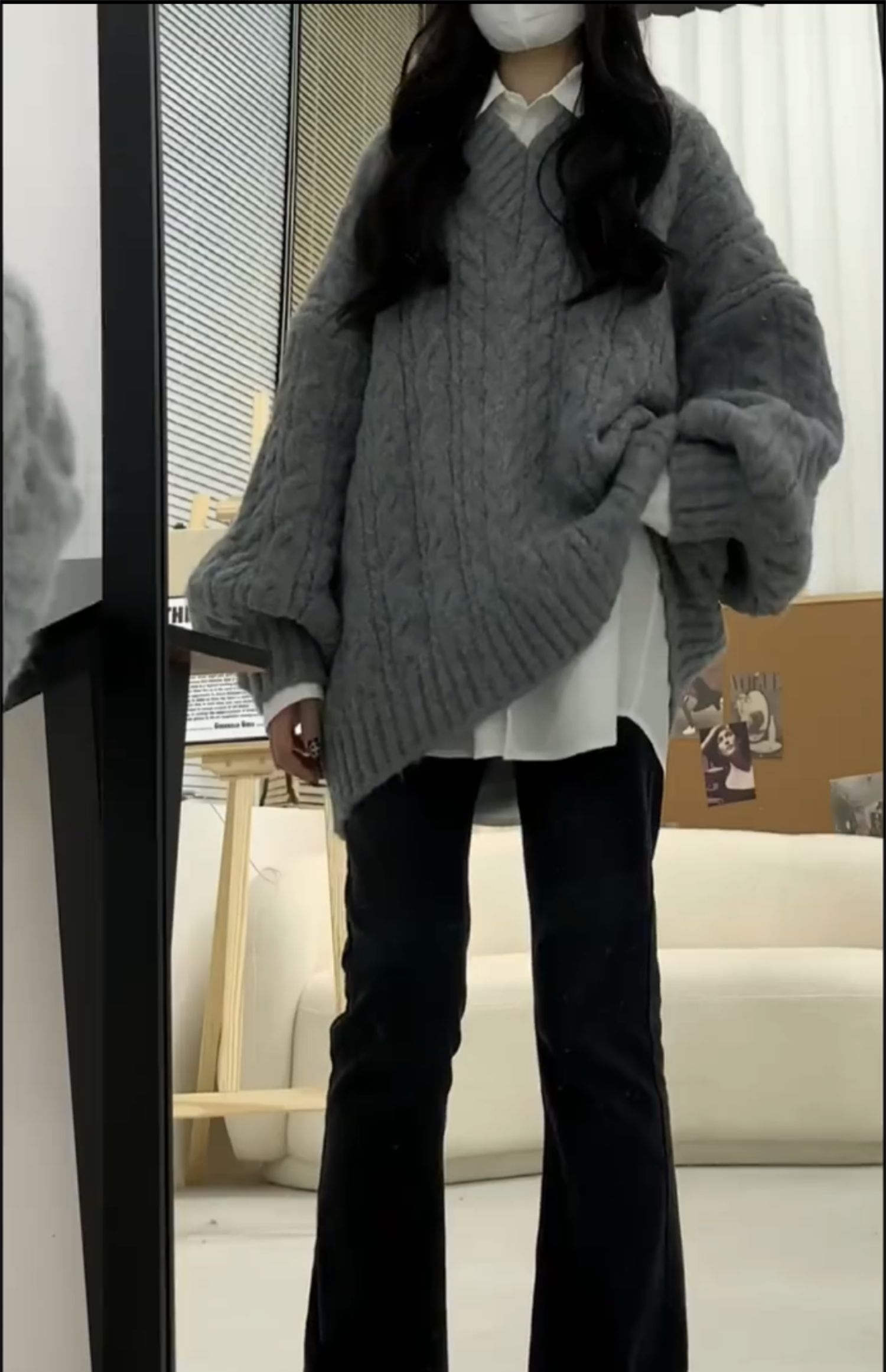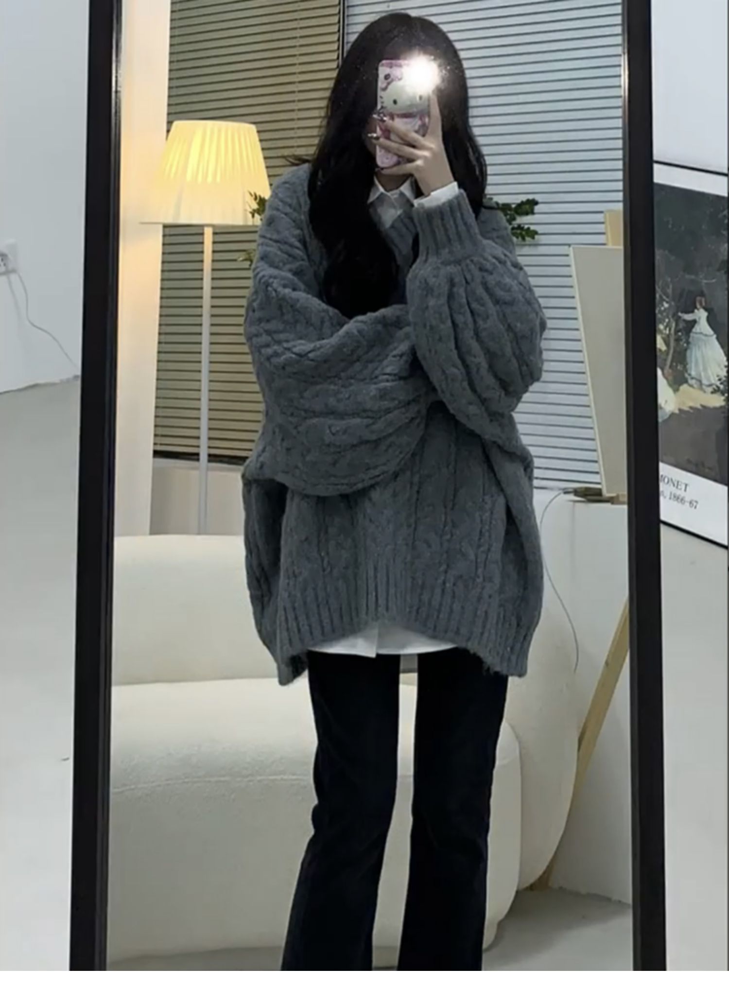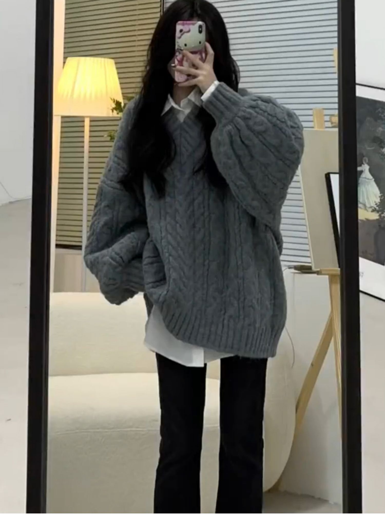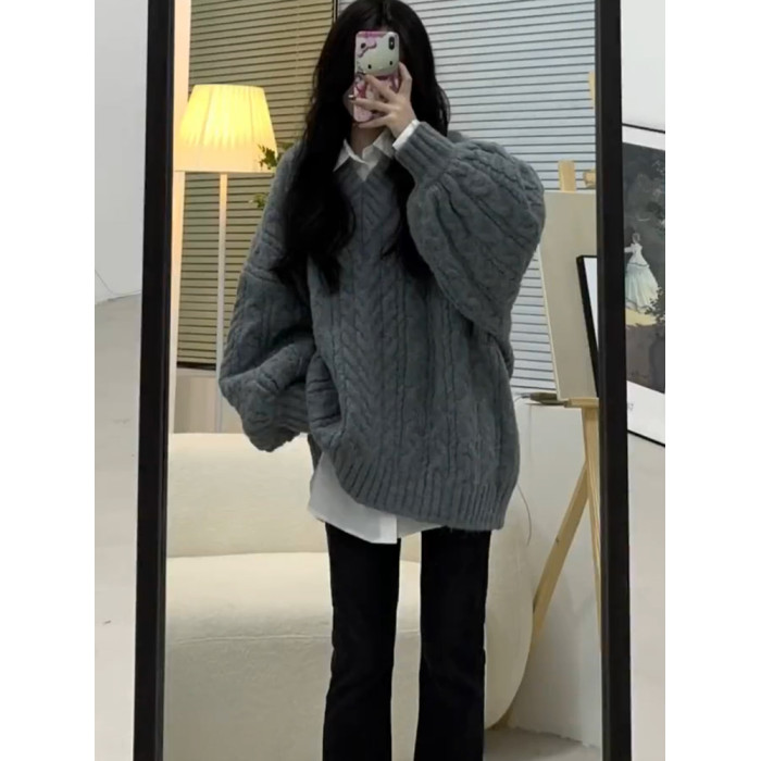 V領燈籠袖灰色毛衣女寬松外穿遮臀部慵懶風秋冬新款加厚韓系針織
