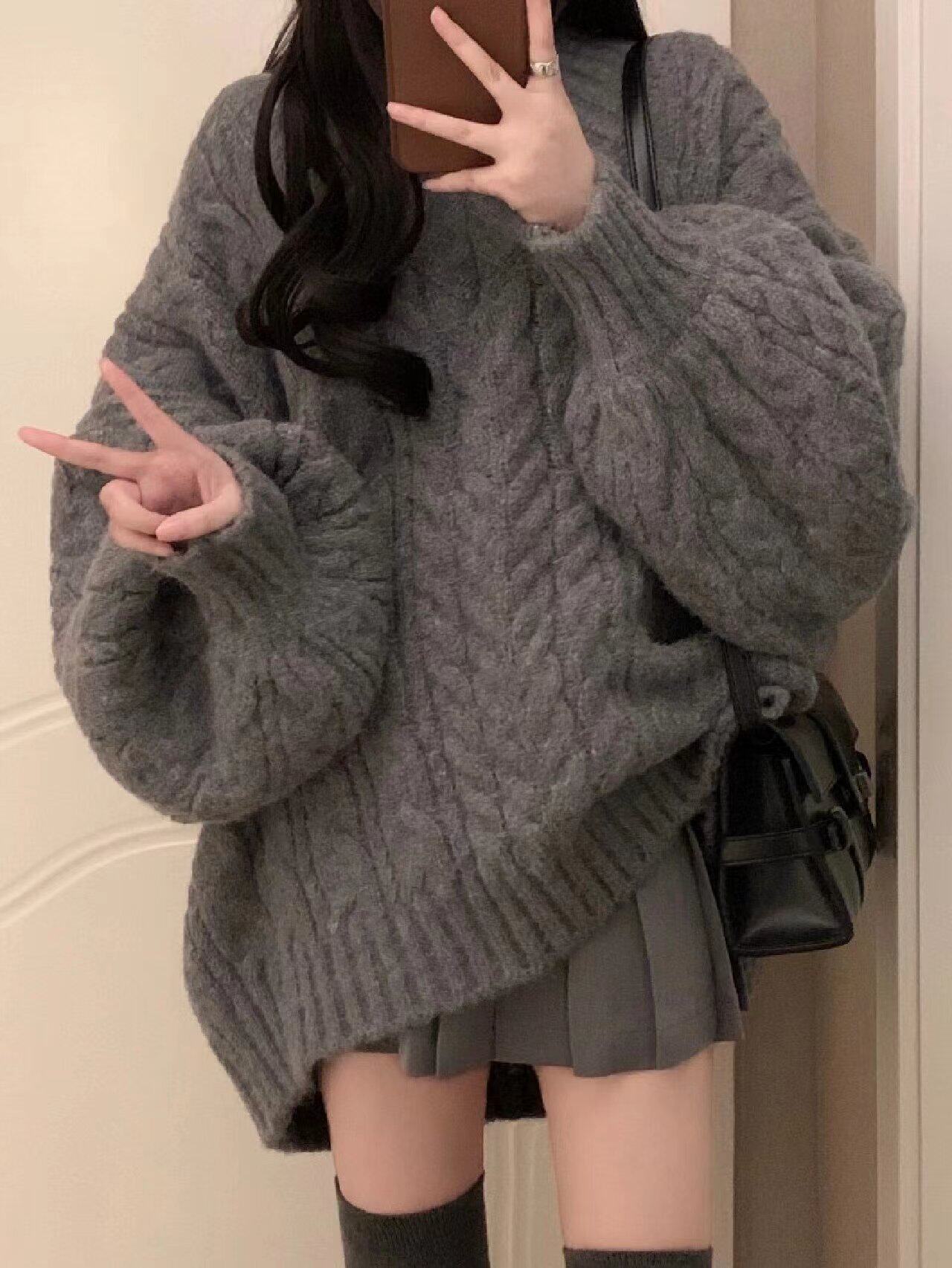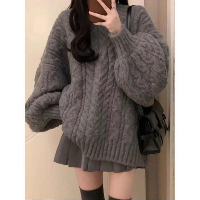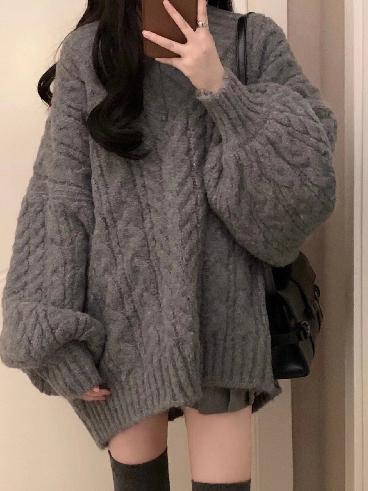 灰色麻花v領毛衣女秋冬2023新款爆款中長款毛衣裙慵懶風寬松上衣