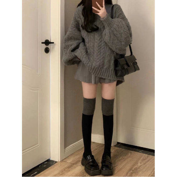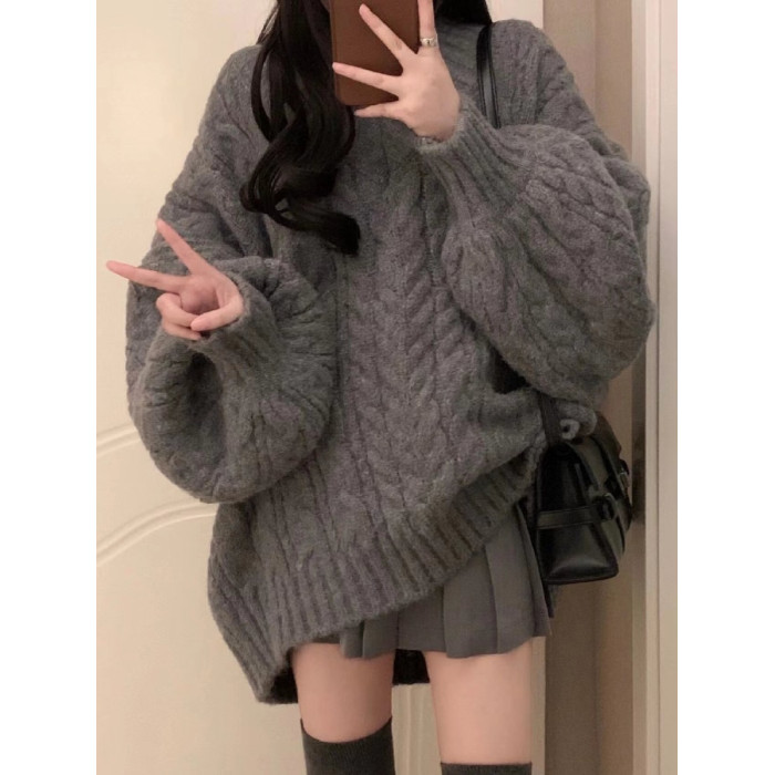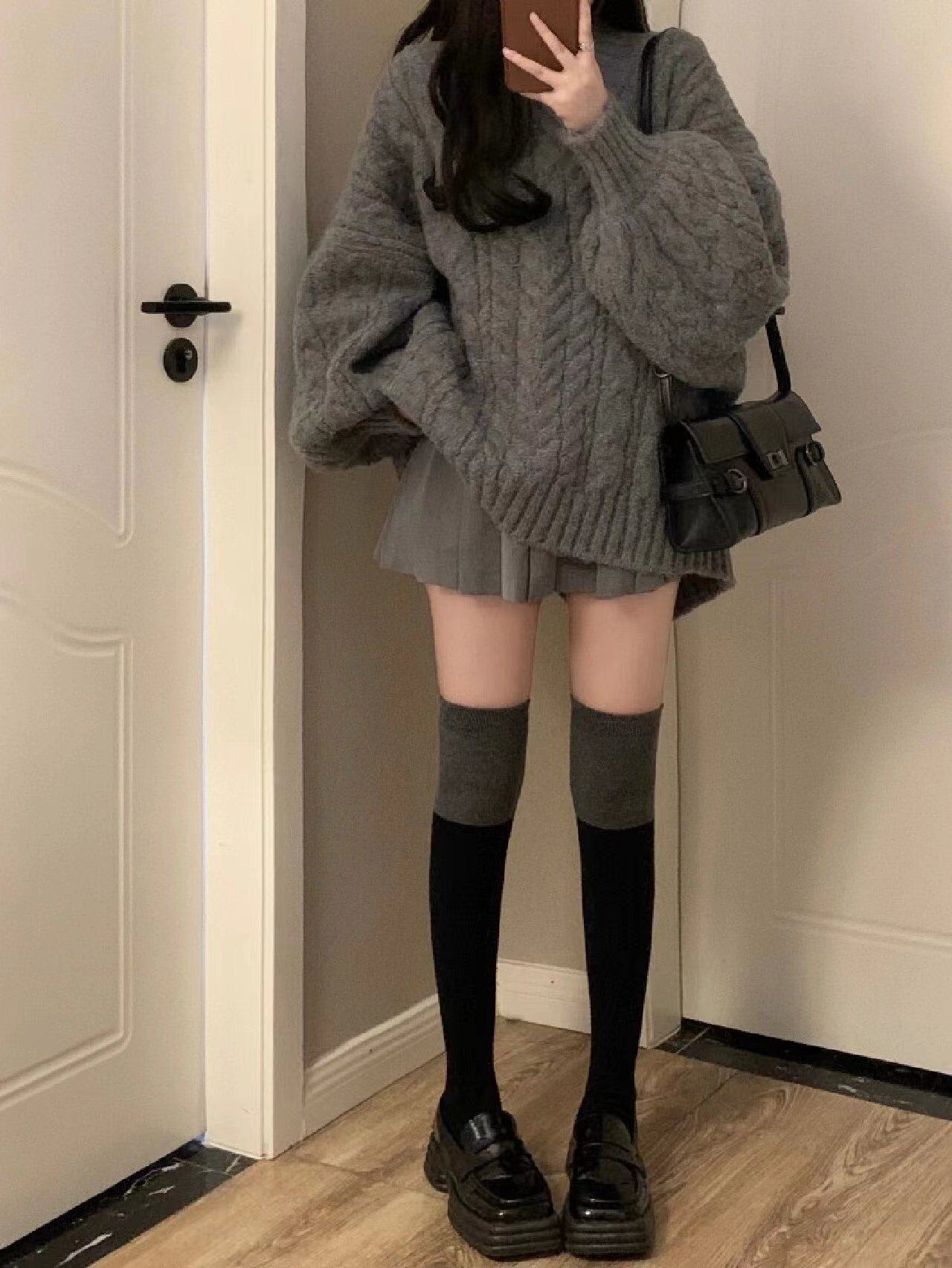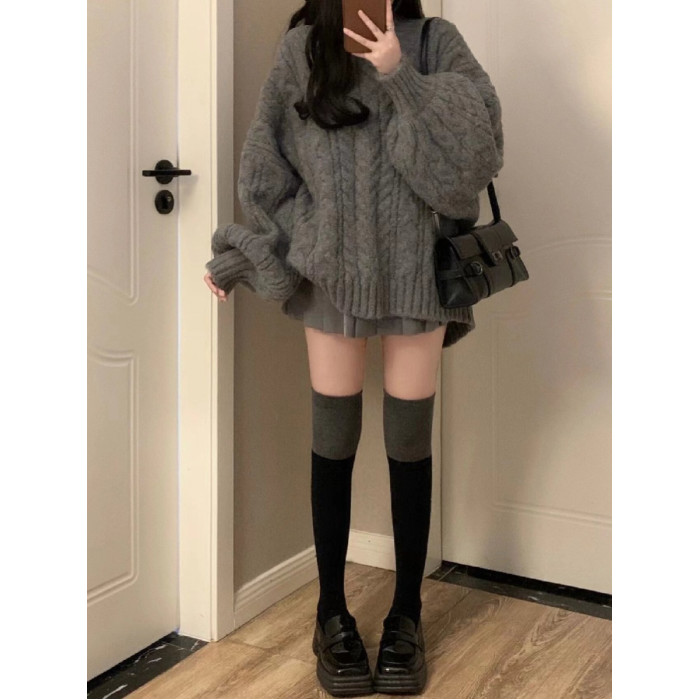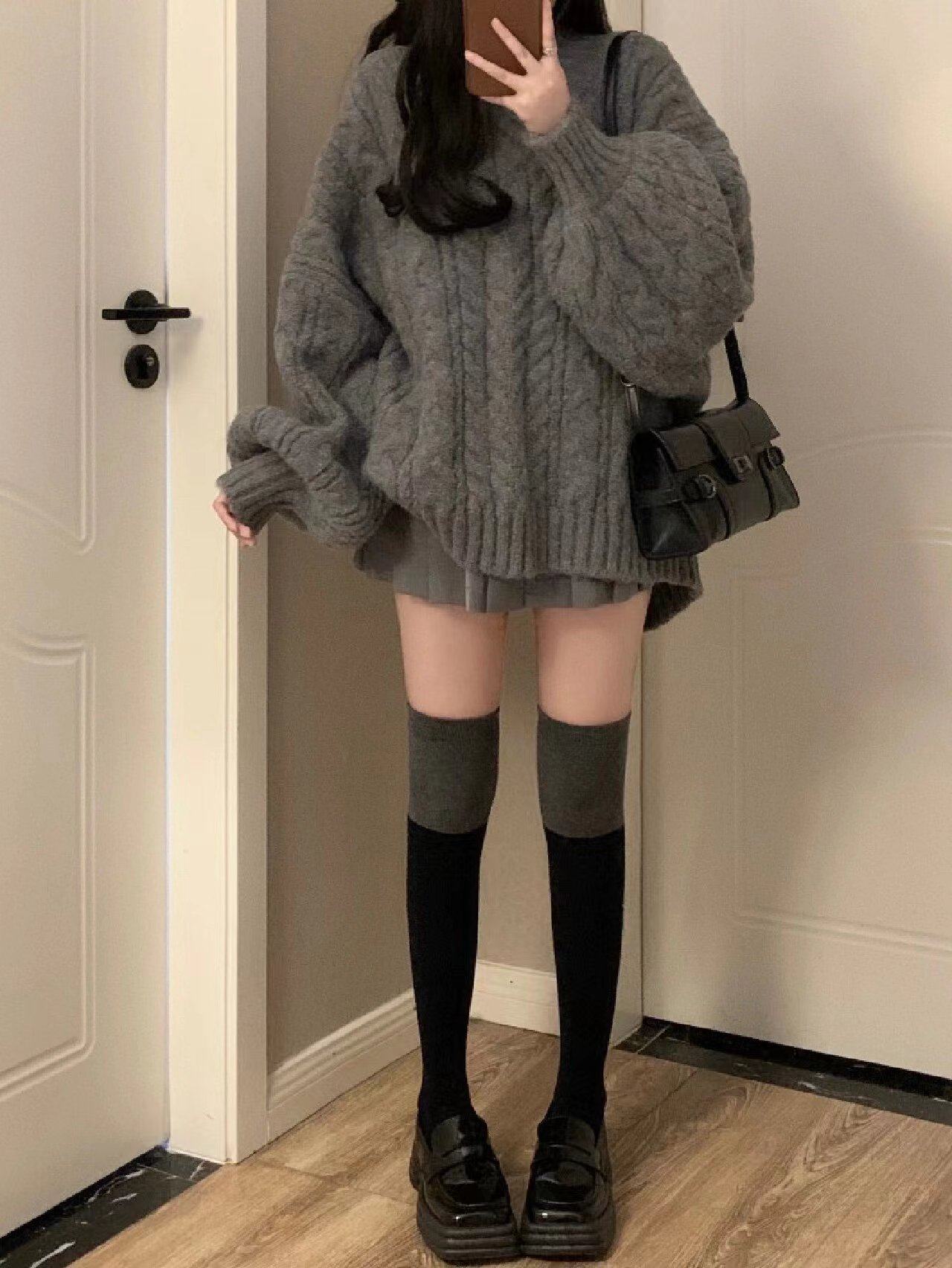 灰色麻花v領毛衣女秋冬2023新款爆款中長款毛衣裙慵懶風寬松上衣