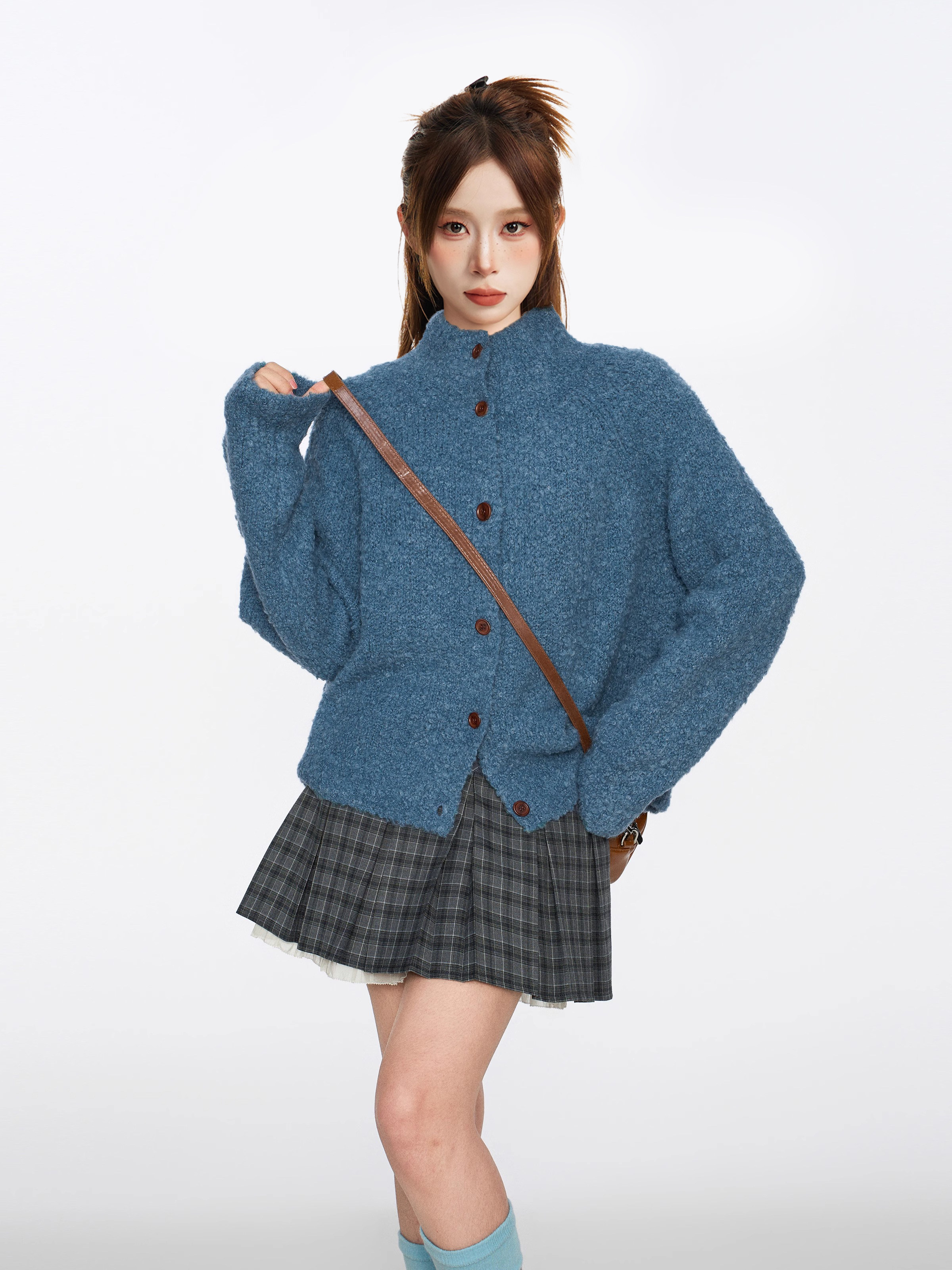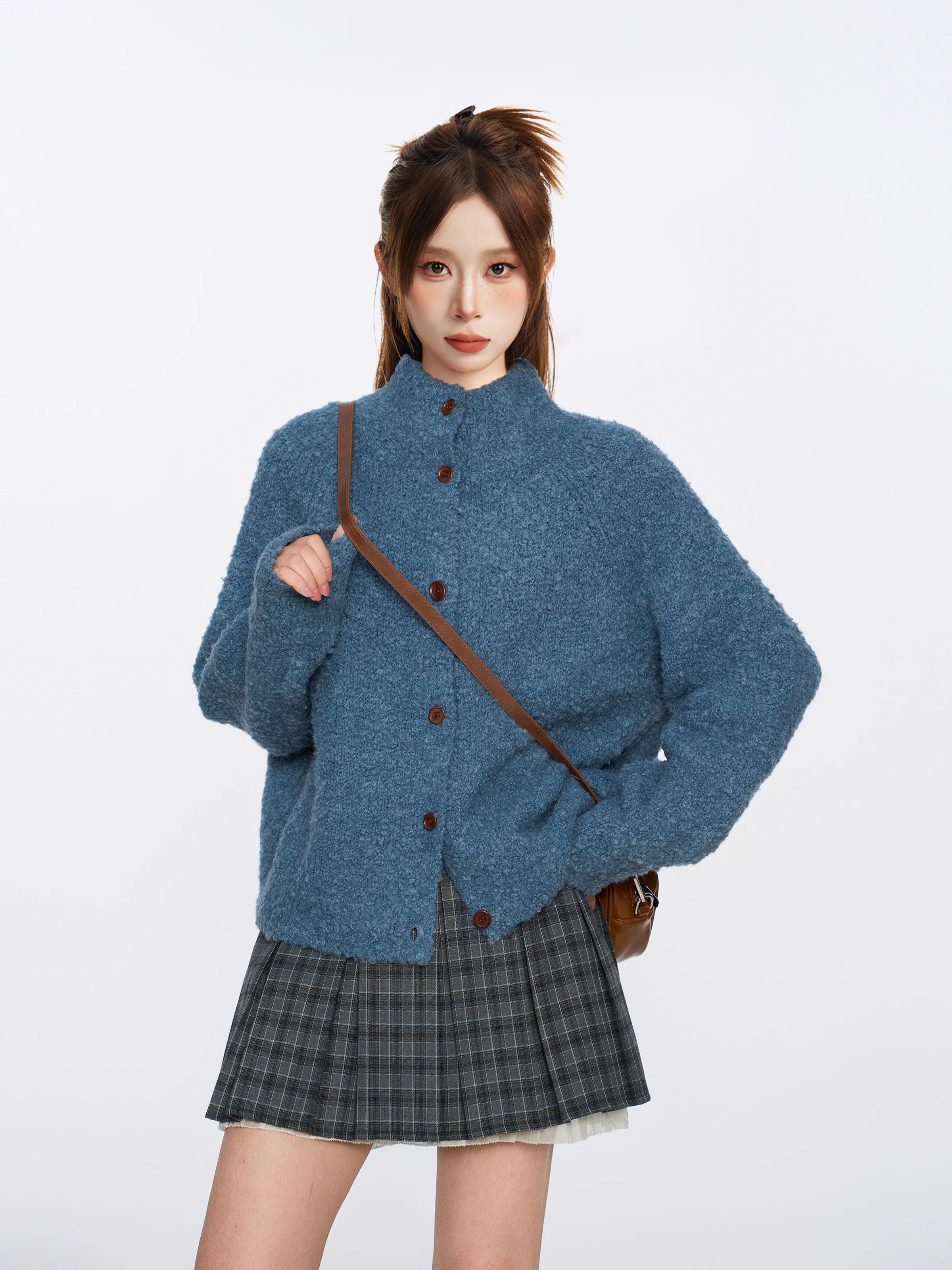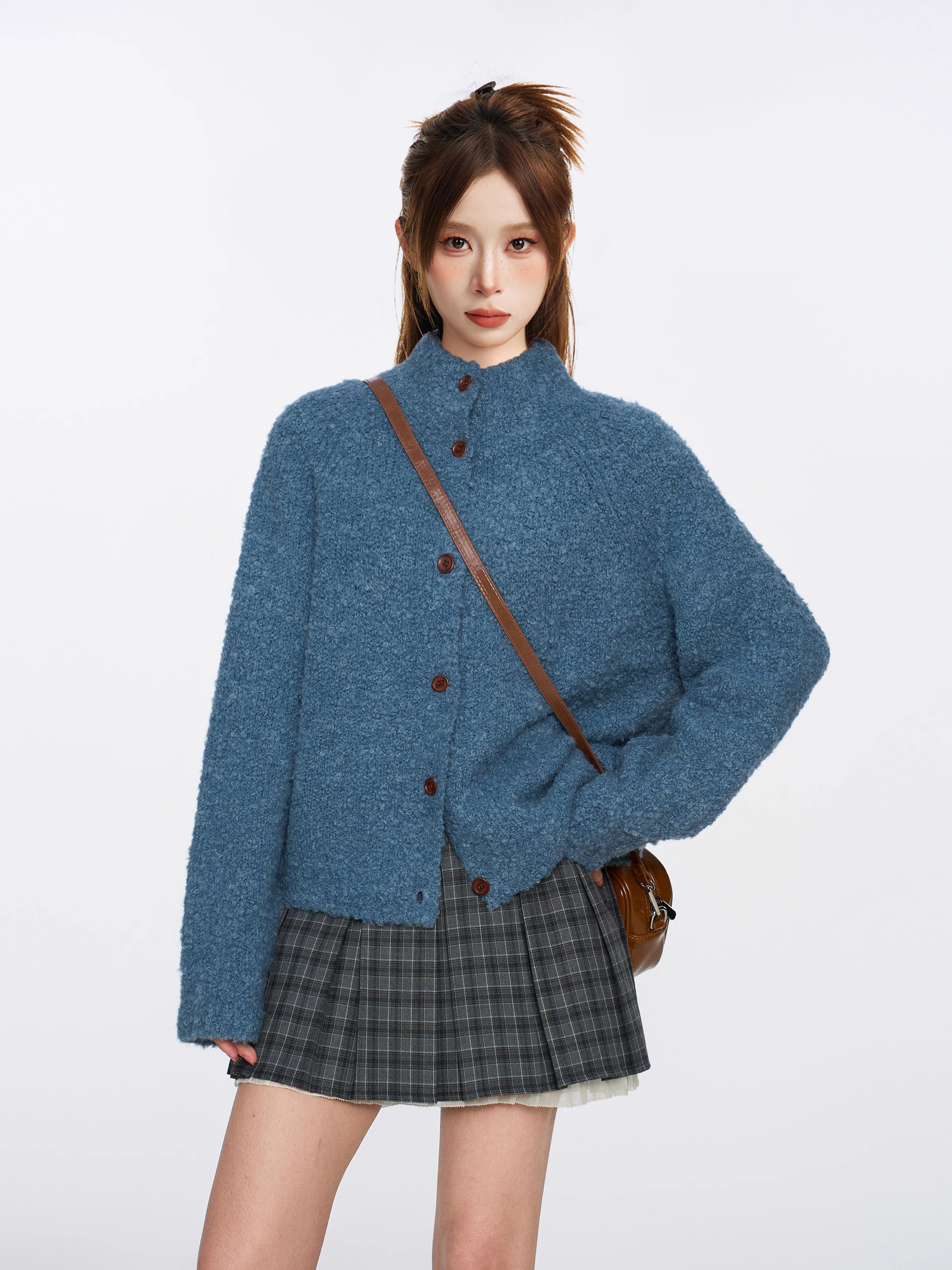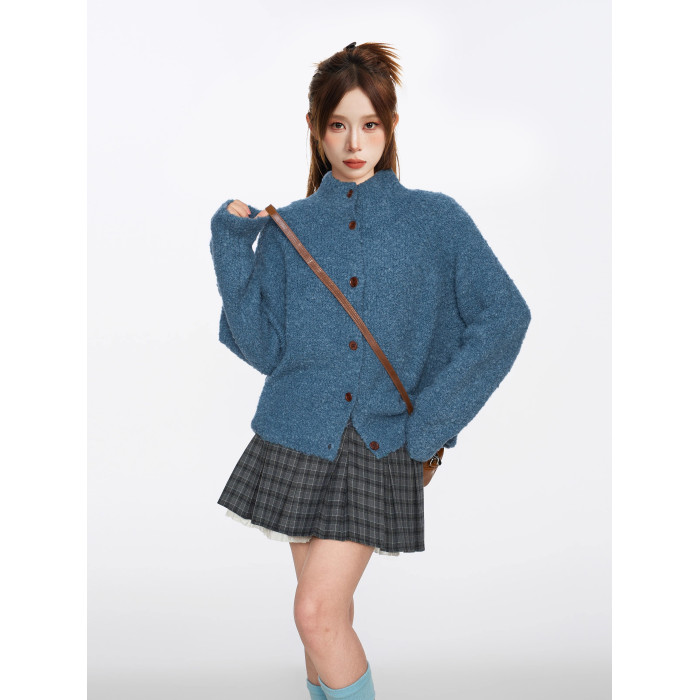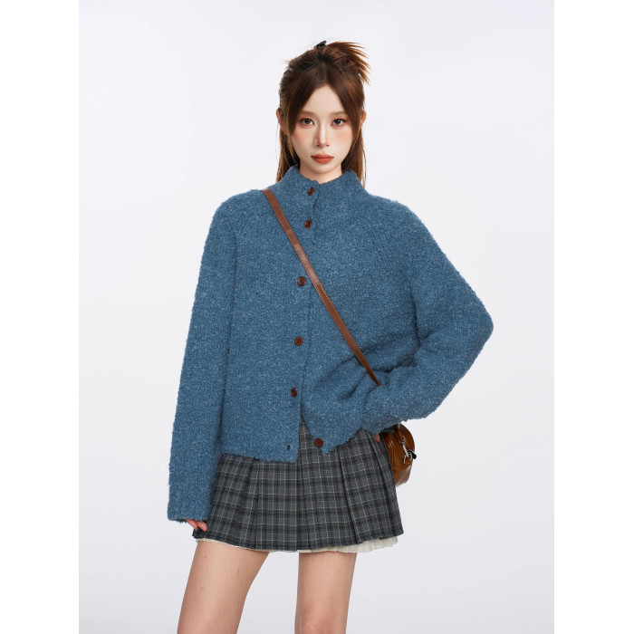 復古藍色圈圈羊毛半高領毛衣外套女秋冬季加厚慵嬾浣熊絨針織開衫