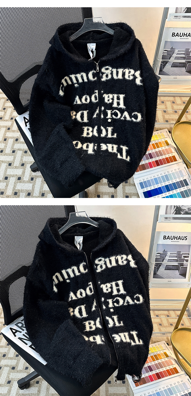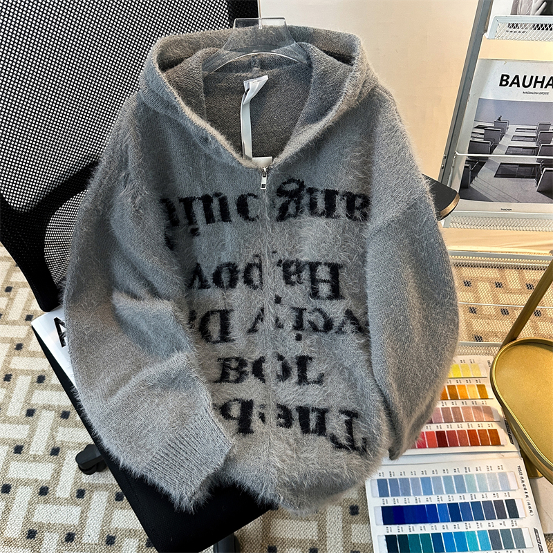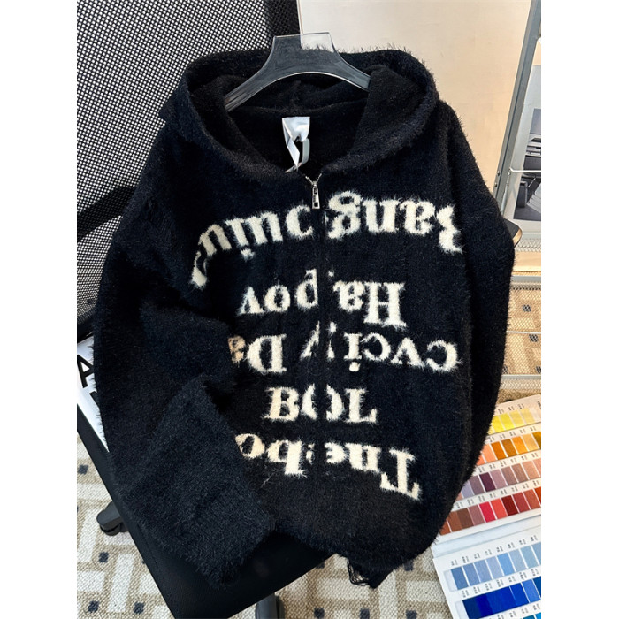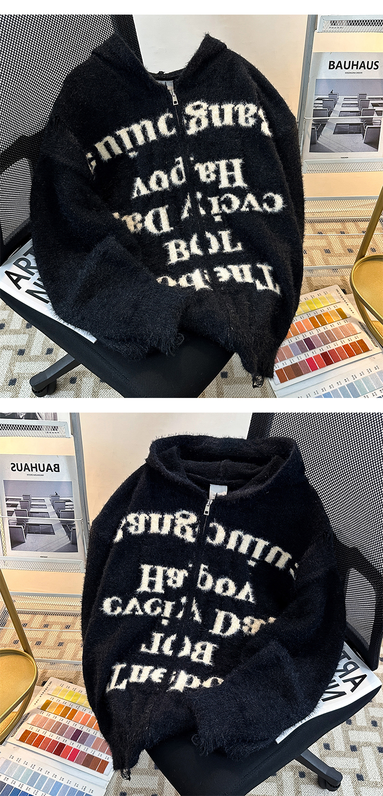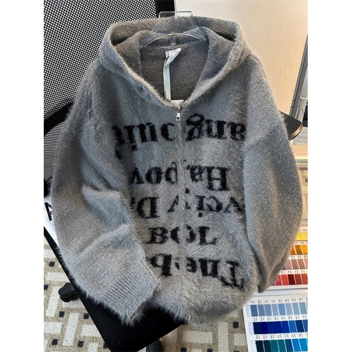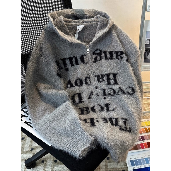 字母破洞連帽開衫毛衣男秋冬季vintage慵懶情侶寬松美式針織外套
