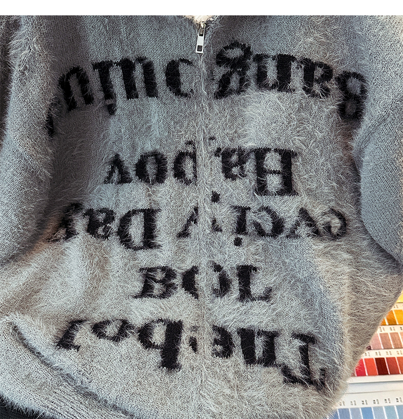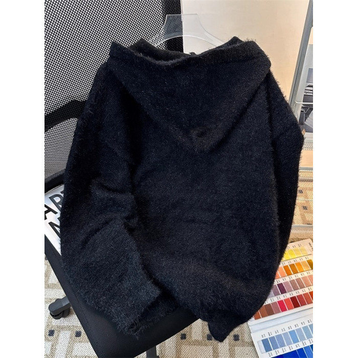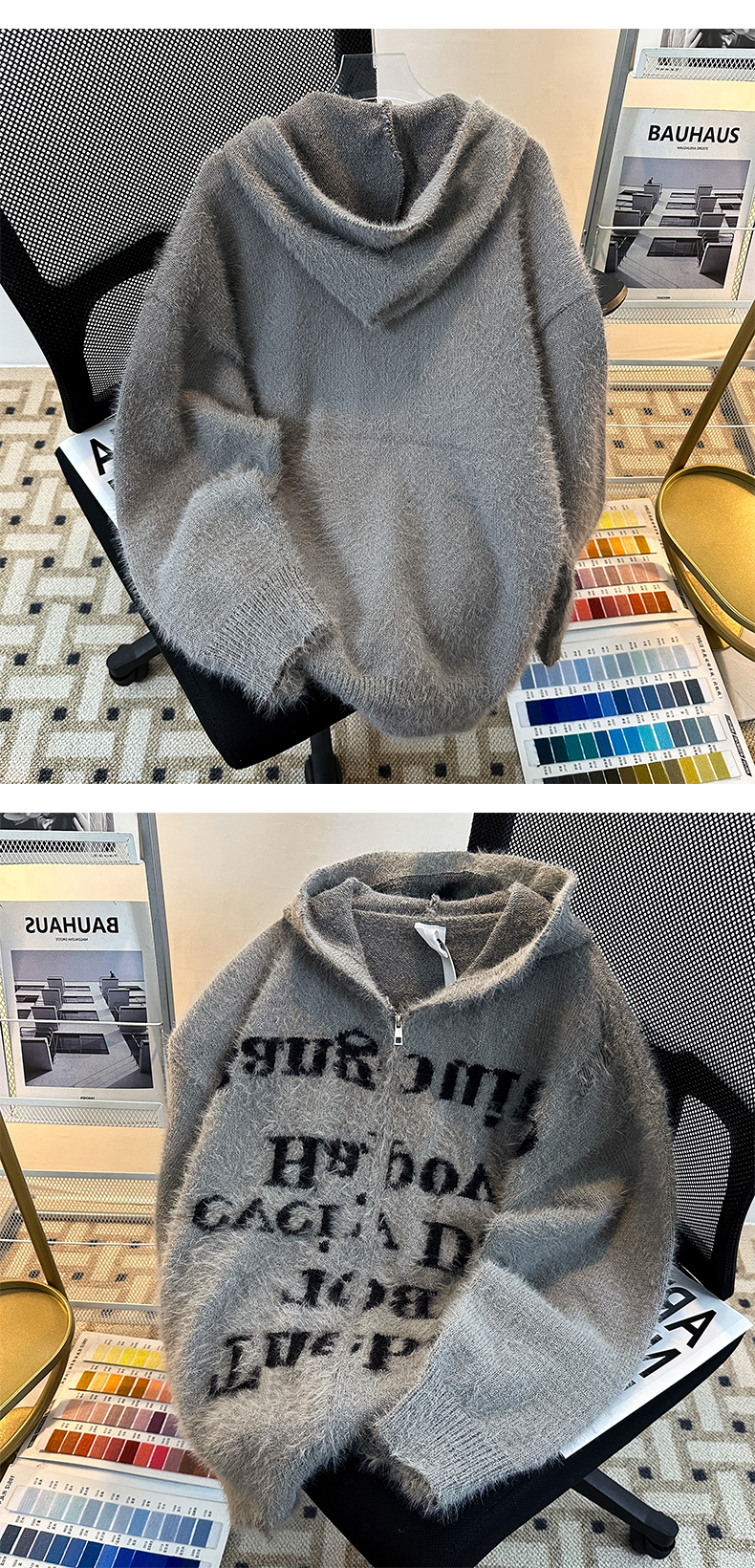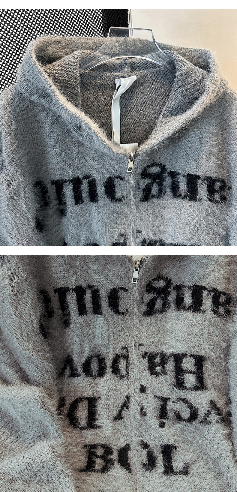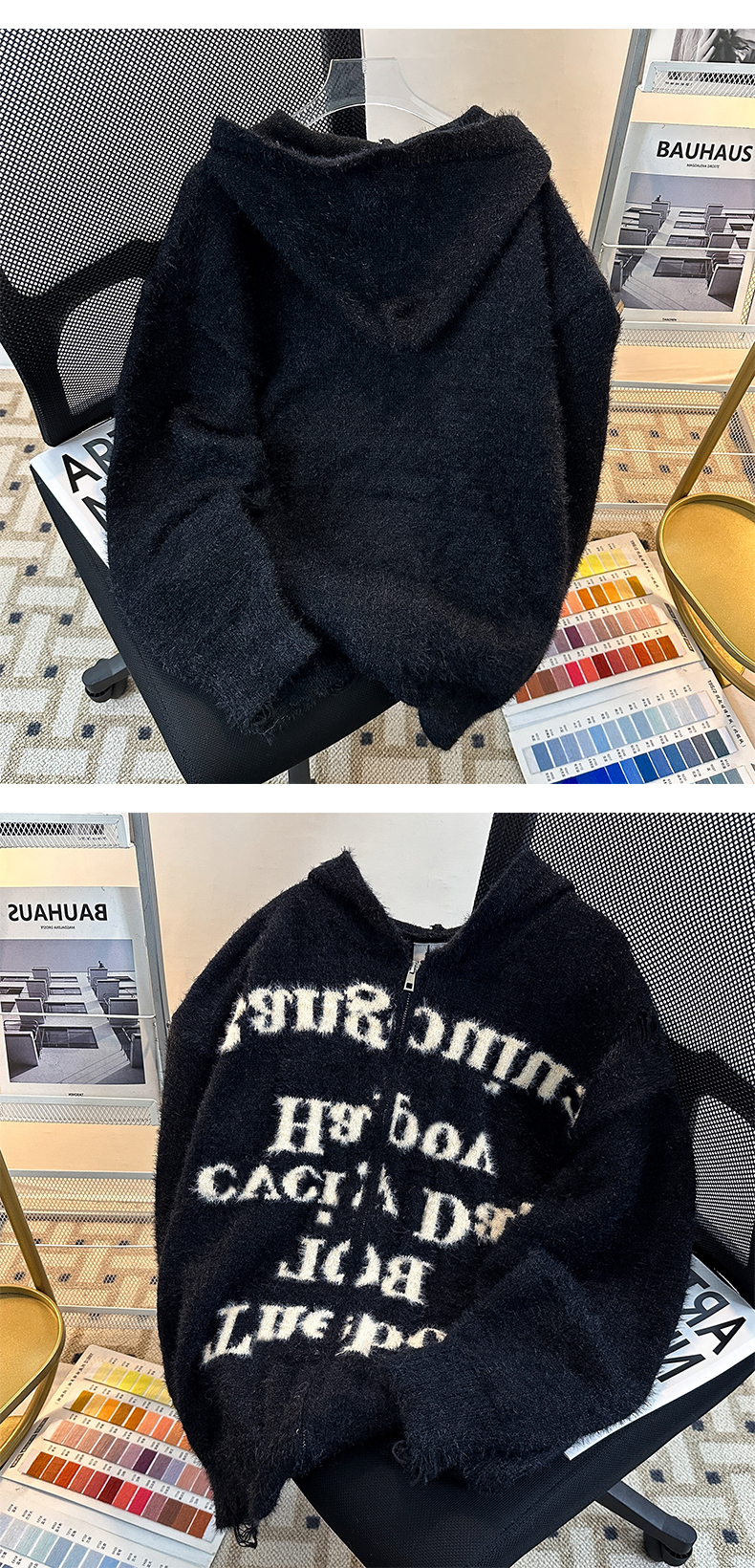 字母破洞連帽開衫毛衣男秋冬季vintage慵懶情侶寬松美式針織外套