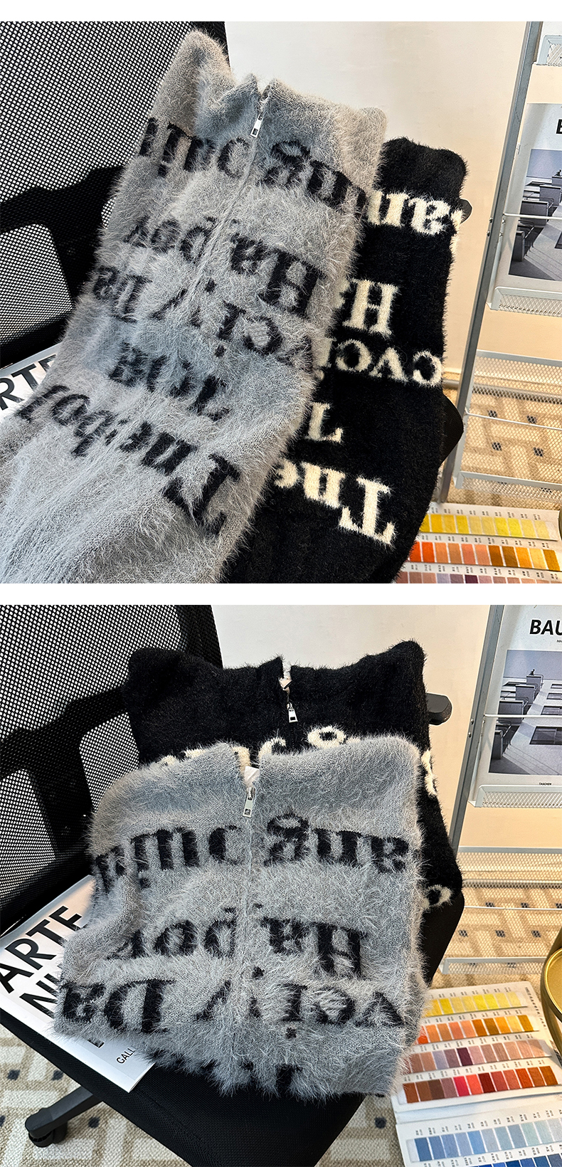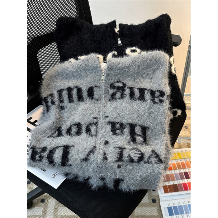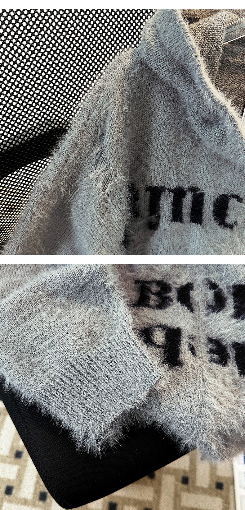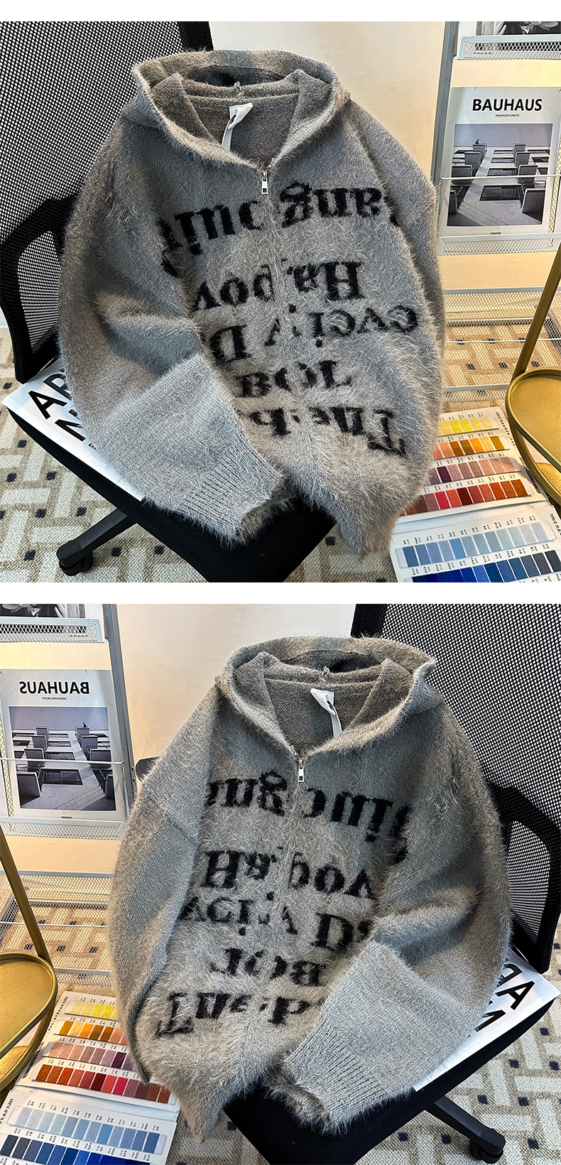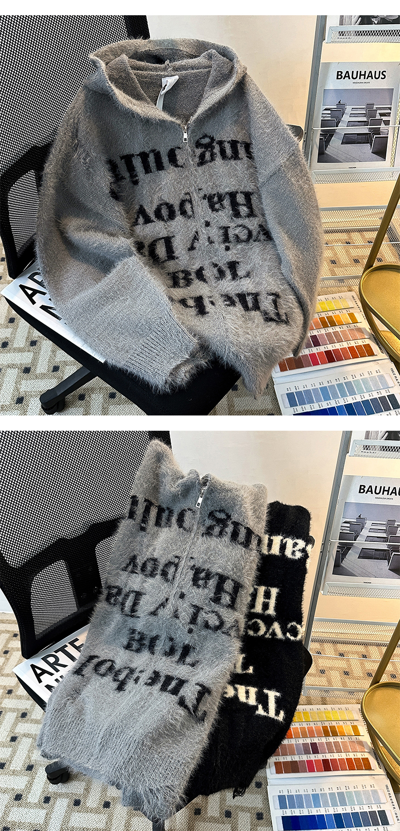字母破洞連帽開衫毛衣男秋冬季vintage慵懶情侶寬松美式針織外套