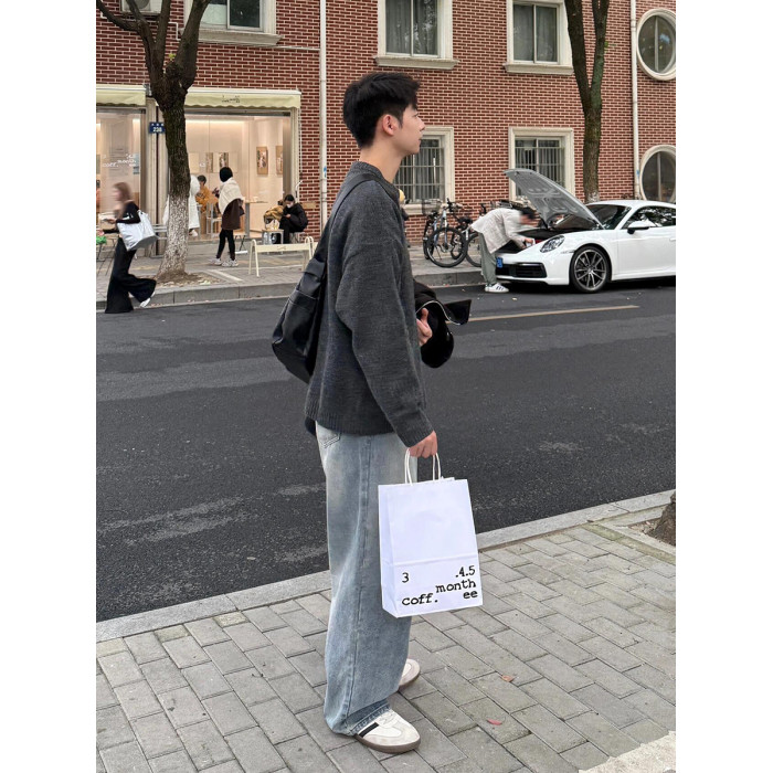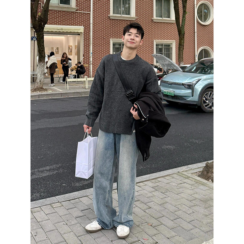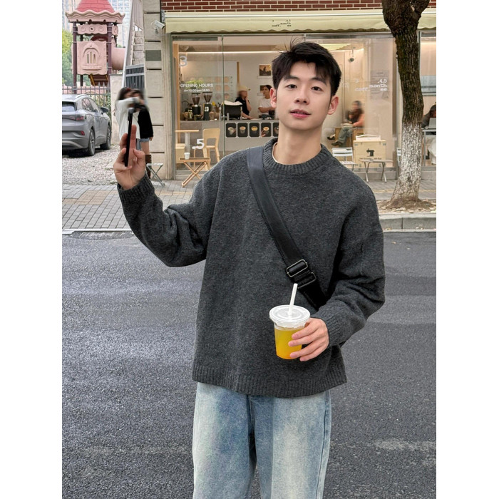 深灰色圓領毛衣男冬季韓系穿搭慵懶軟糯針織衫cleanfit內搭打底衫