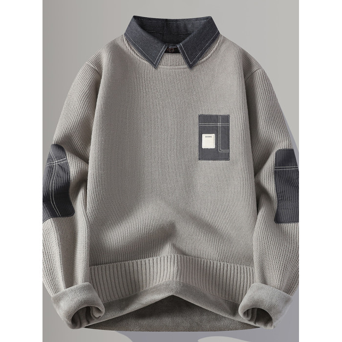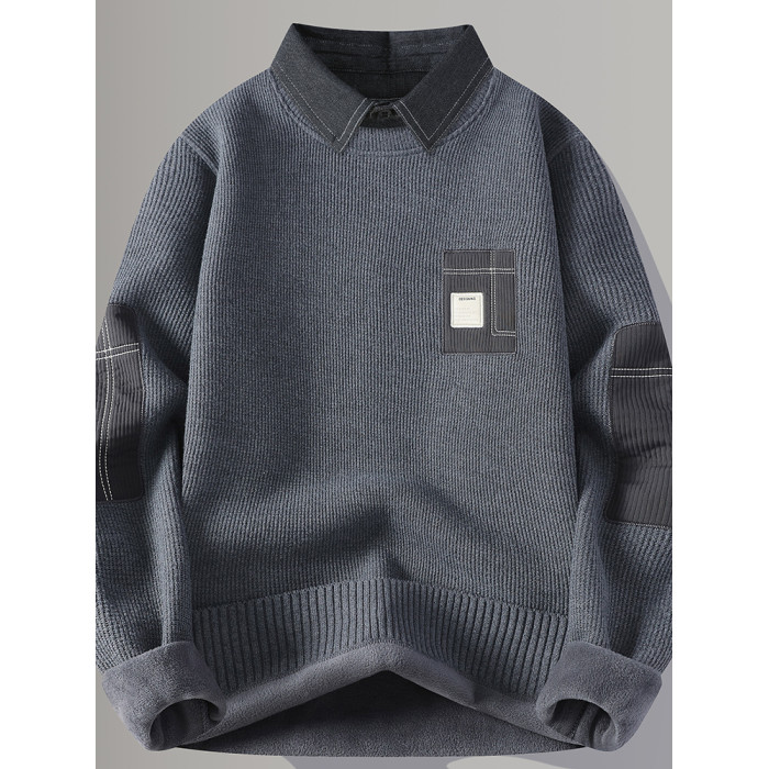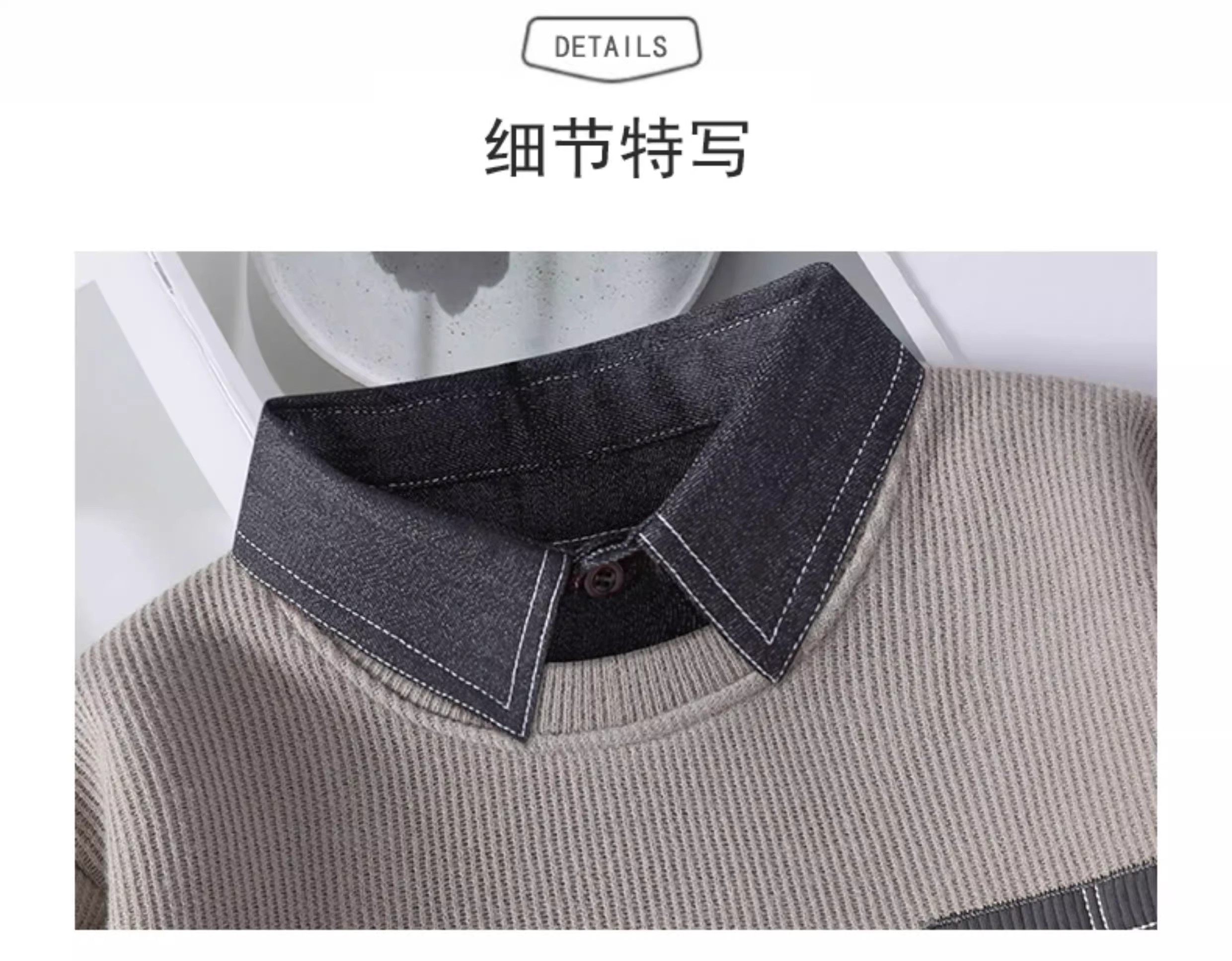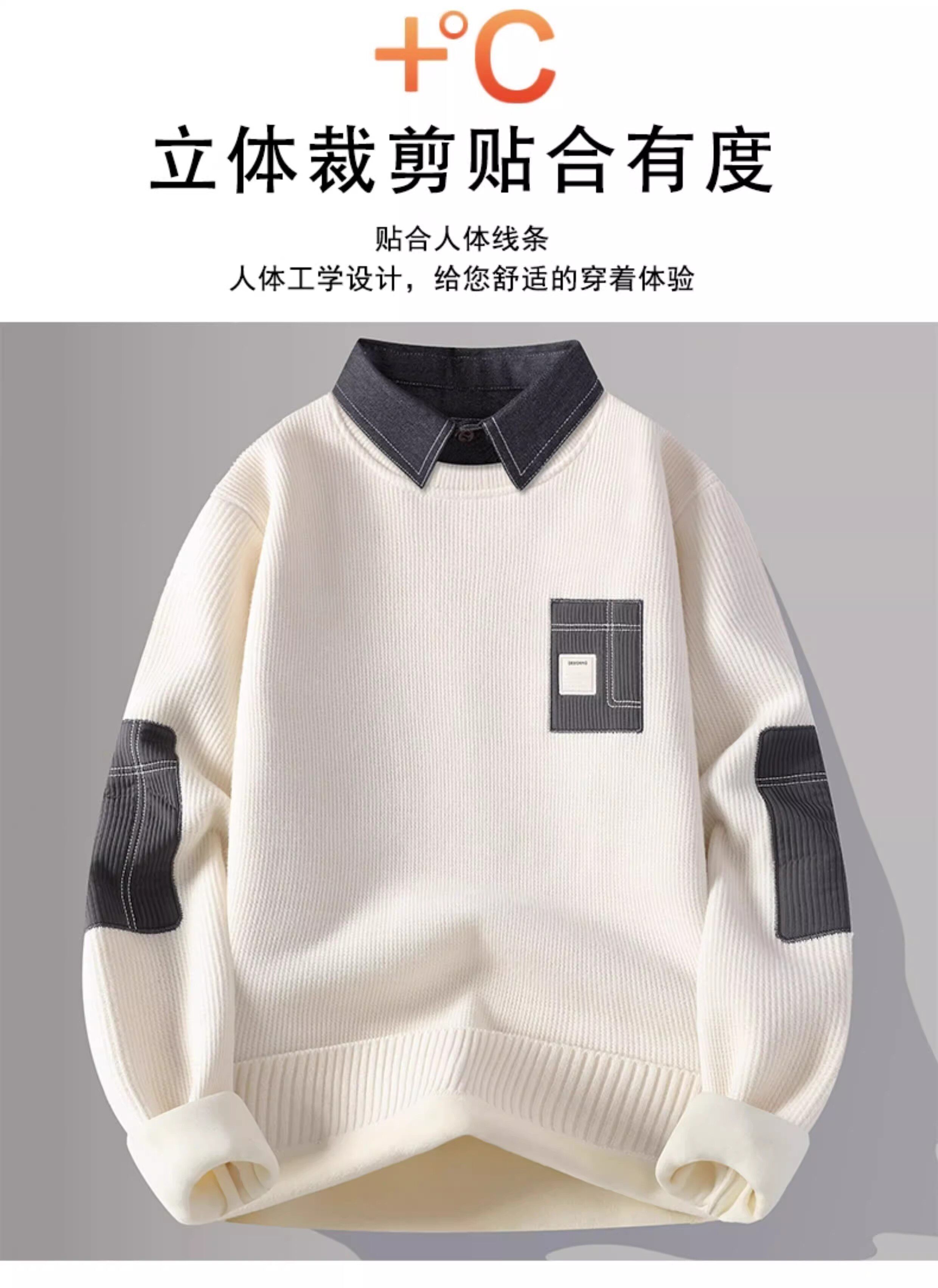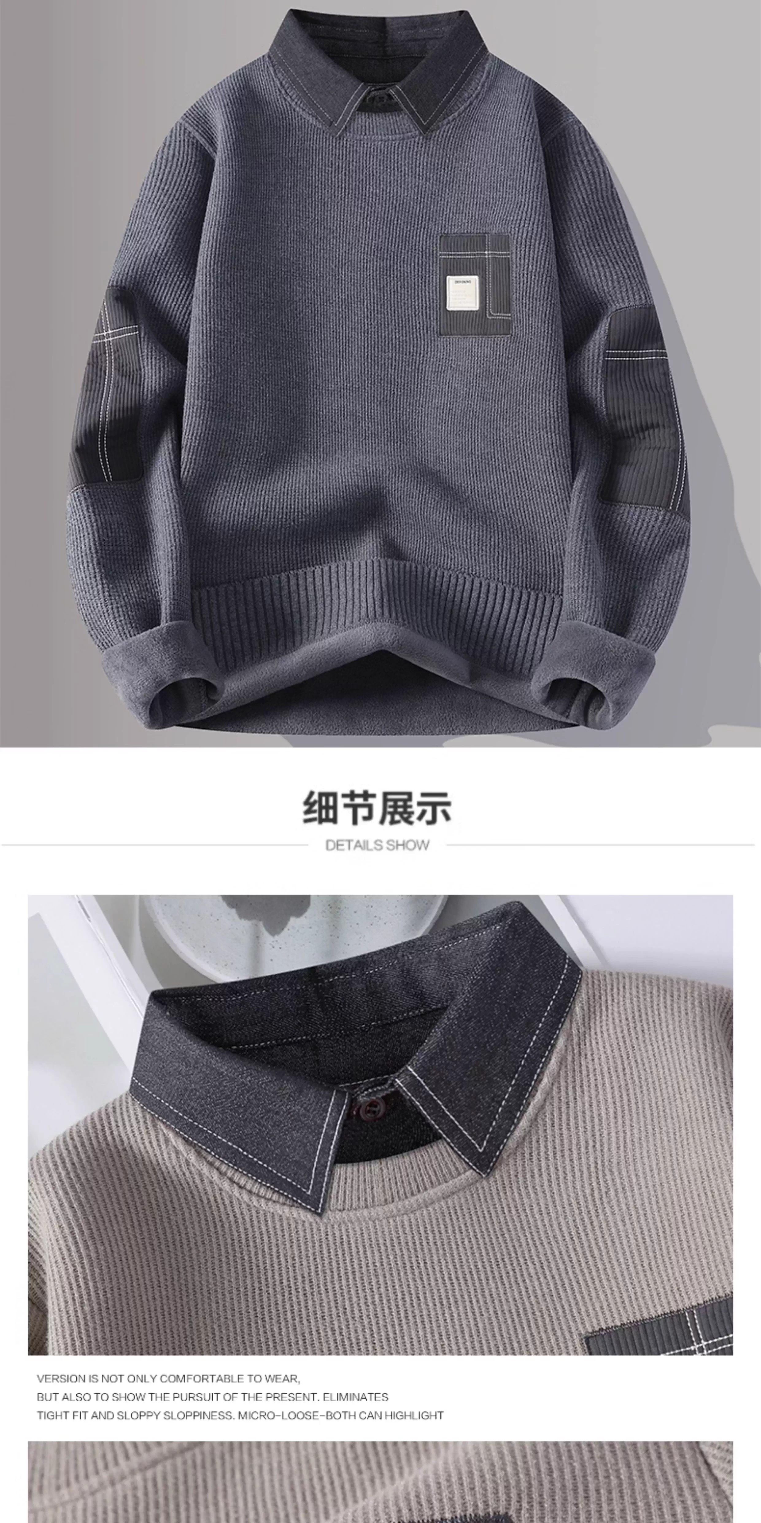 襯衫領一體絨毛衣男秋冬款加絨加厚假兩件長袖襯衣潮牌打底針織衫