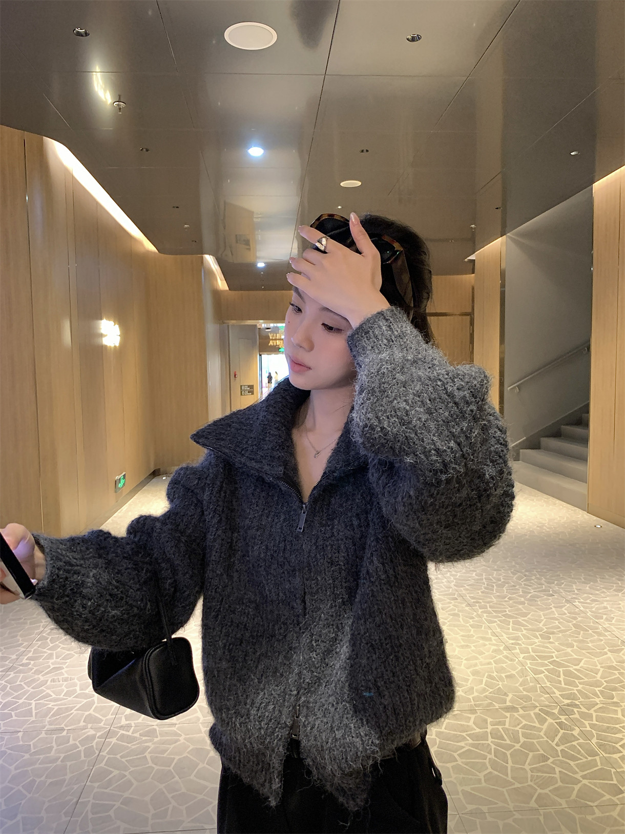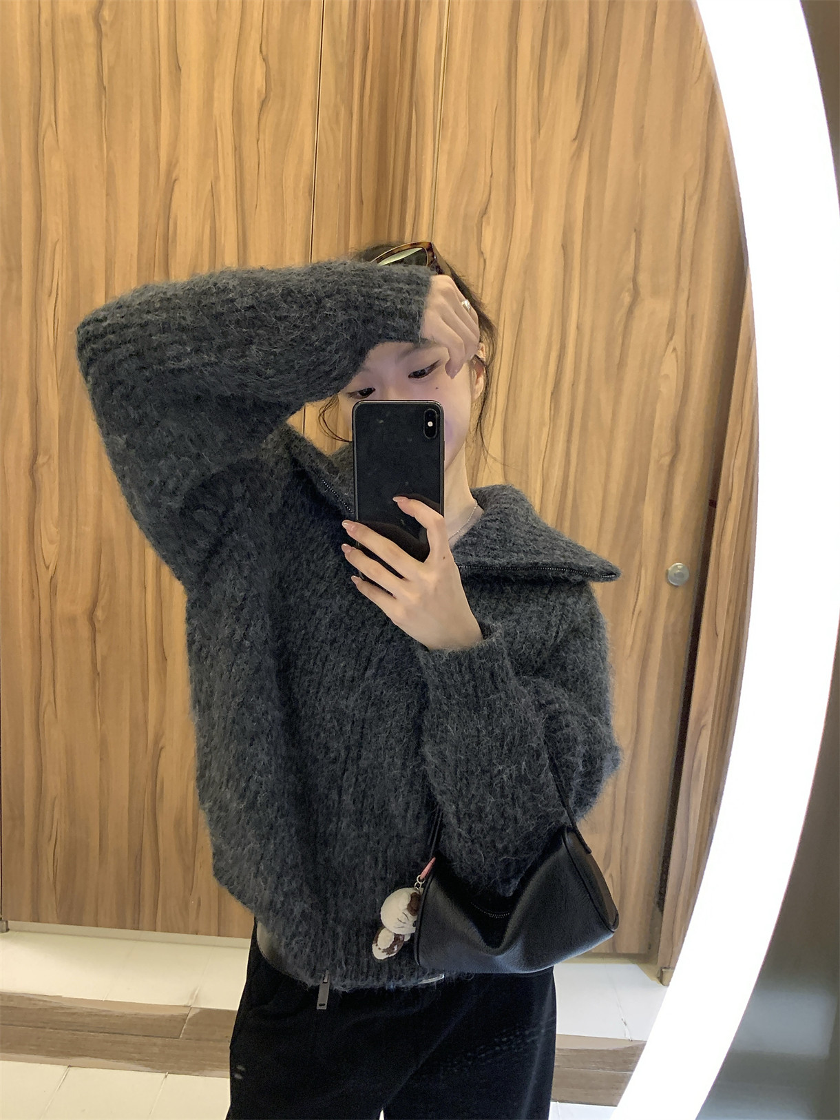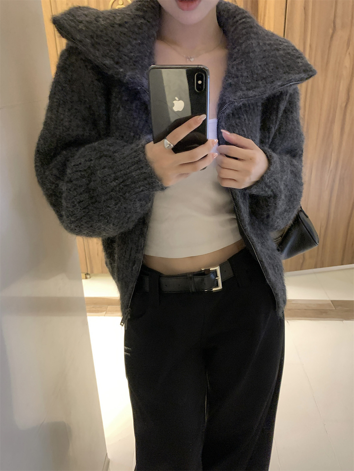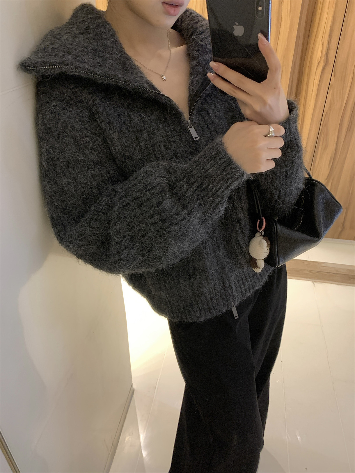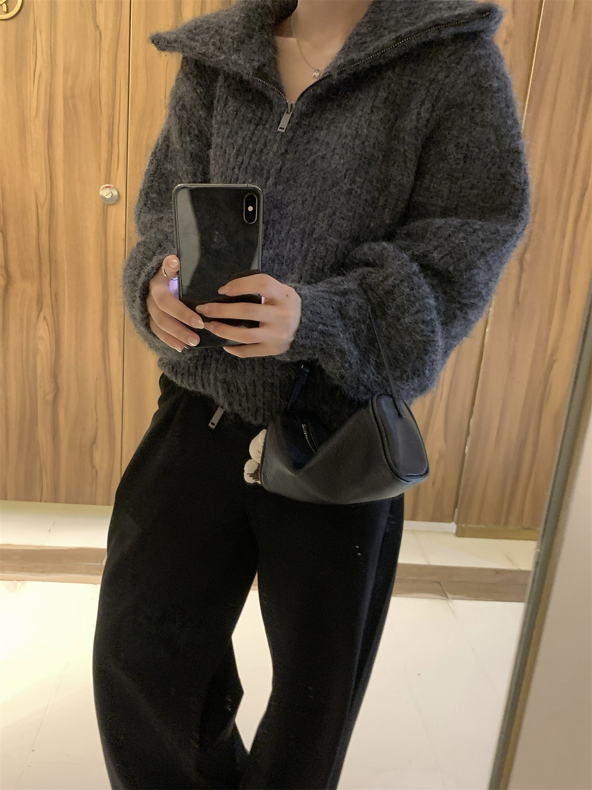 黑奶酪 BLACK~冬季老錢風慵懶厚實立領拉鍊毛衣外套翻領開衫
