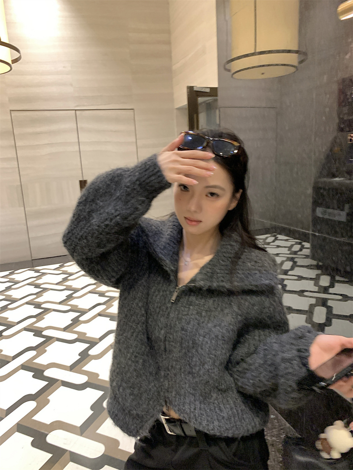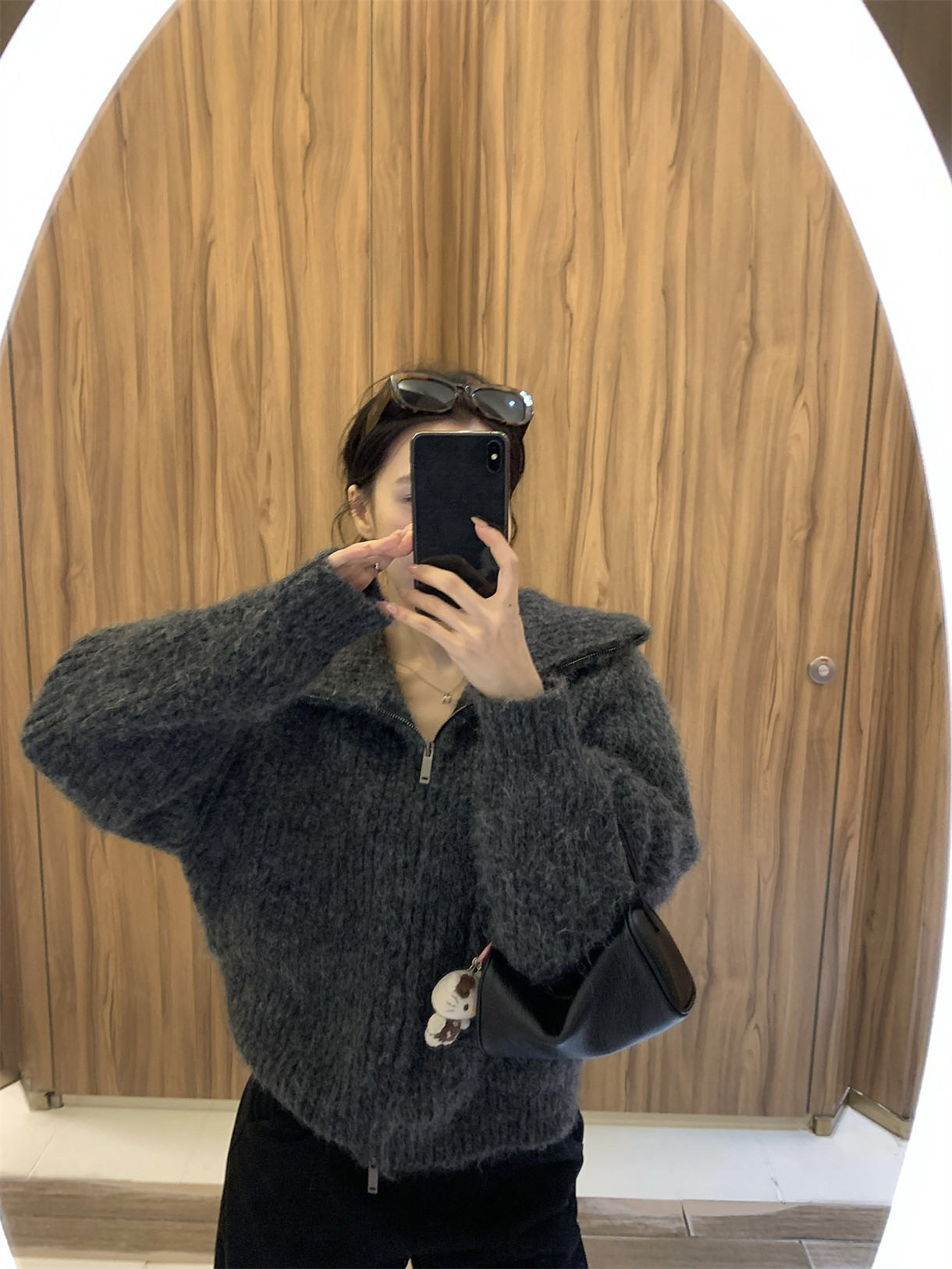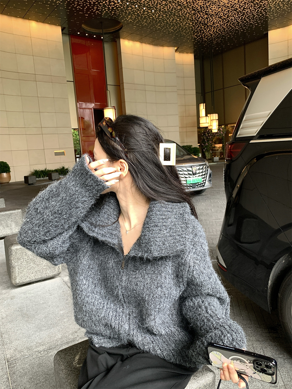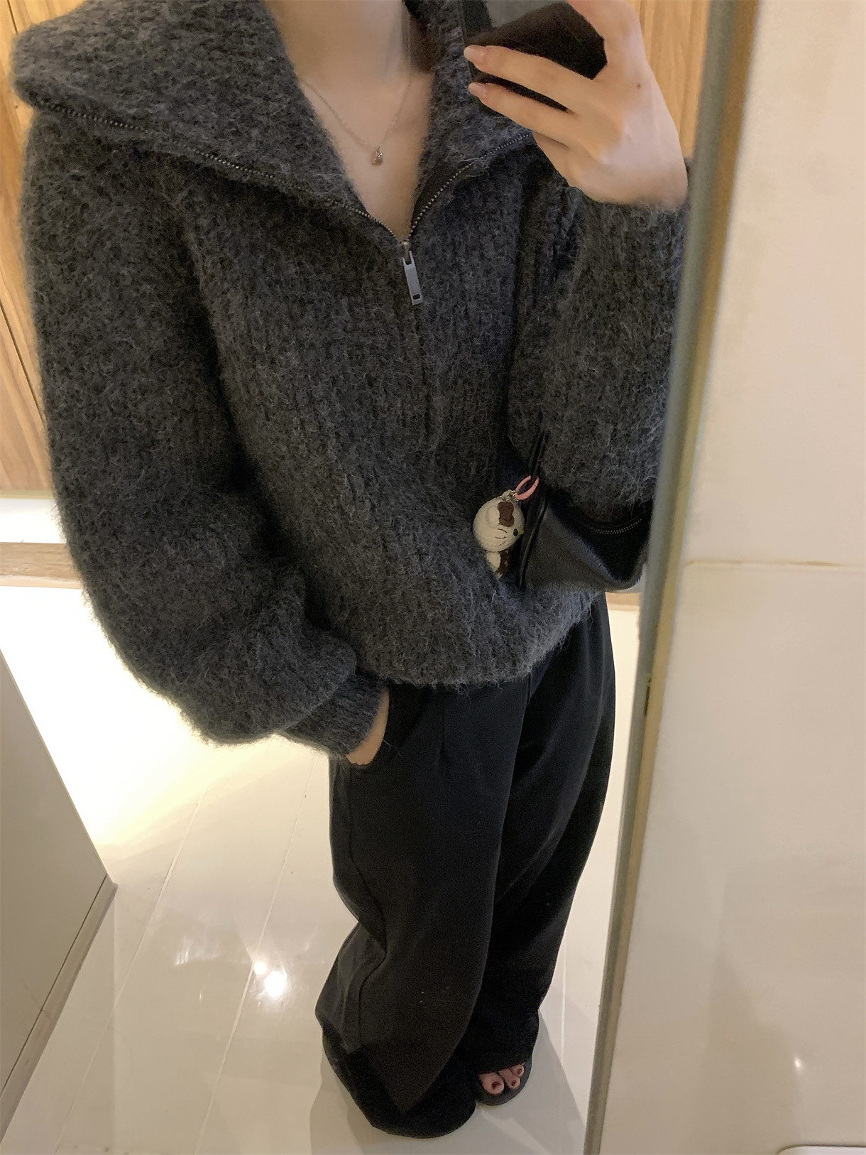 黑奶酪 BLACK~冬季老錢風慵懶厚實立領拉鍊毛衣外套翻領開衫
