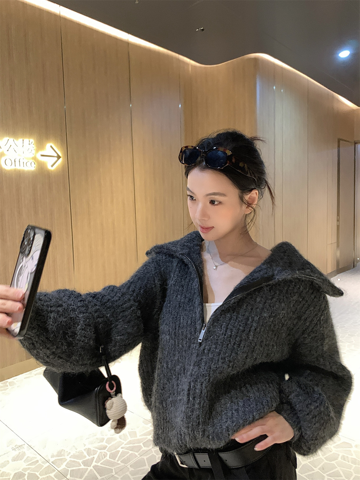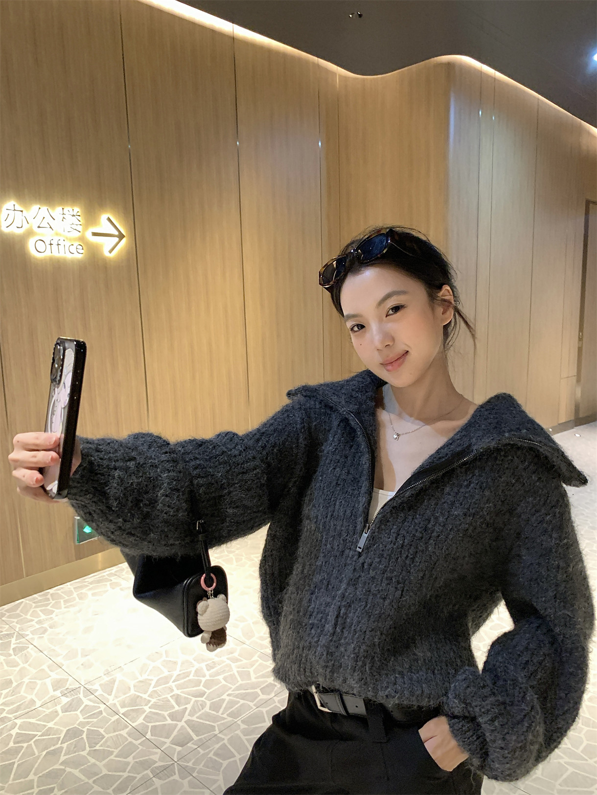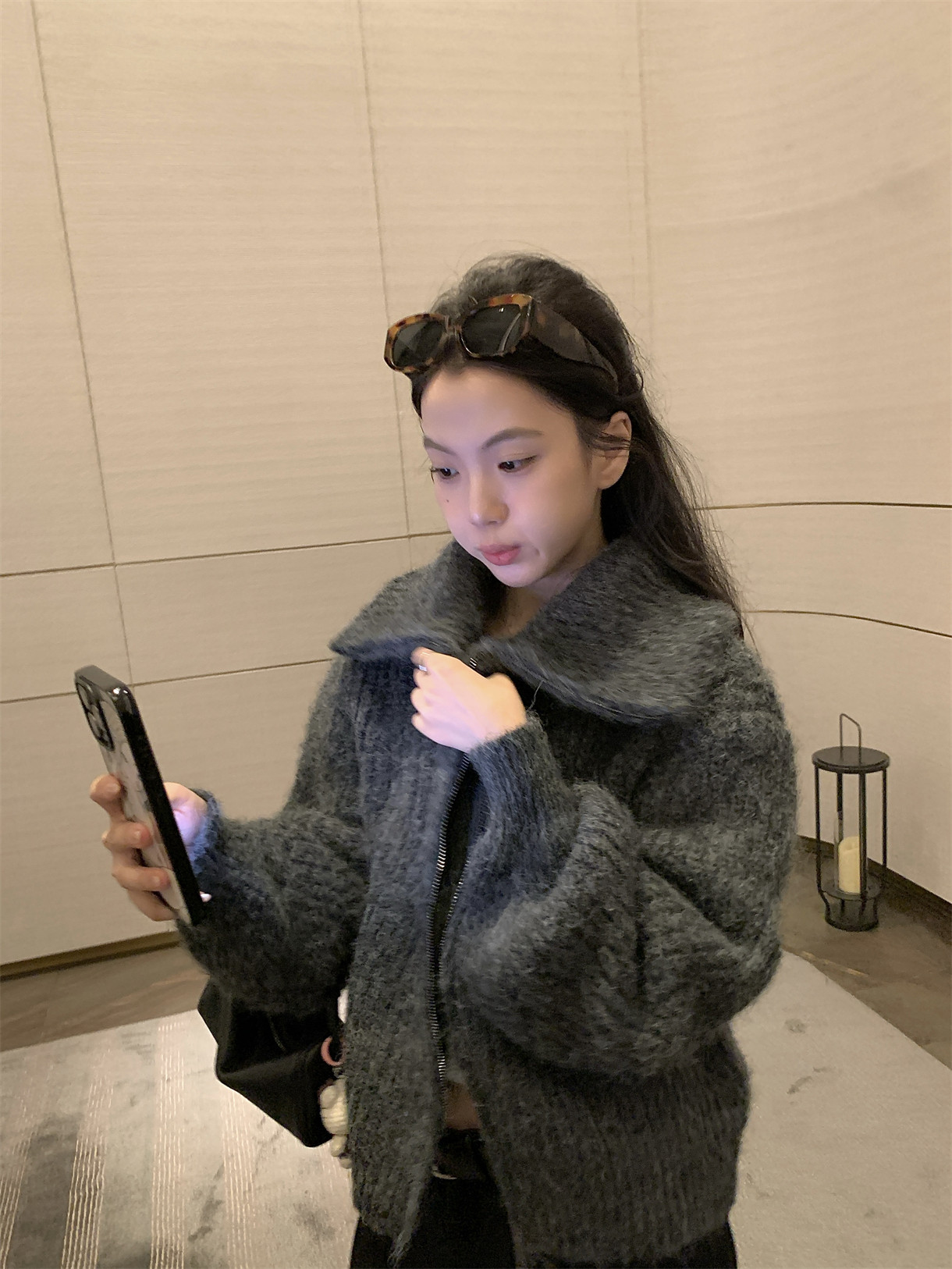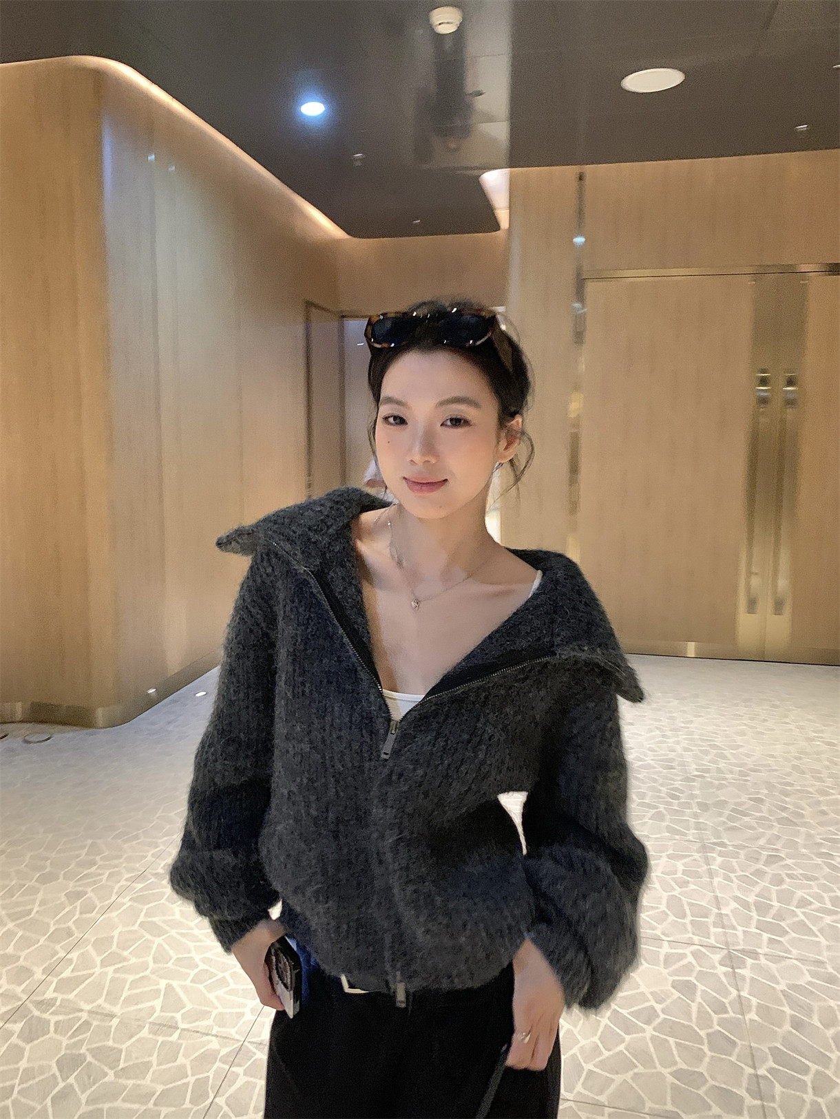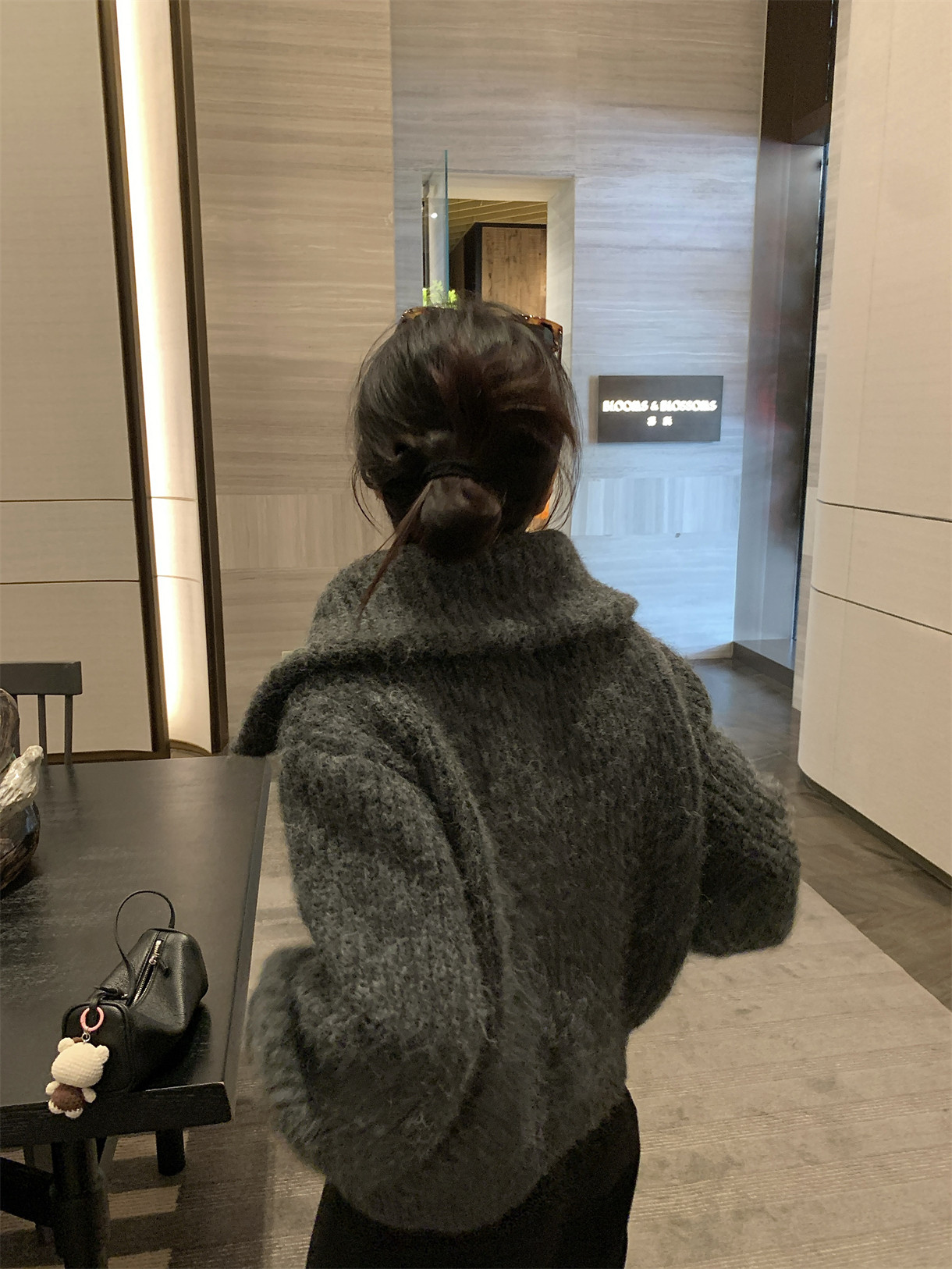 黑奶酪 BLACK~冬季老錢風慵懶厚實立領拉鍊毛衣外套翻領開衫