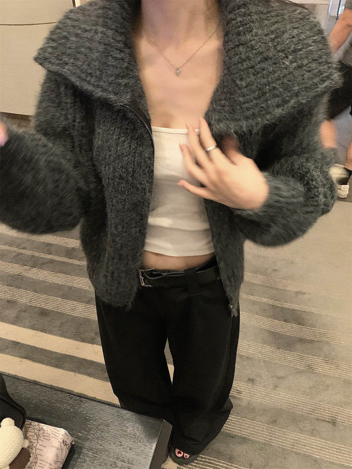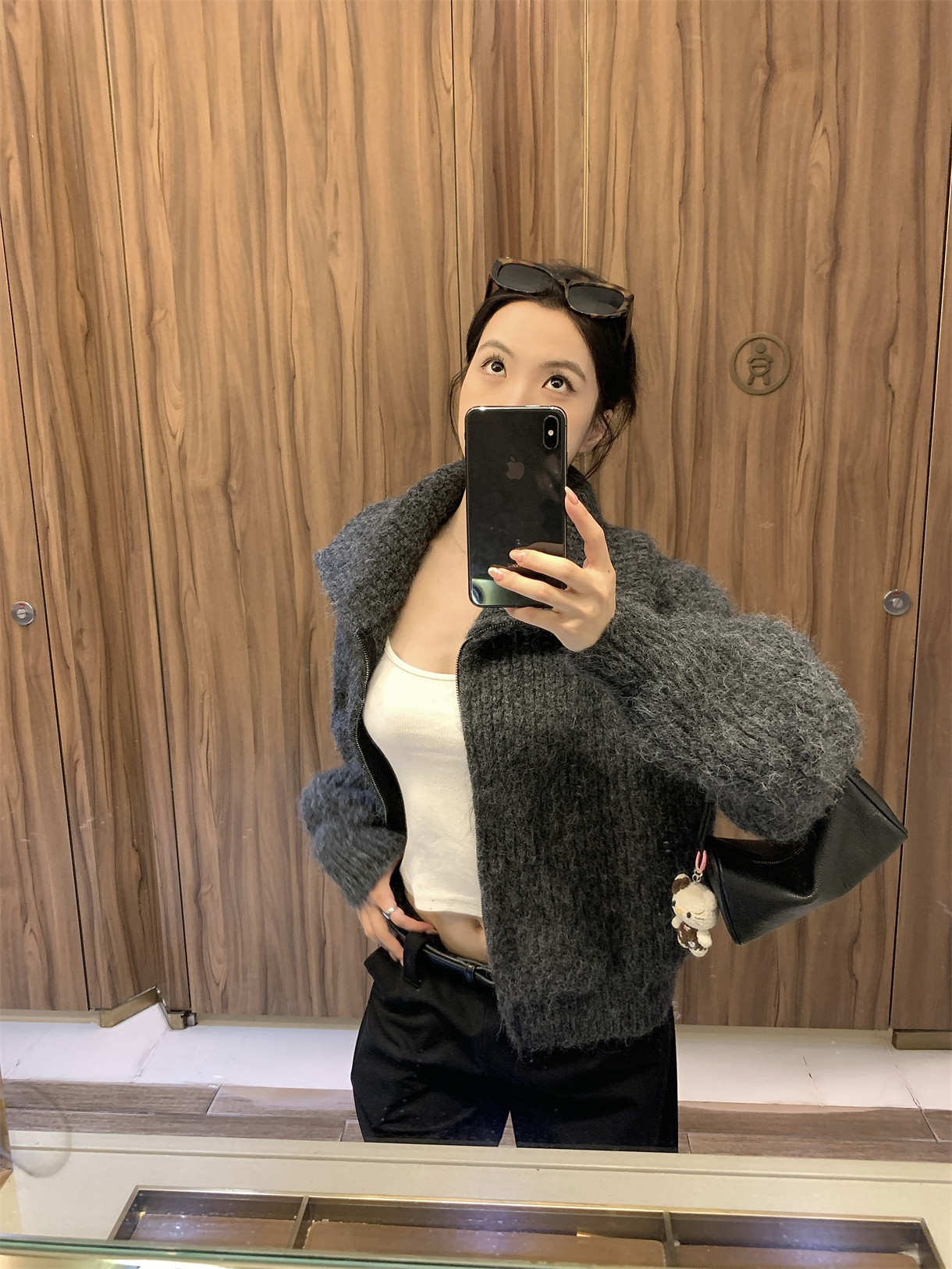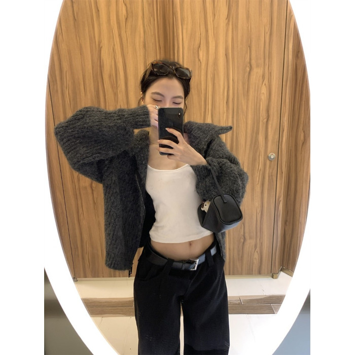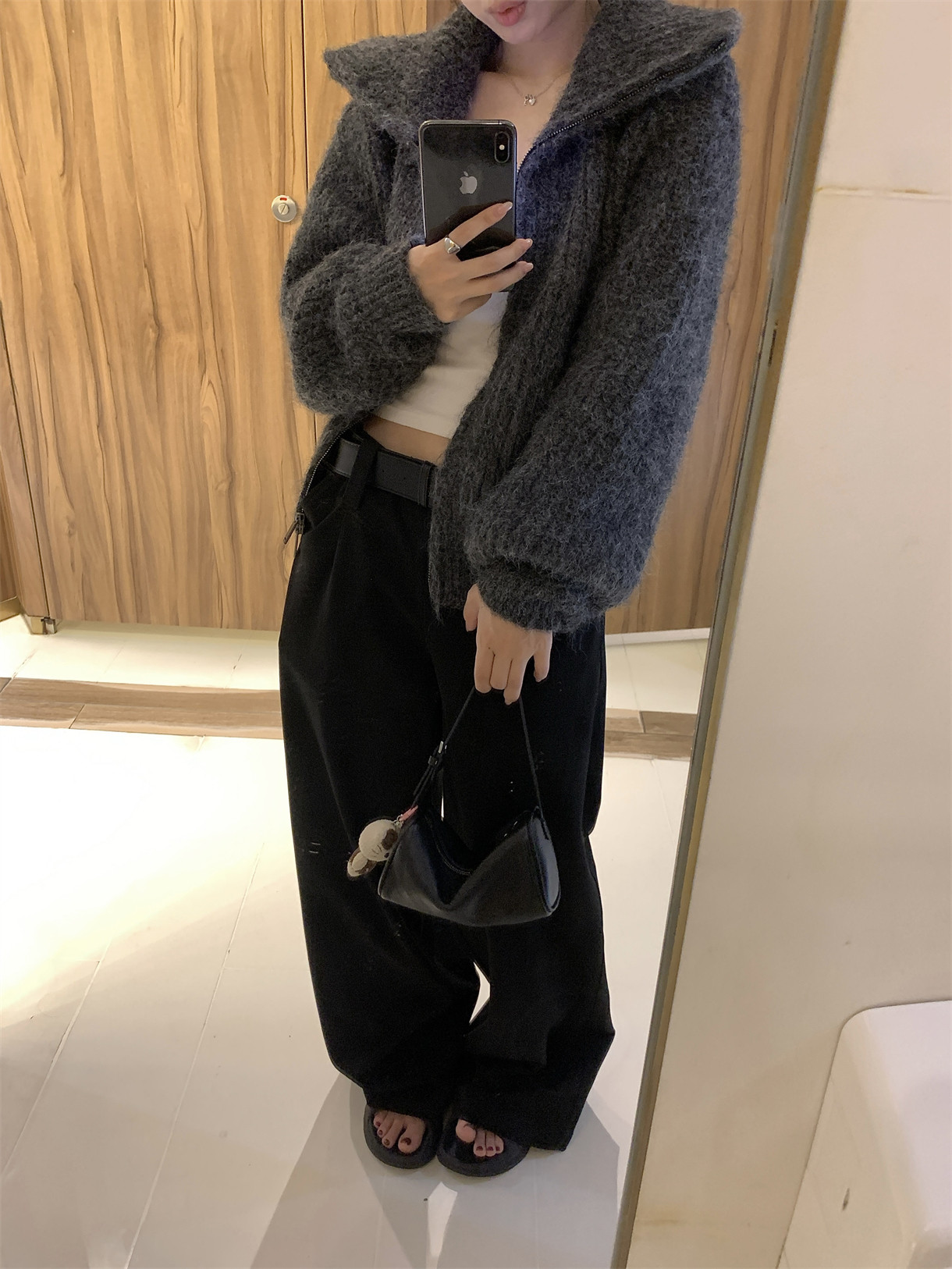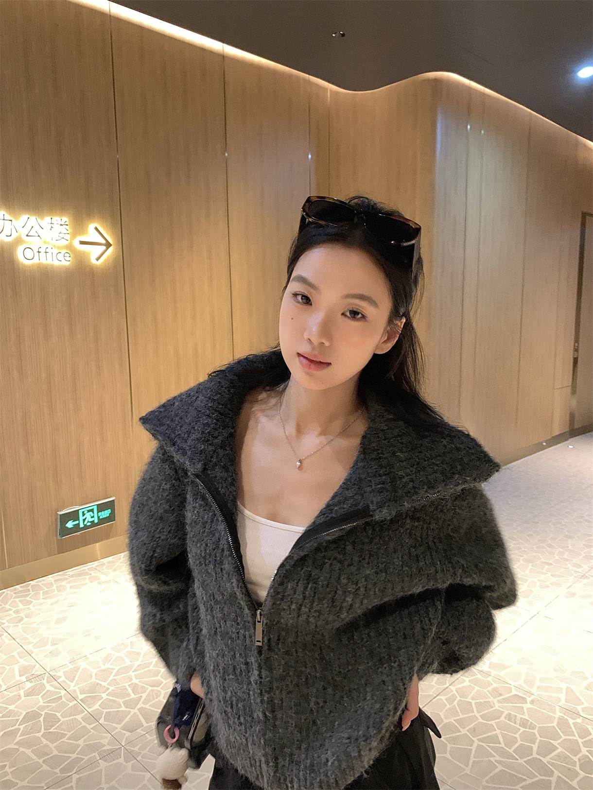 黑奶酪 BLACK~冬季老錢風慵懶厚實立領拉鍊毛衣外套翻領開衫