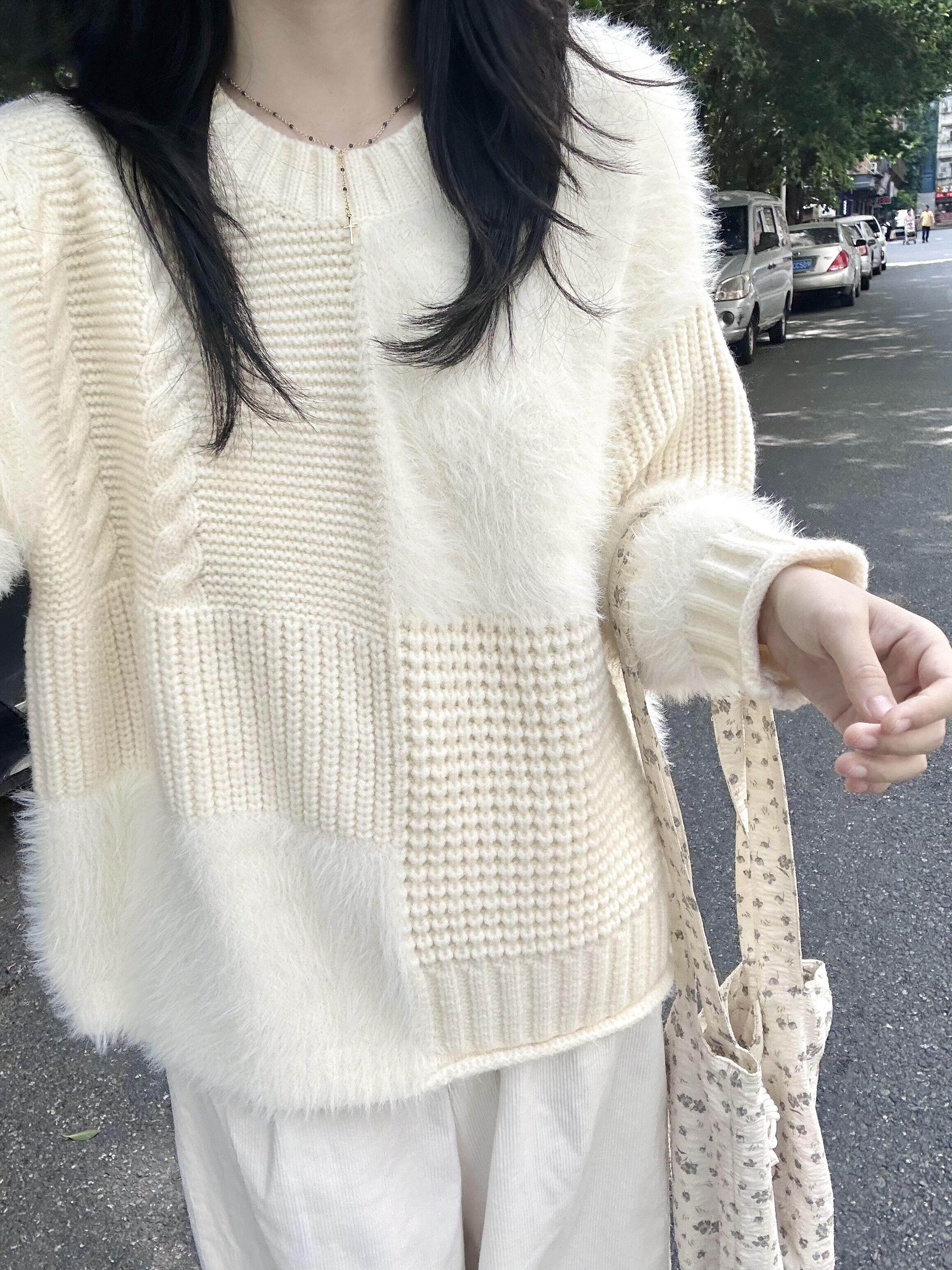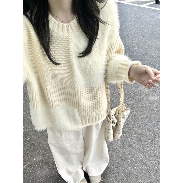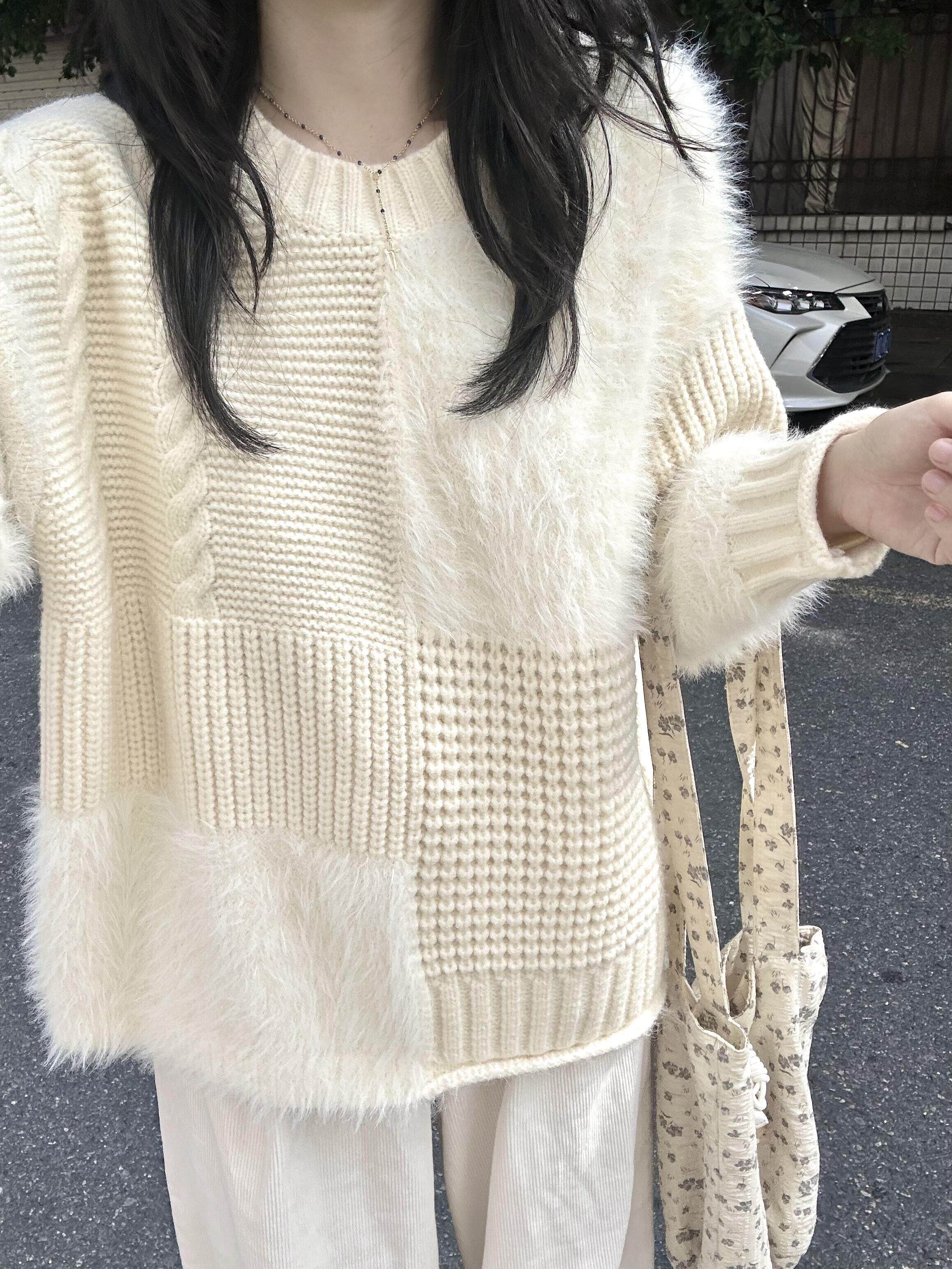 白色拼接水貂絨毛衣女秋冬慵懶高級感冬季設計感韓系寬松針織上衣