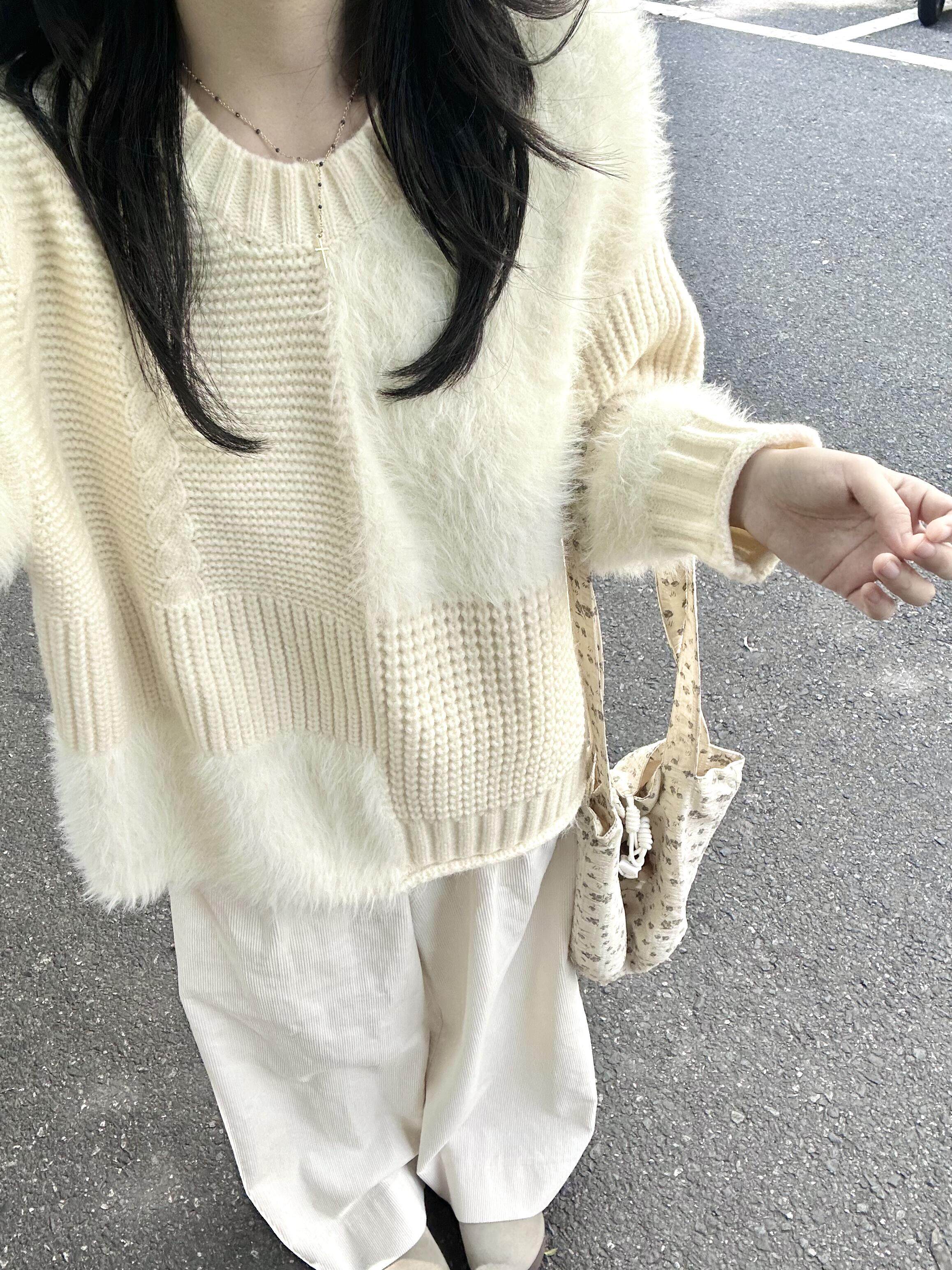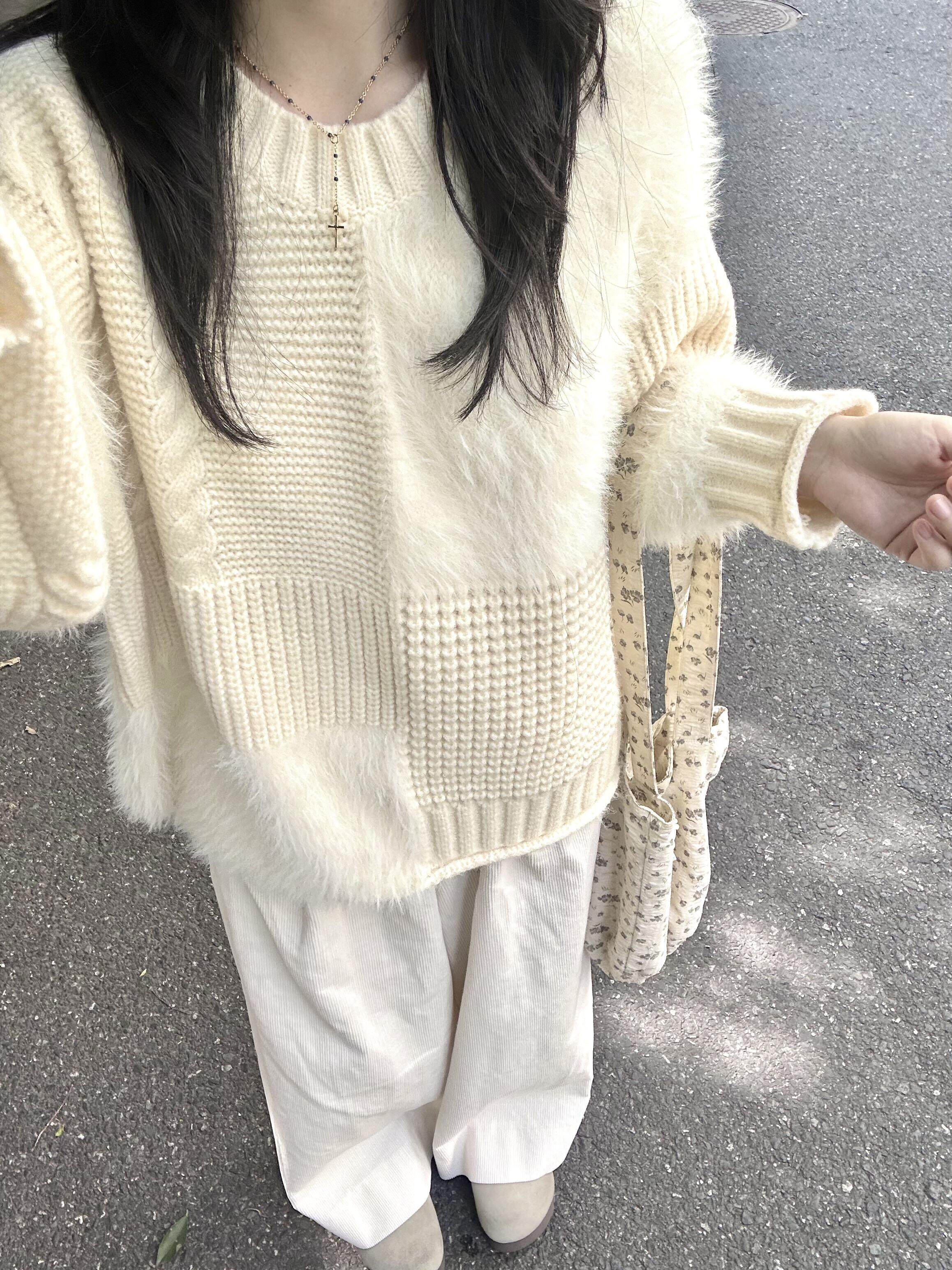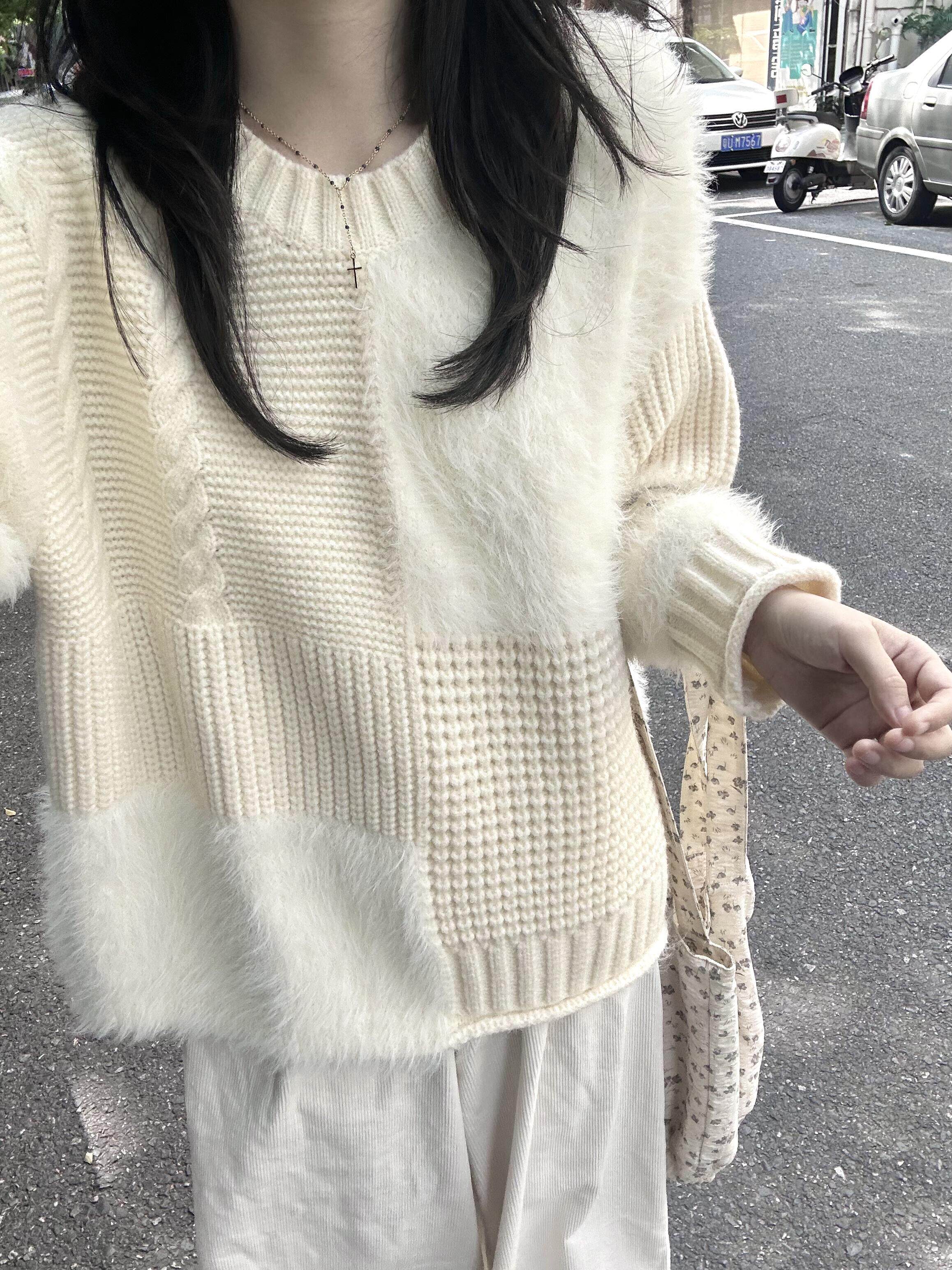 白色拼接水貂絨毛衣女秋冬慵懶高級感冬季設計感韓系寬松針織上衣