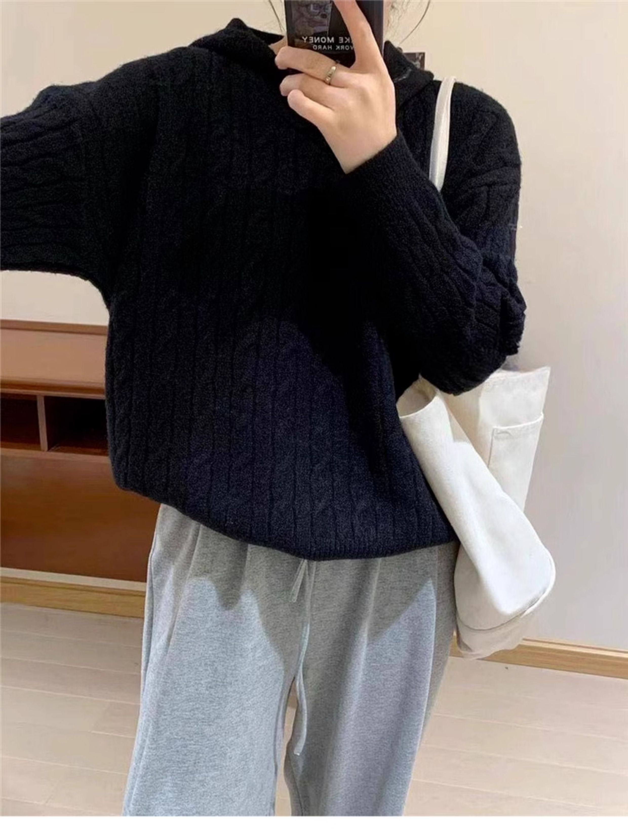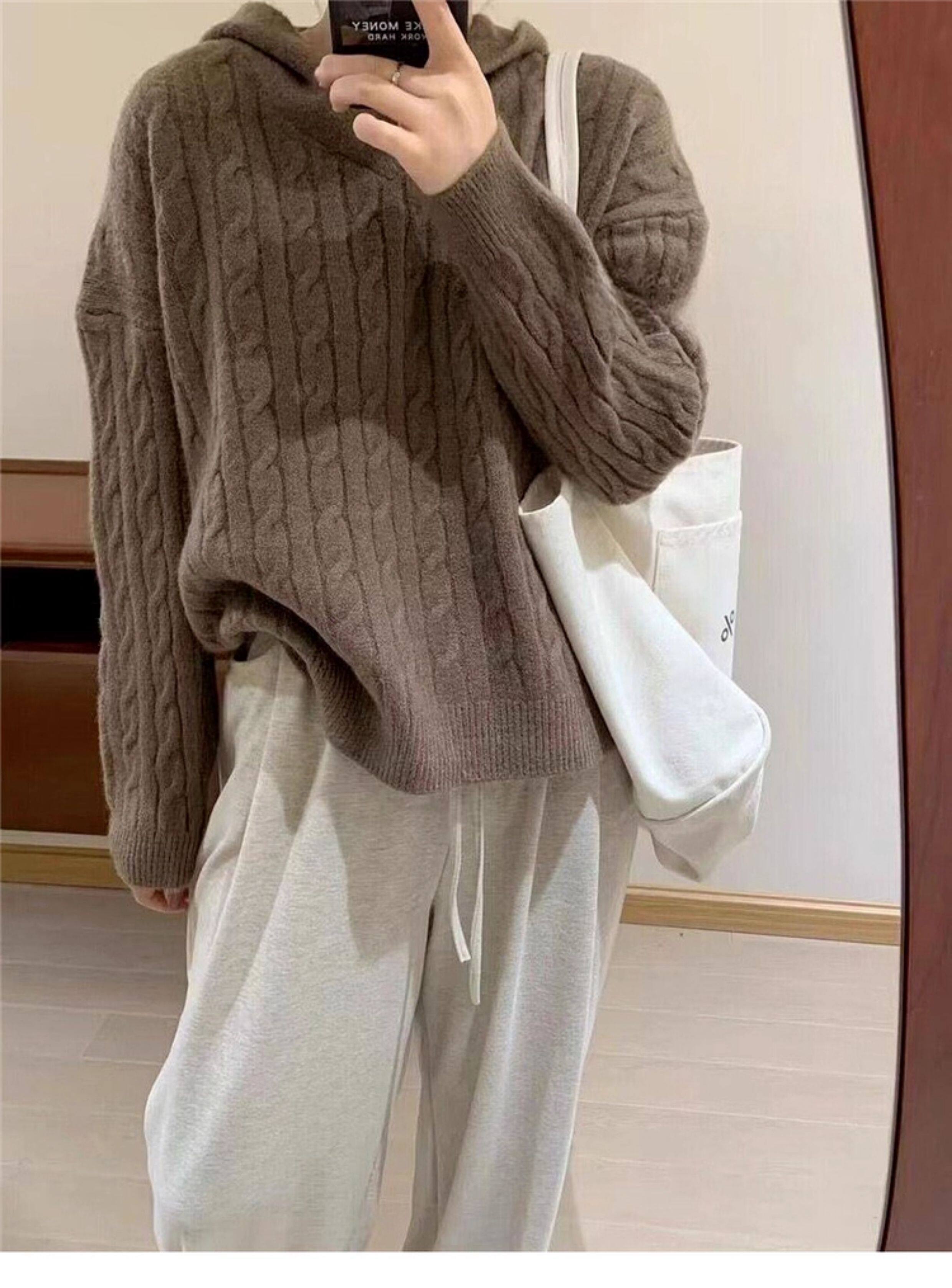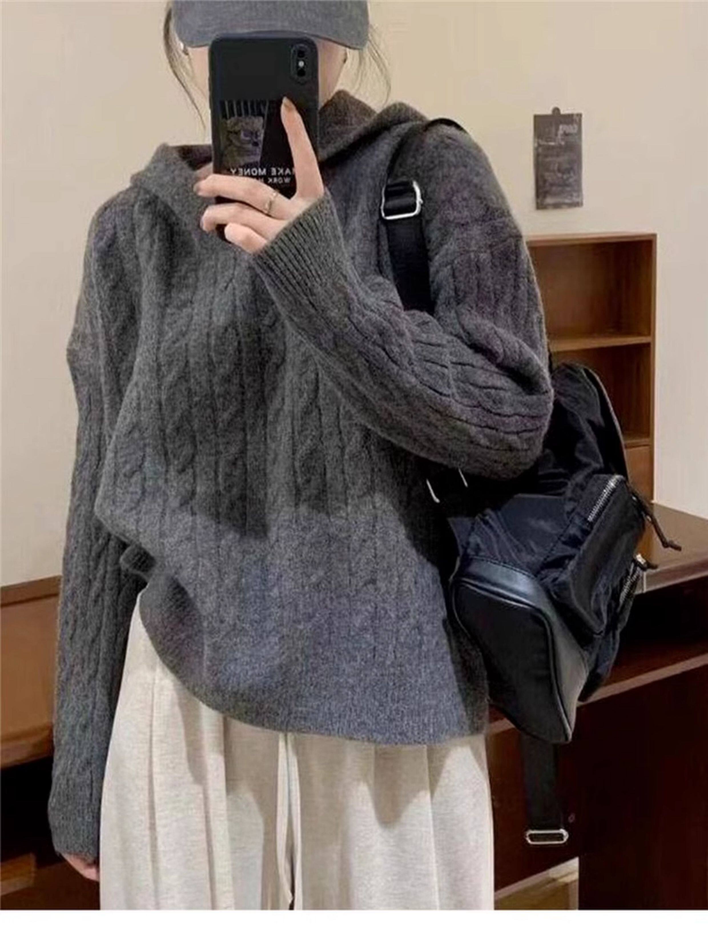 慵懶風復古灰色連帽針織毛衣女秋冬季2025新款小個子內搭打底上衣