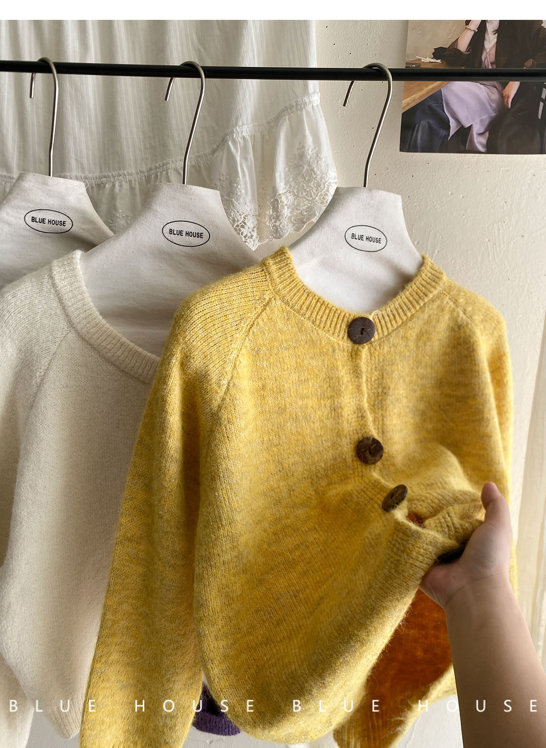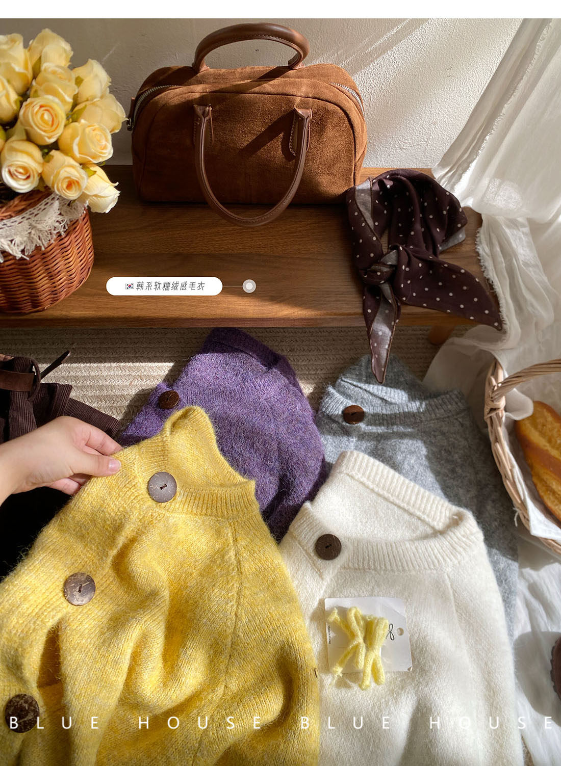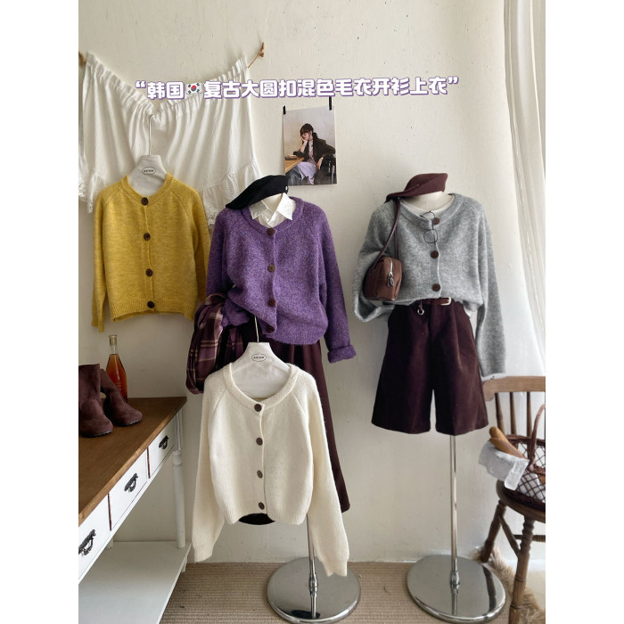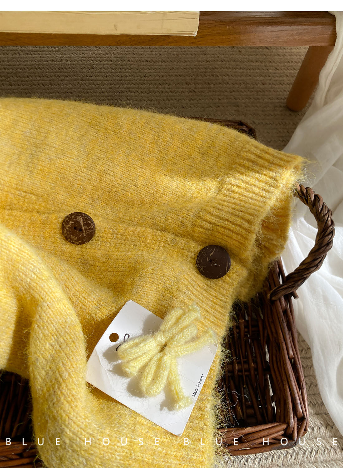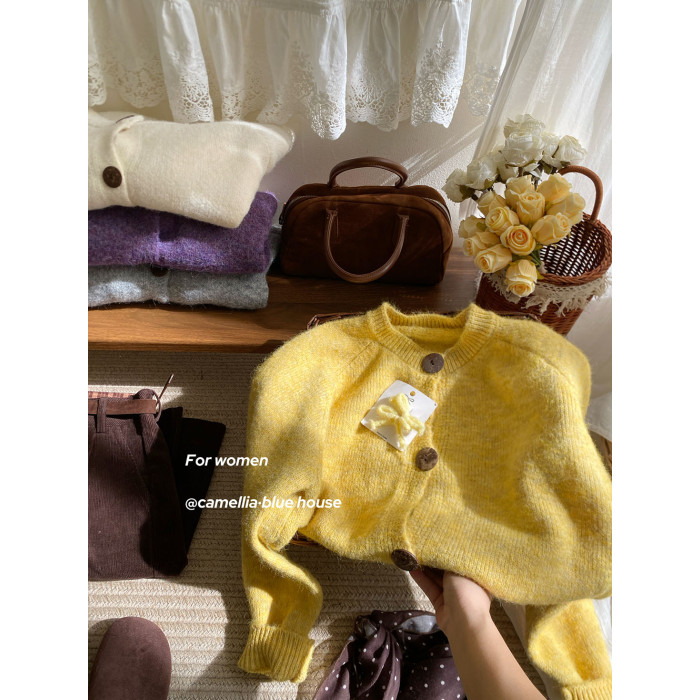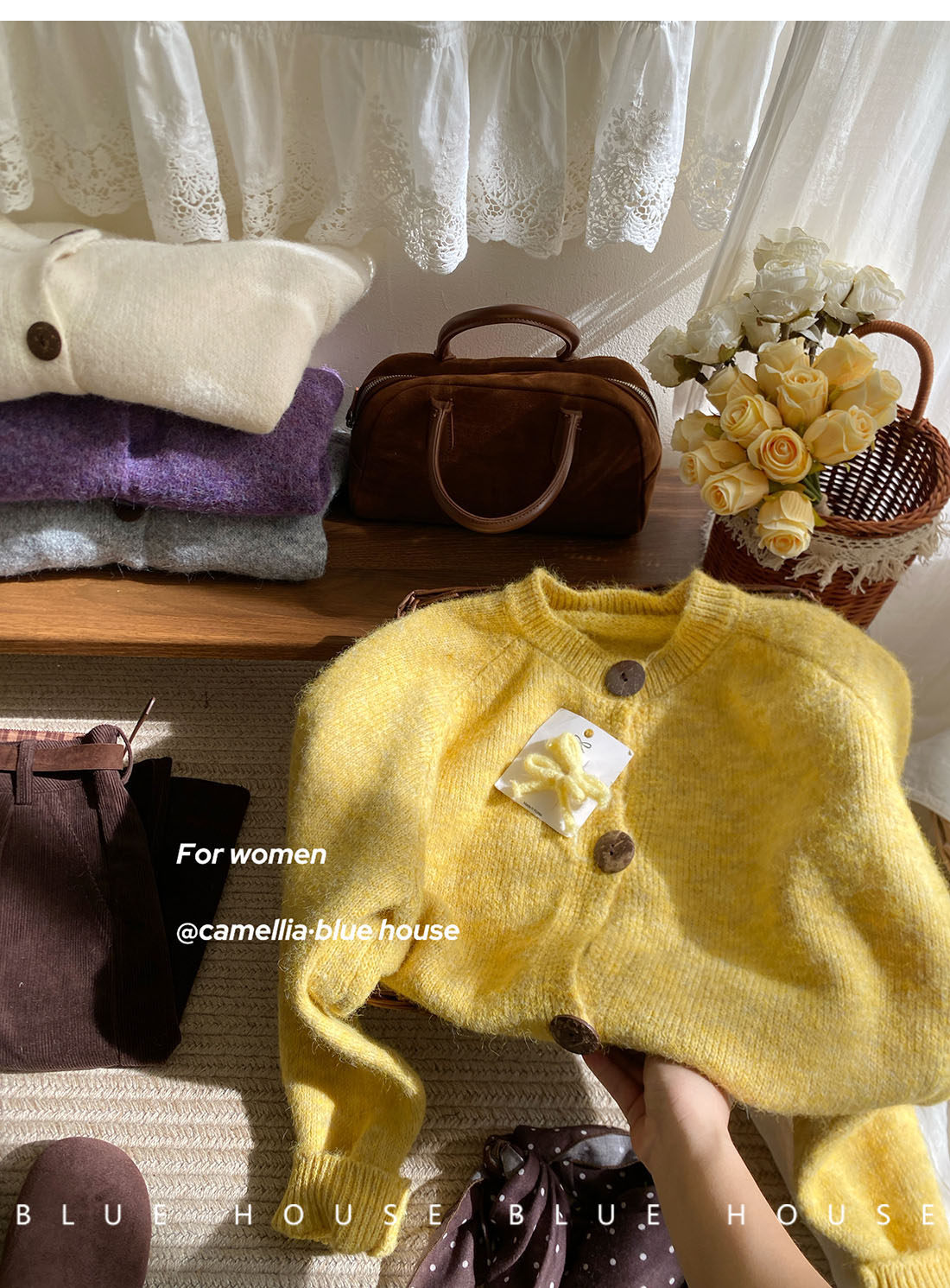 溫柔風黃色圓領針織毛衣女秋復古椰子釦小衆顯瘦休閒毛衣外套上衣