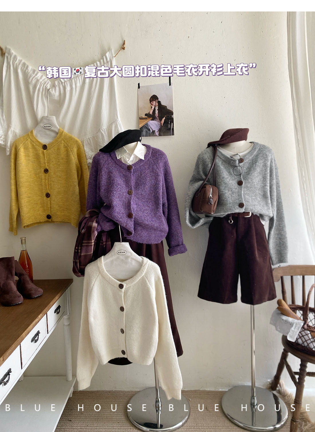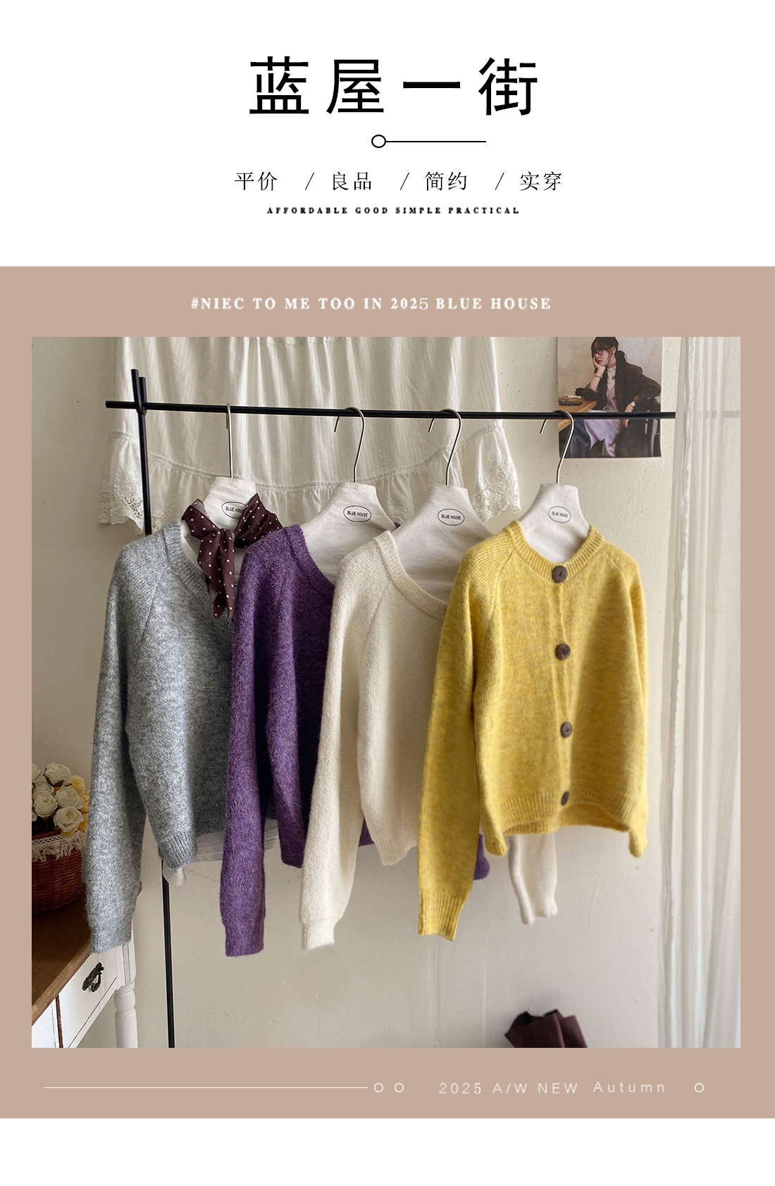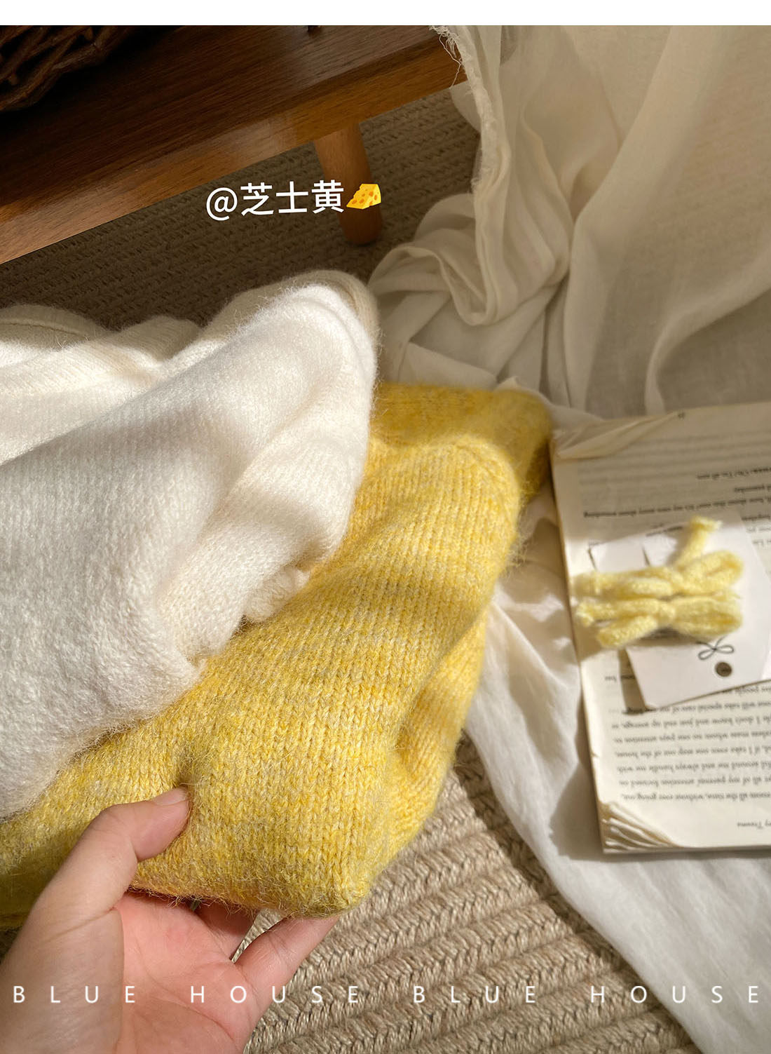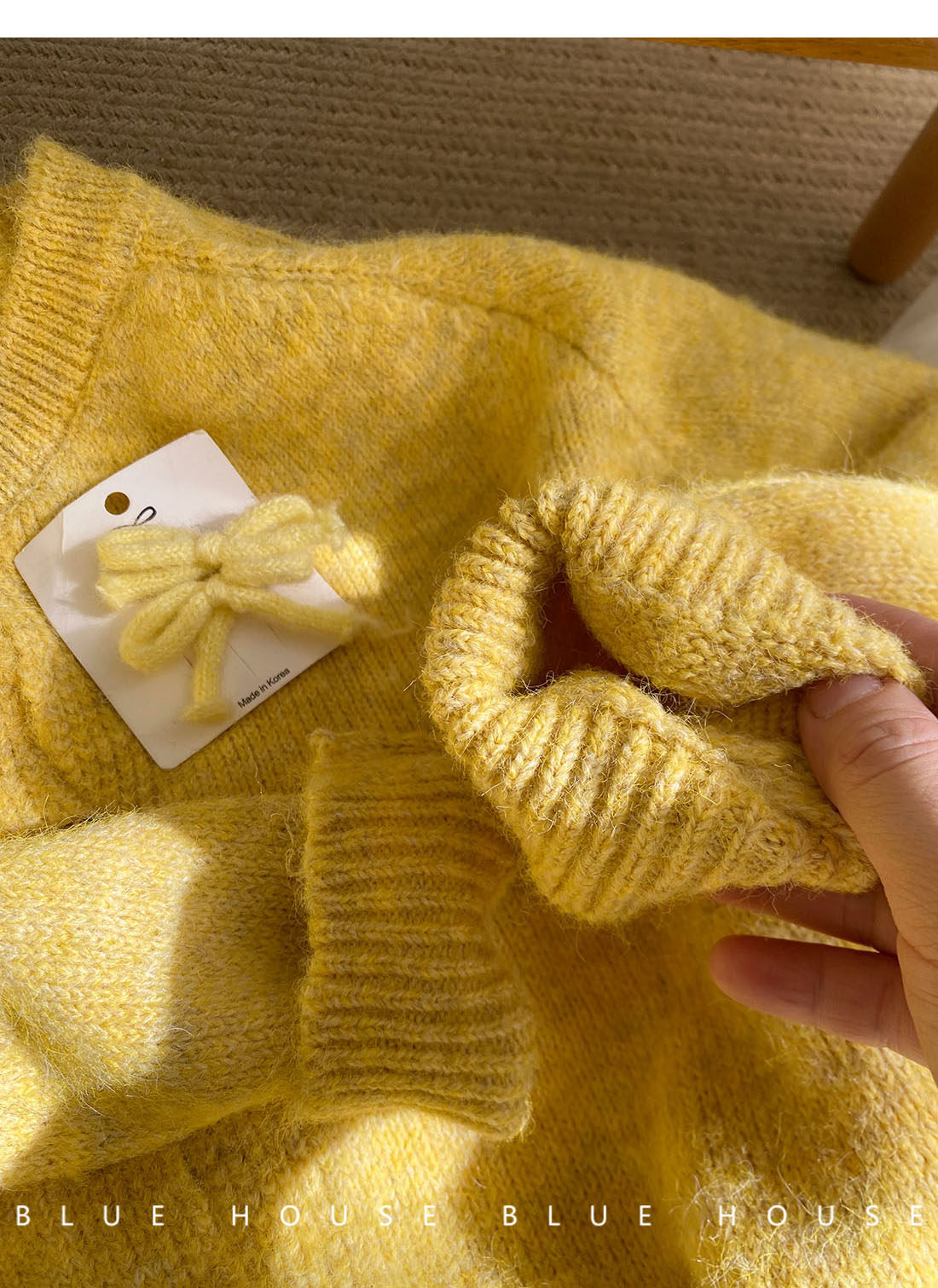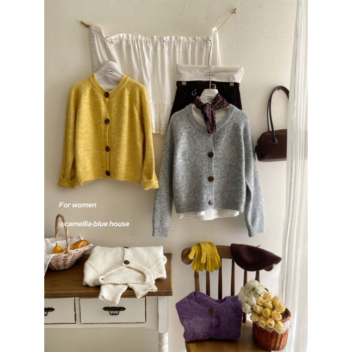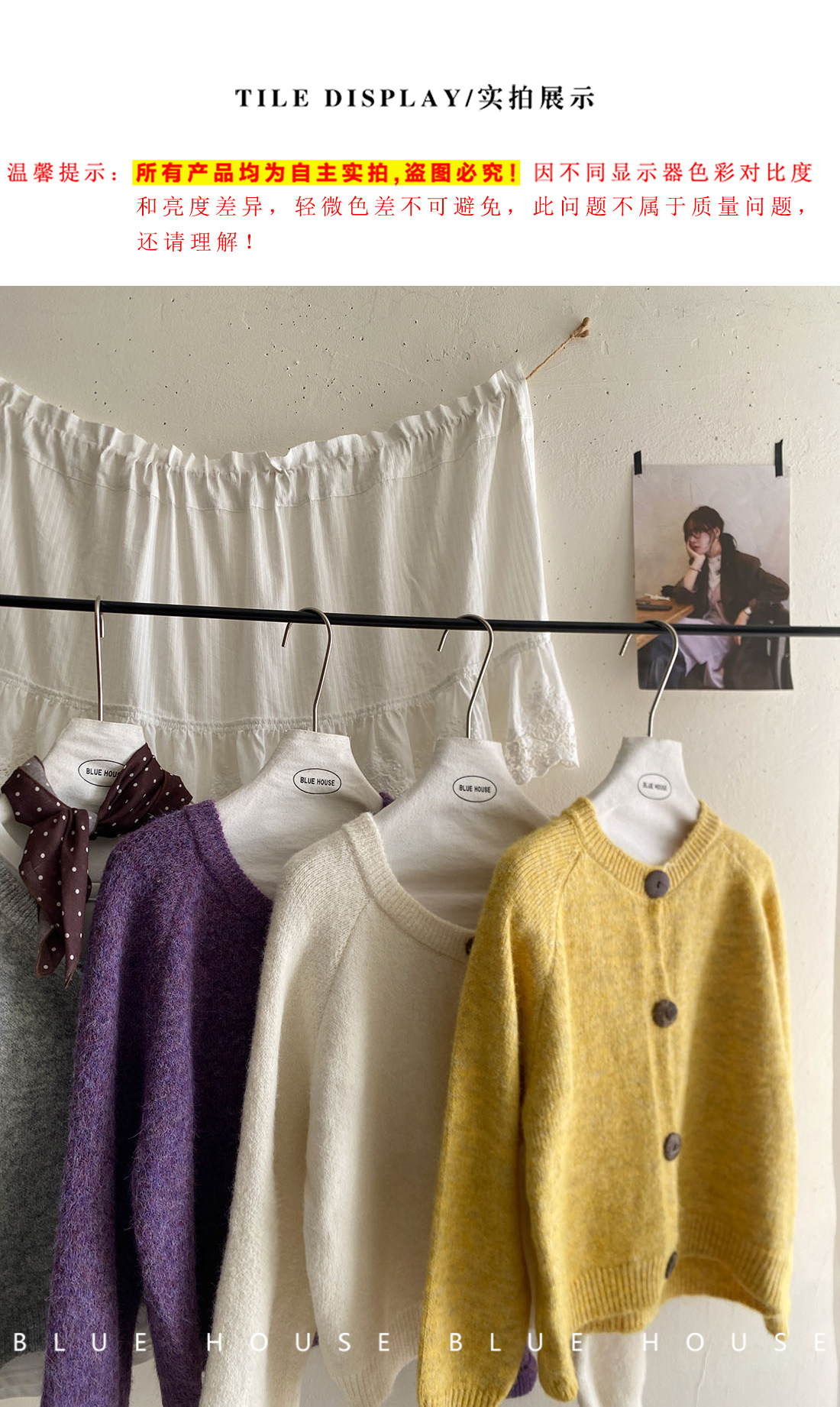 溫柔風黃色圓領針織毛衣女秋復古椰子釦小衆顯瘦休閒毛衣外套上衣