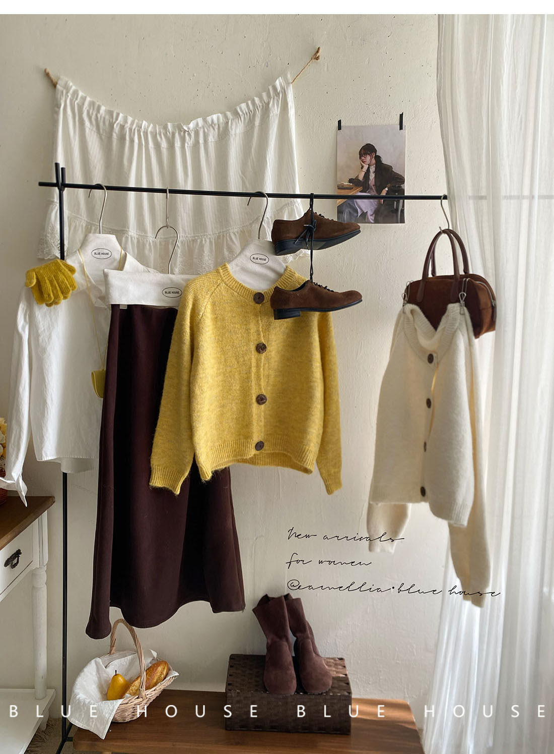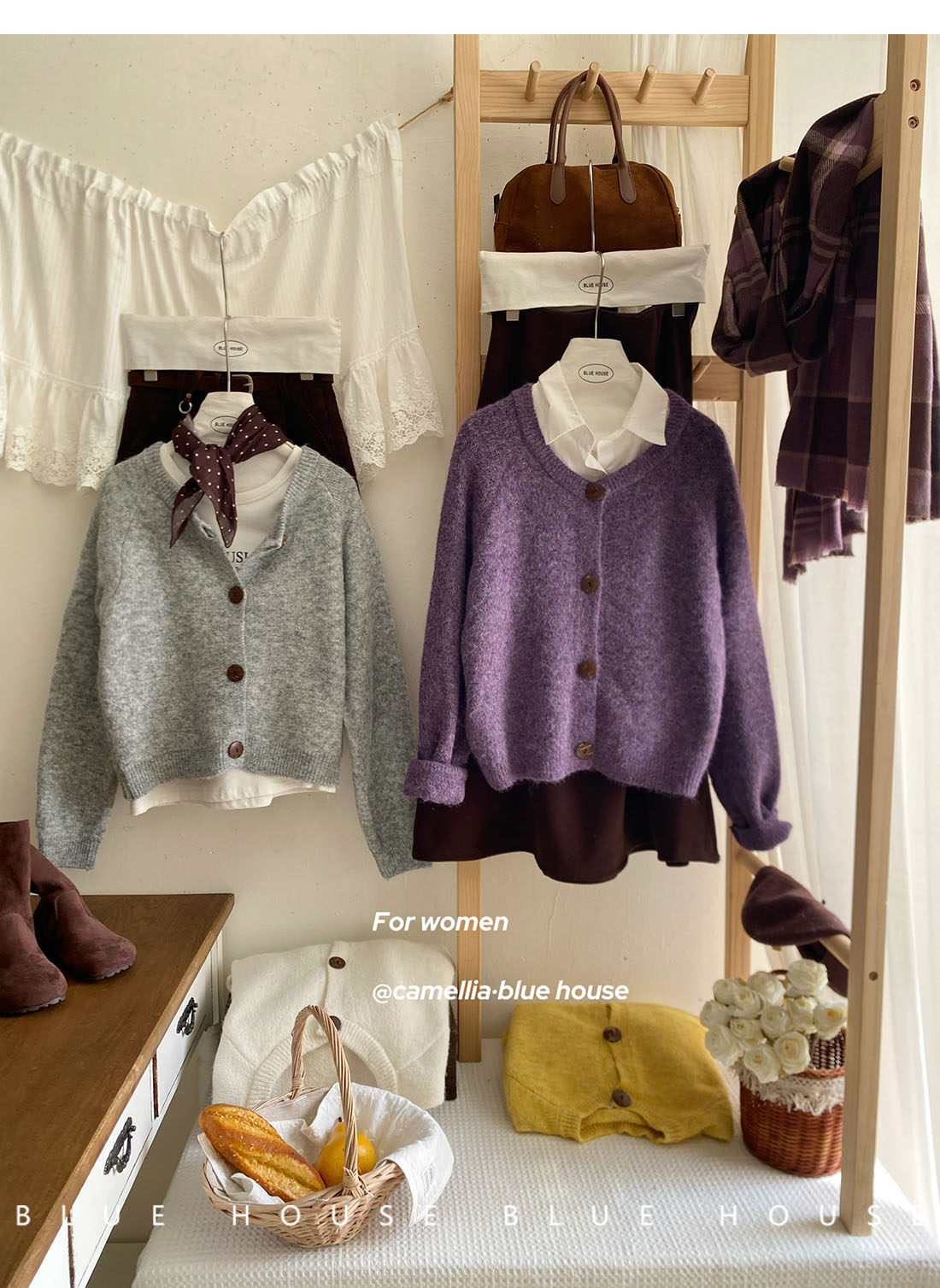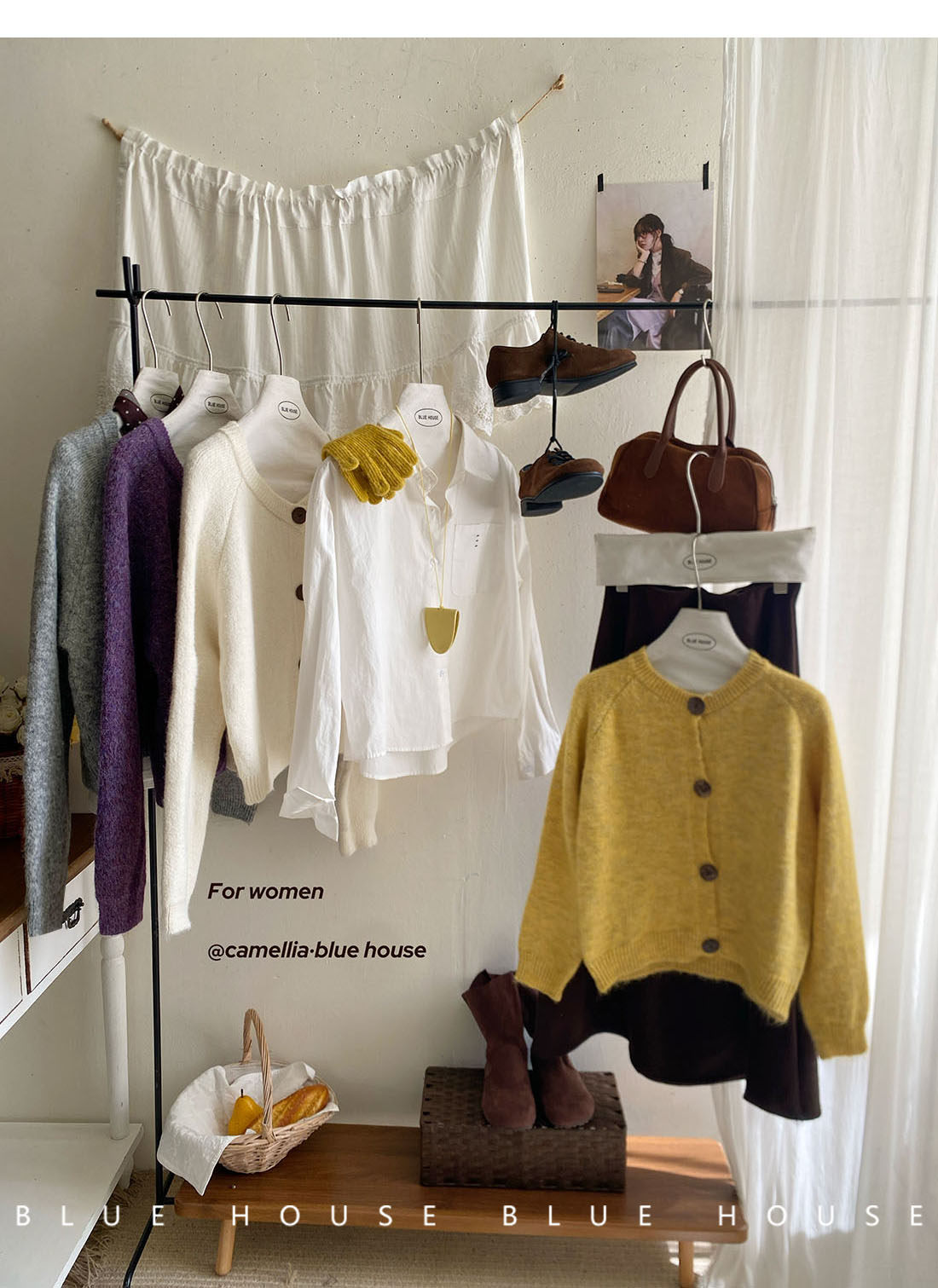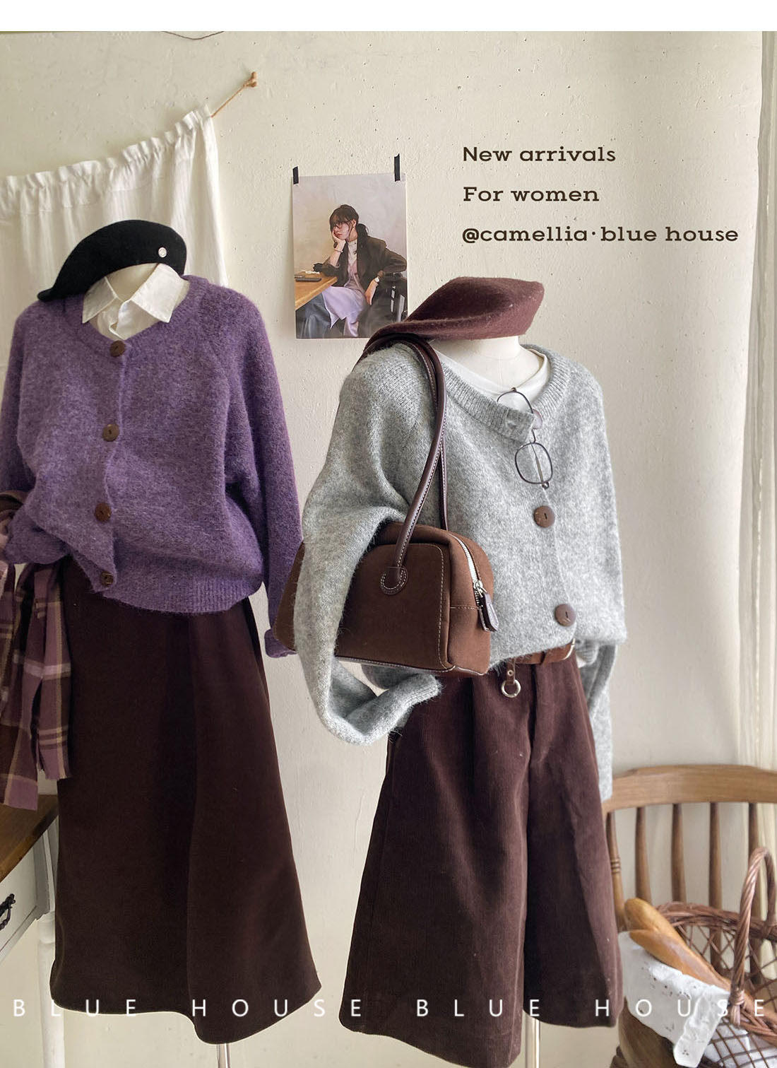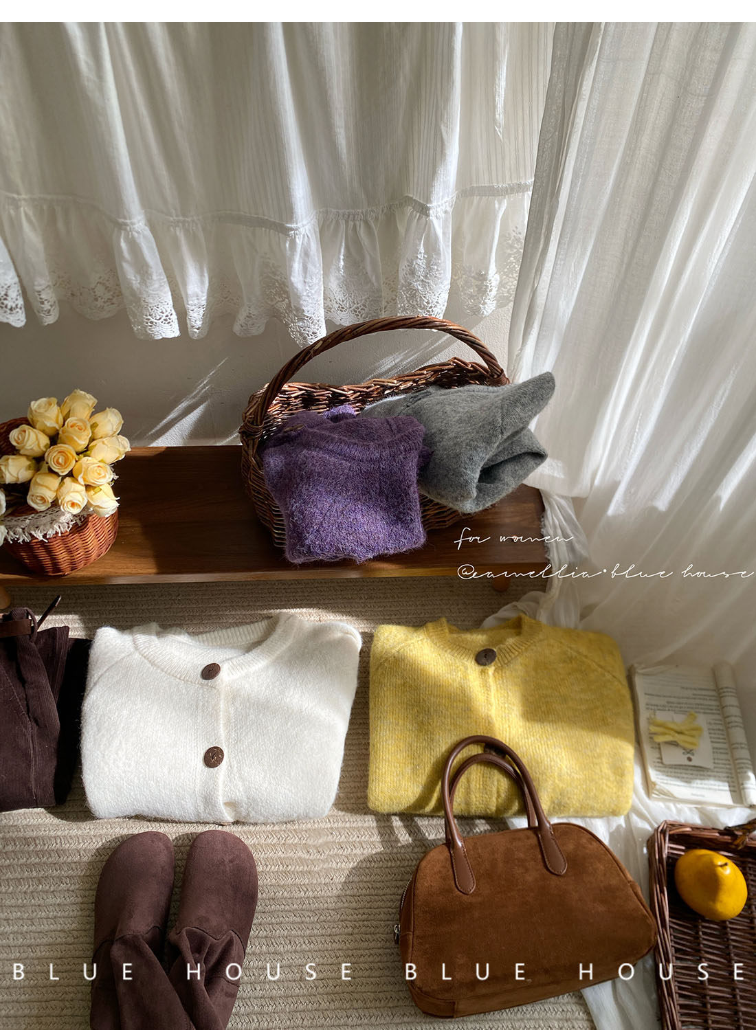 溫柔風黃色圓領針織毛衣女秋復古椰子釦小衆顯瘦休閒毛衣外套上衣