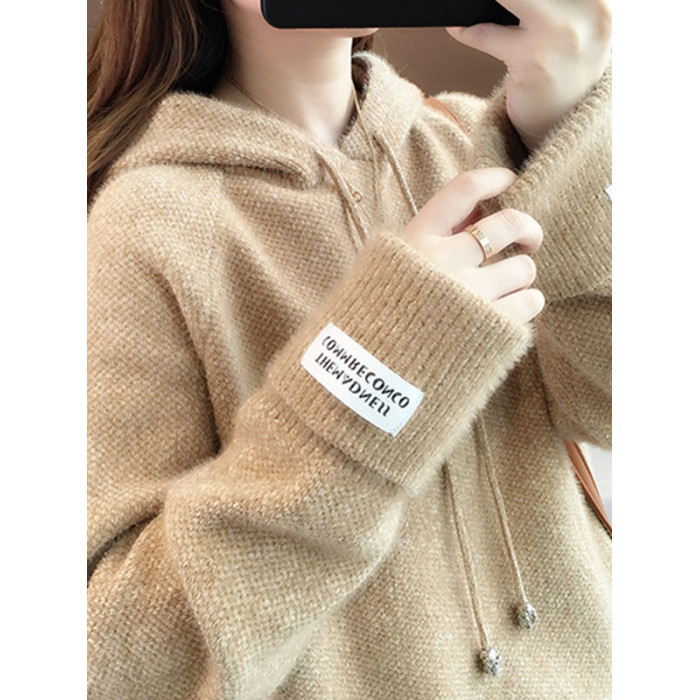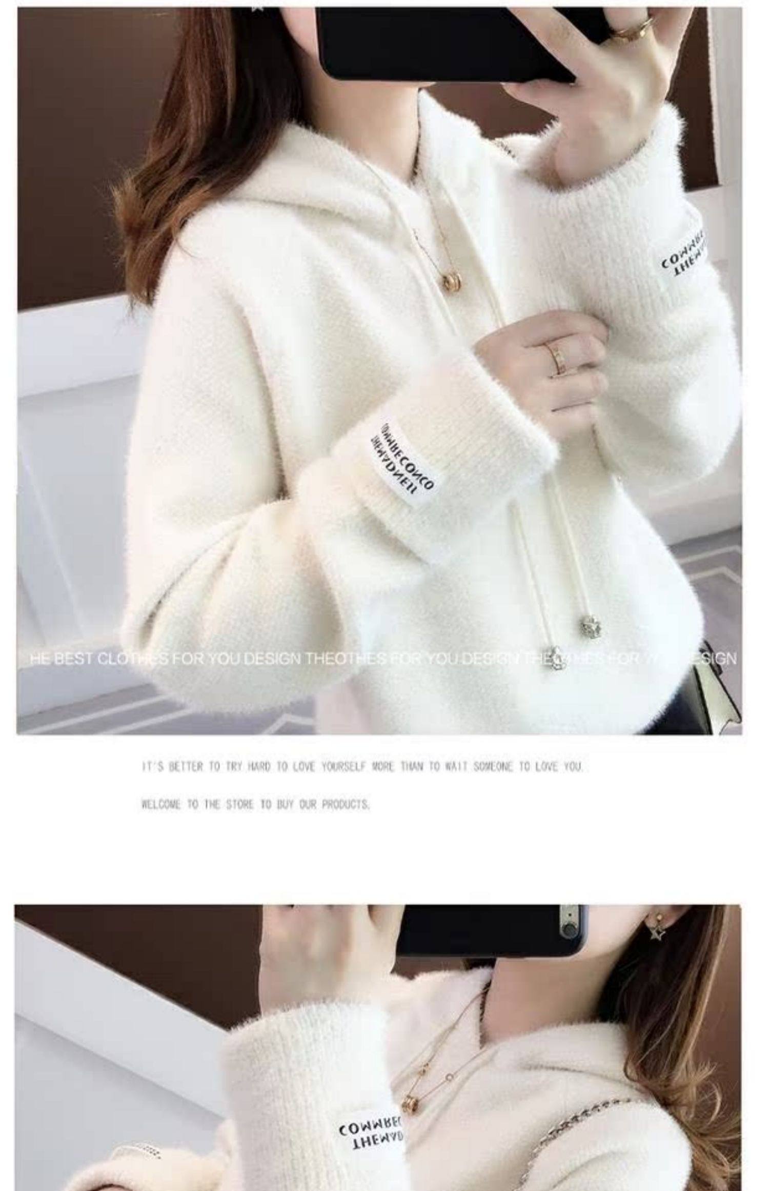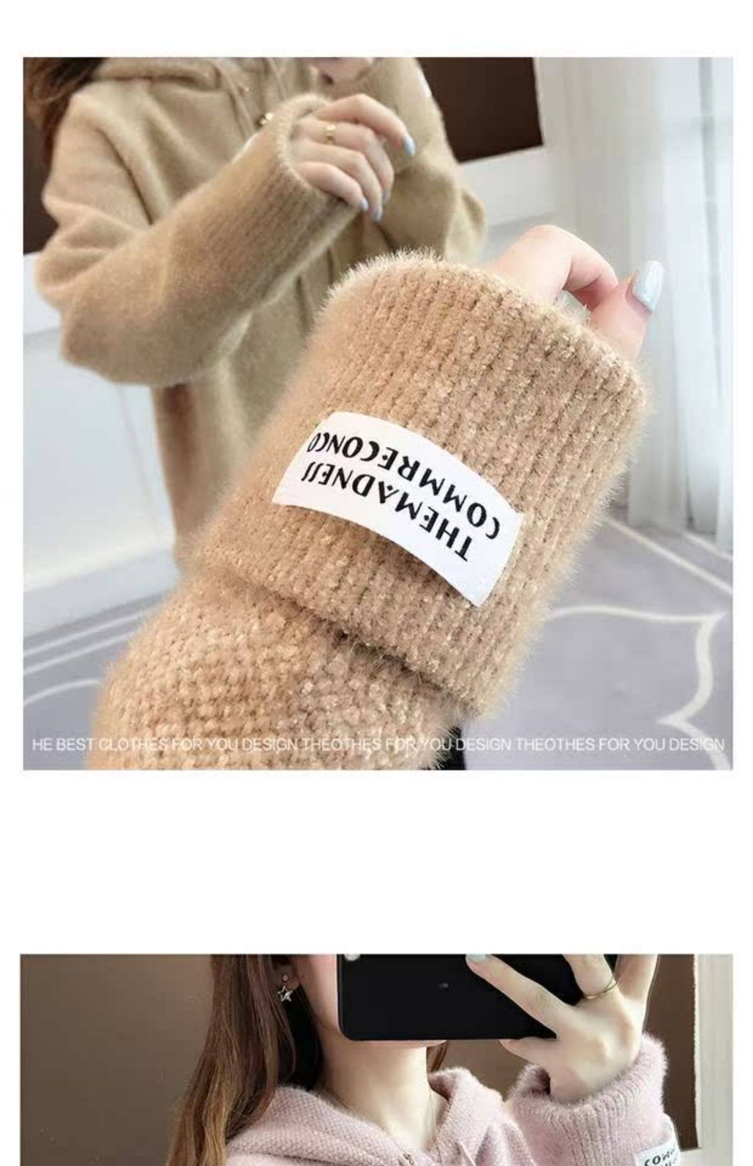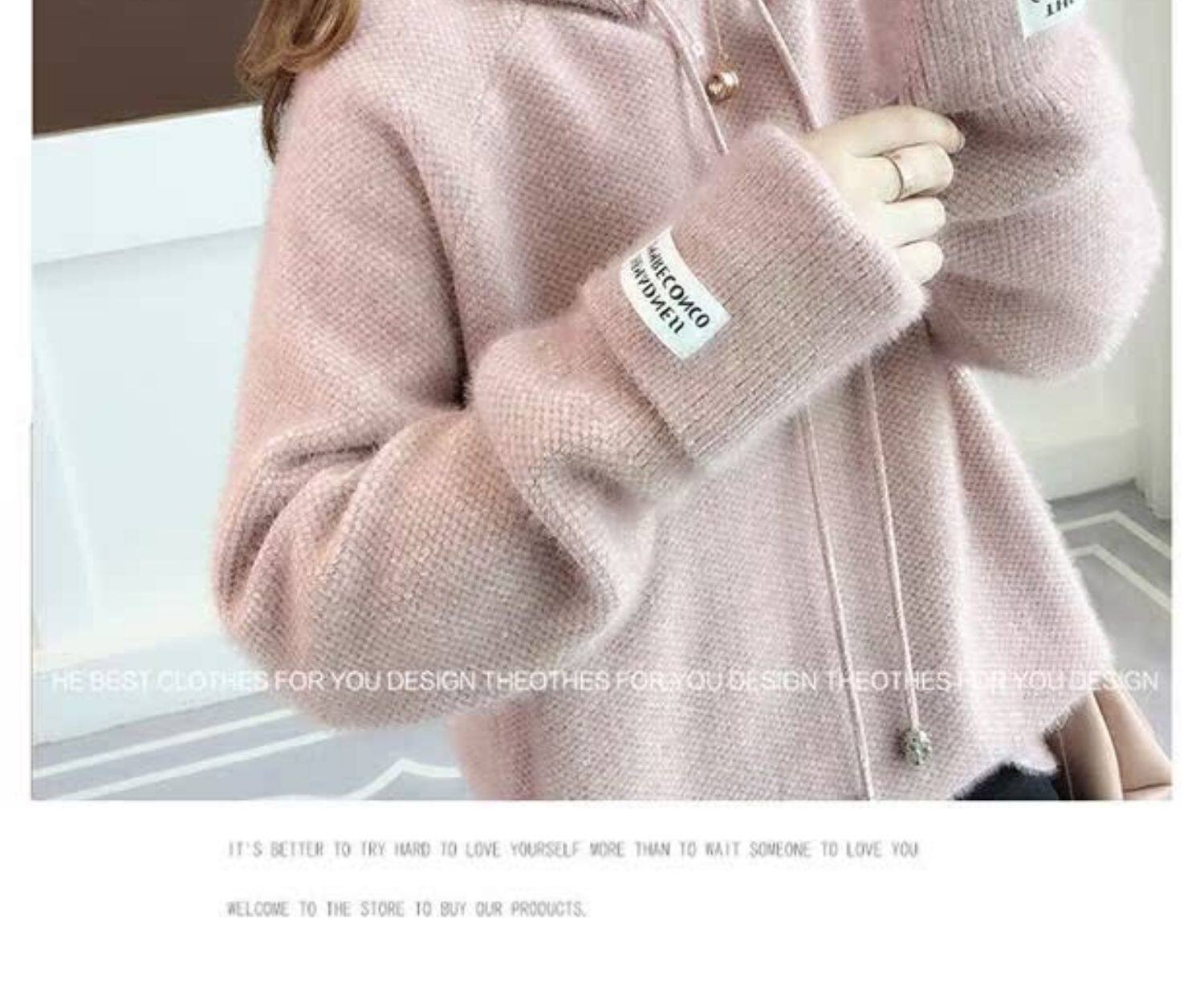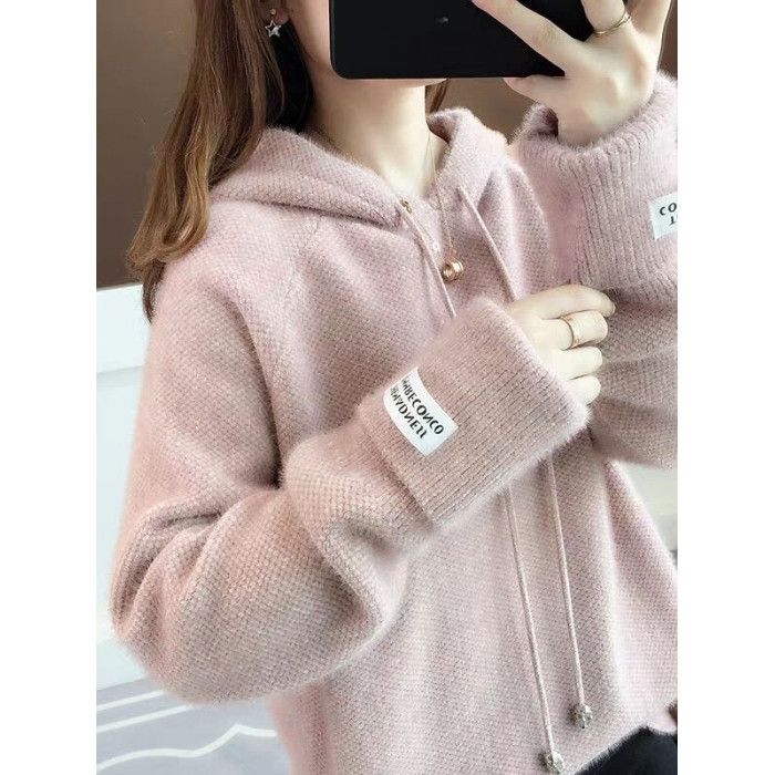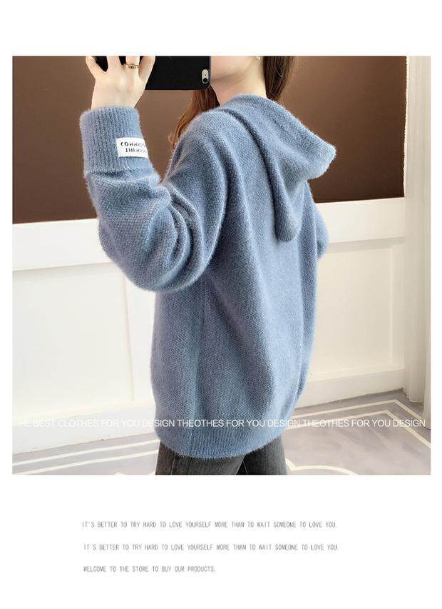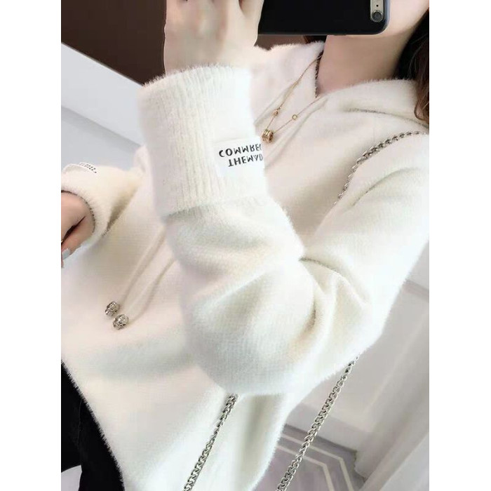 2025春秋新款毛衣女針織打底衫水貂絨寬松慵懶風外穿學生連帽衛衣