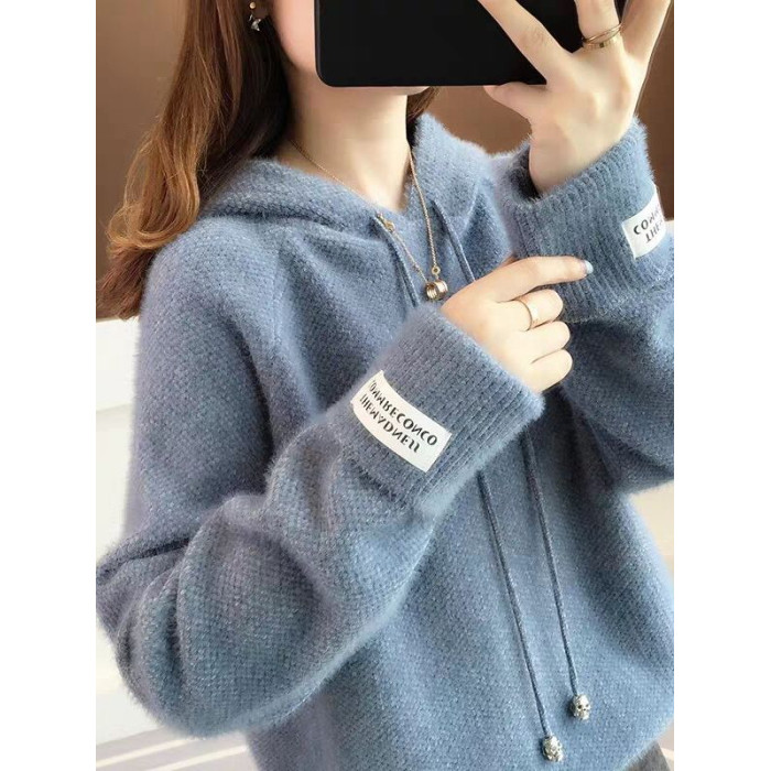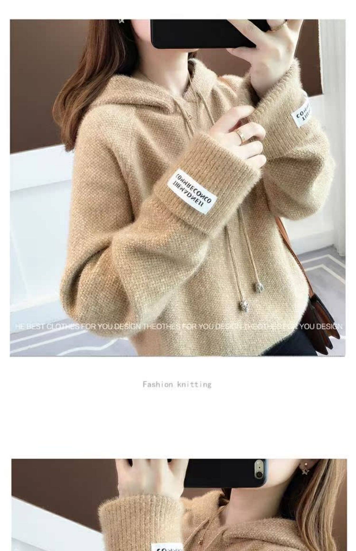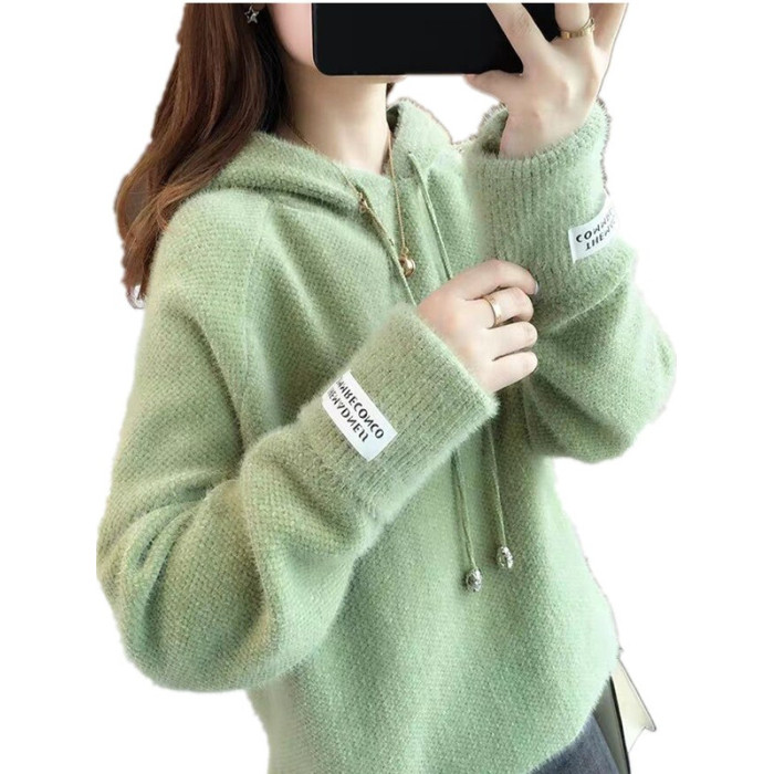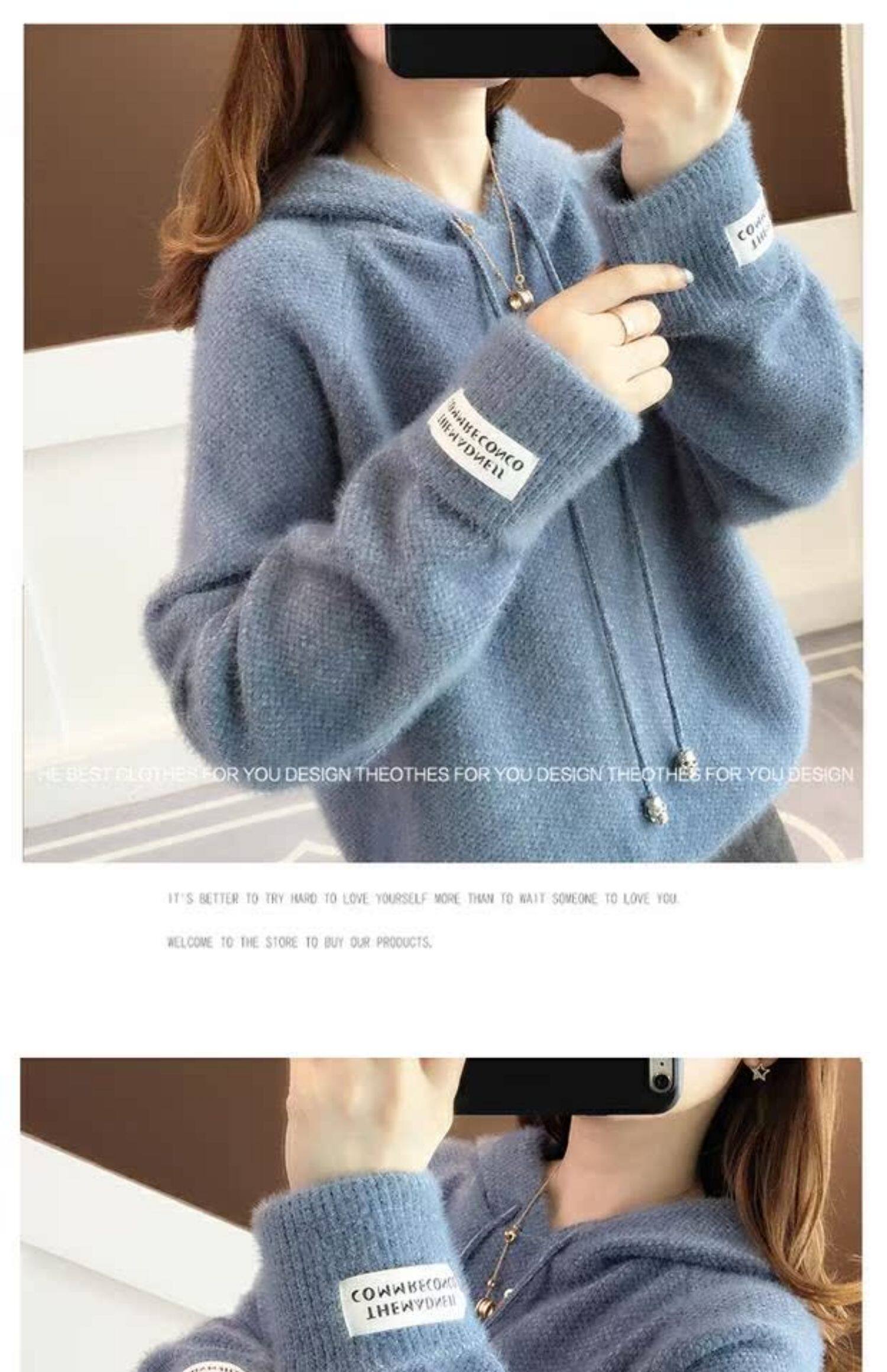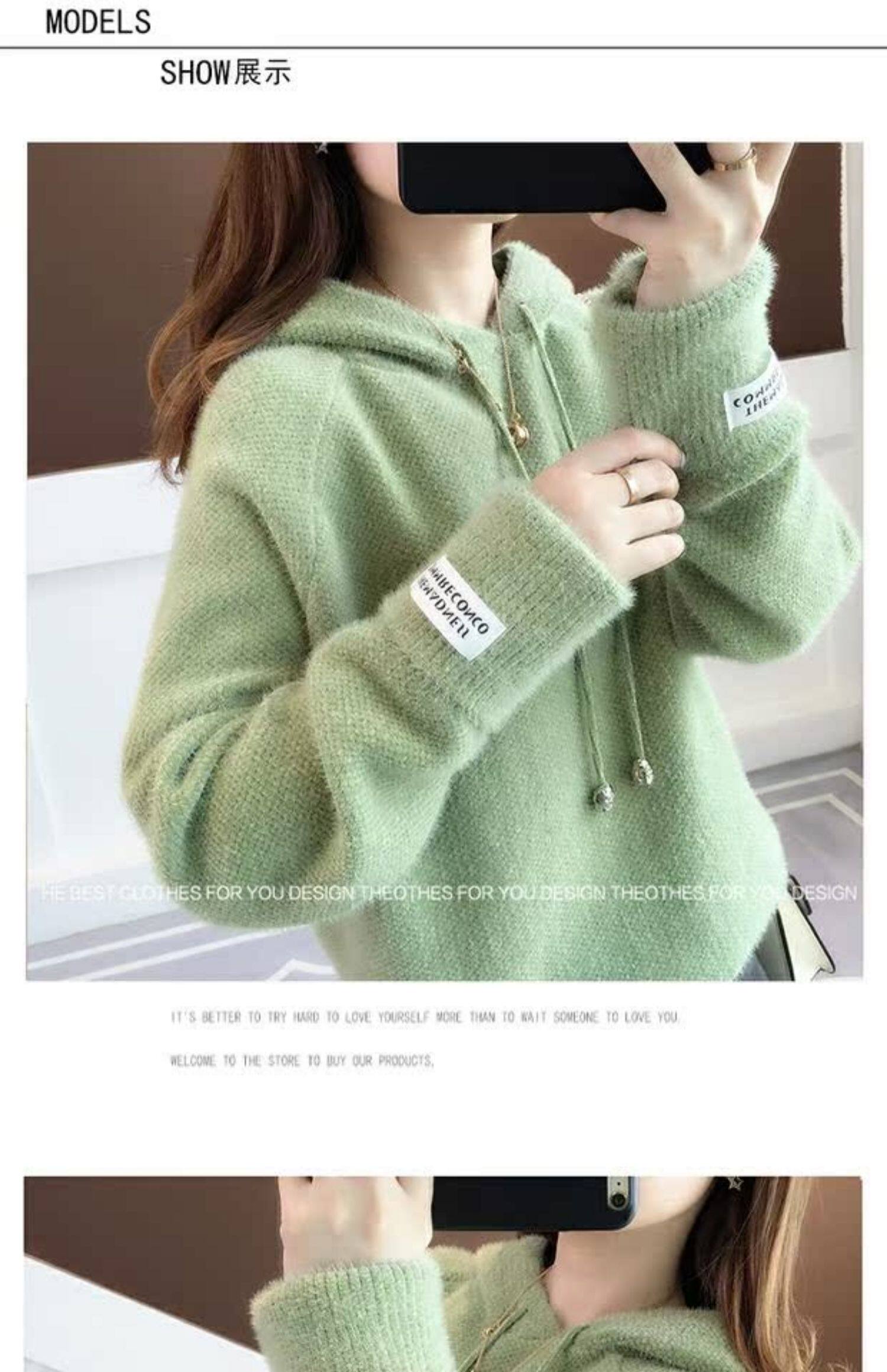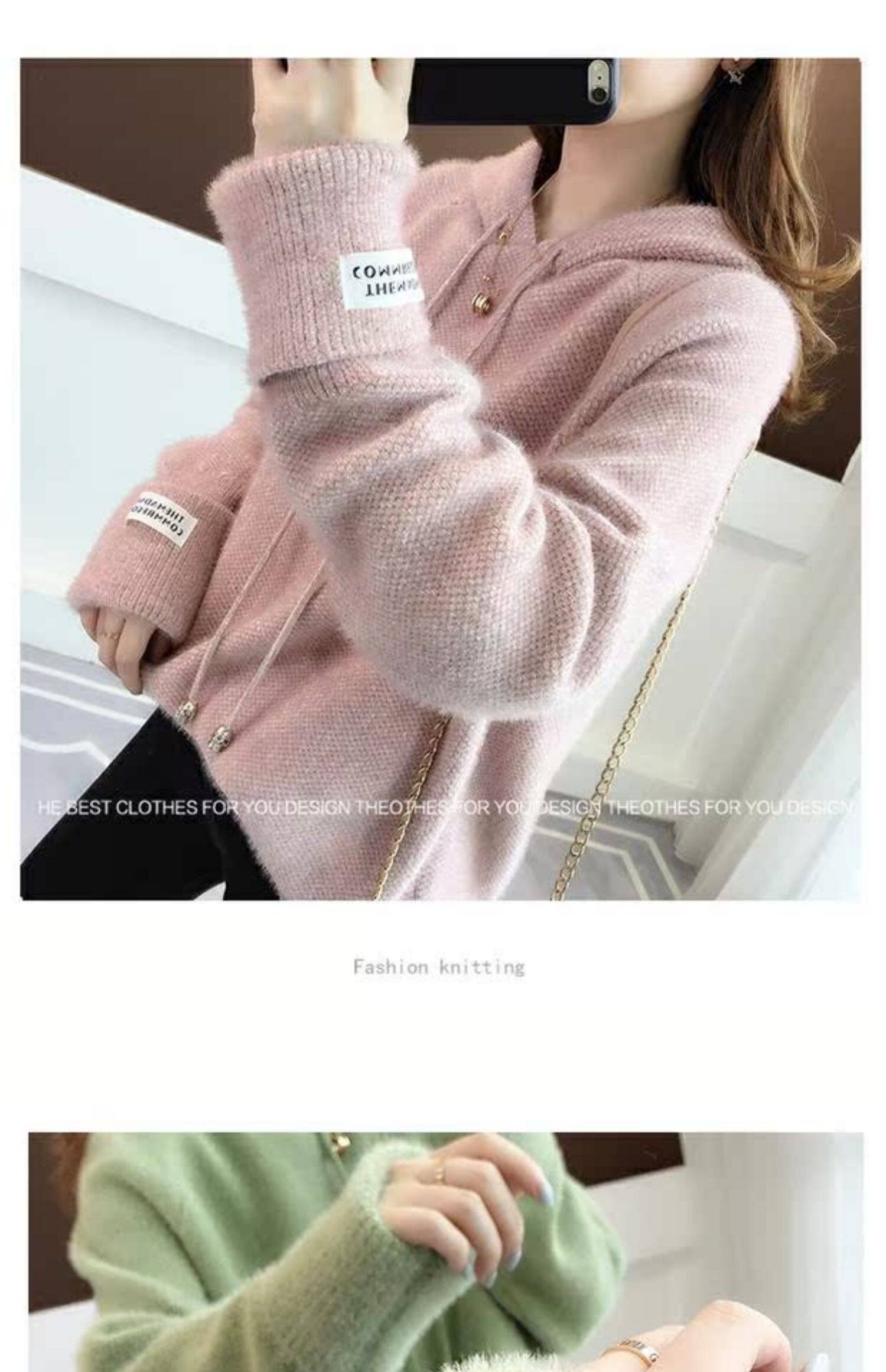 2025春秋新款毛衣女針織打底衫水貂絨寬松慵懶風外穿學生連帽衛衣