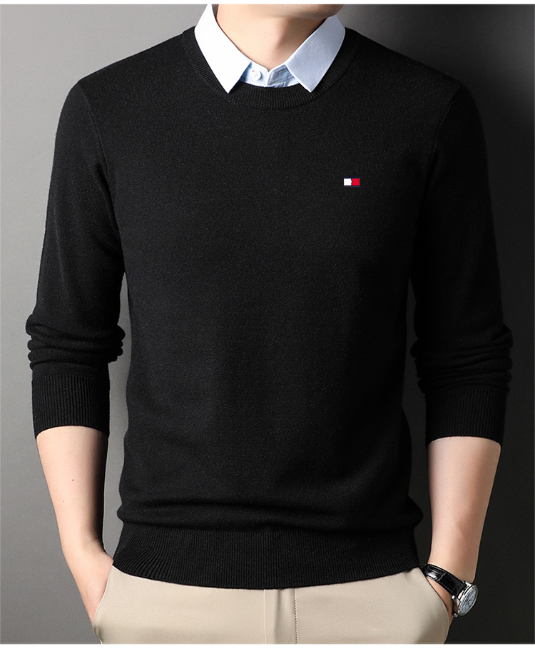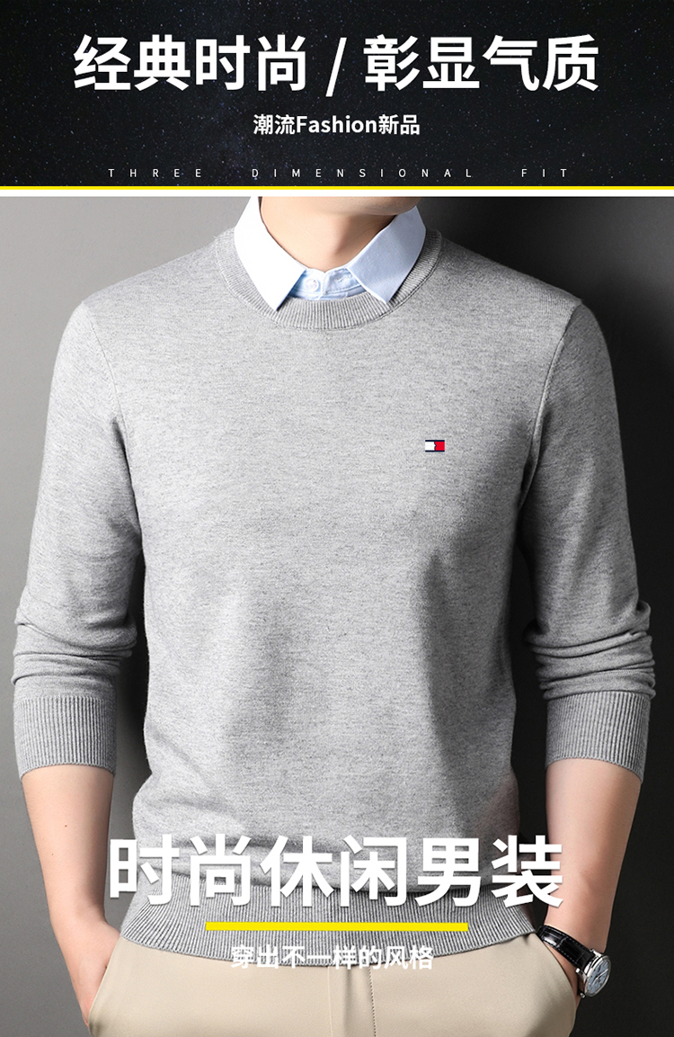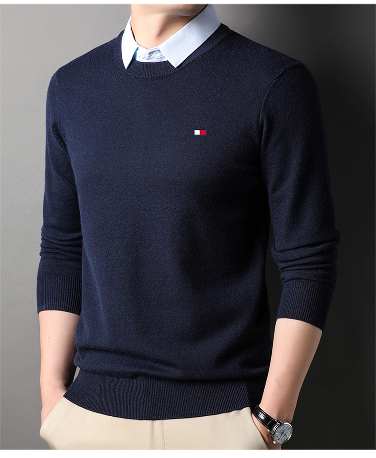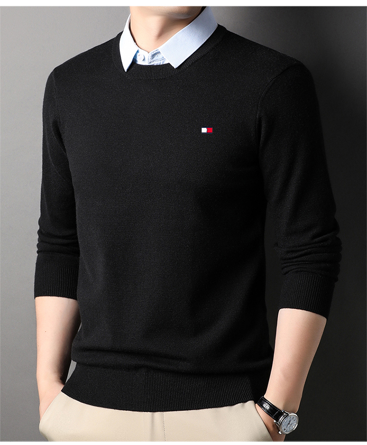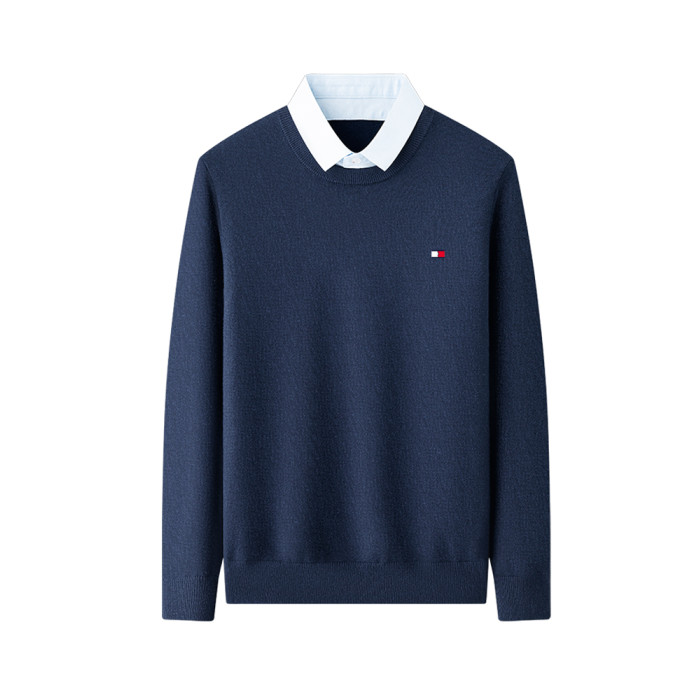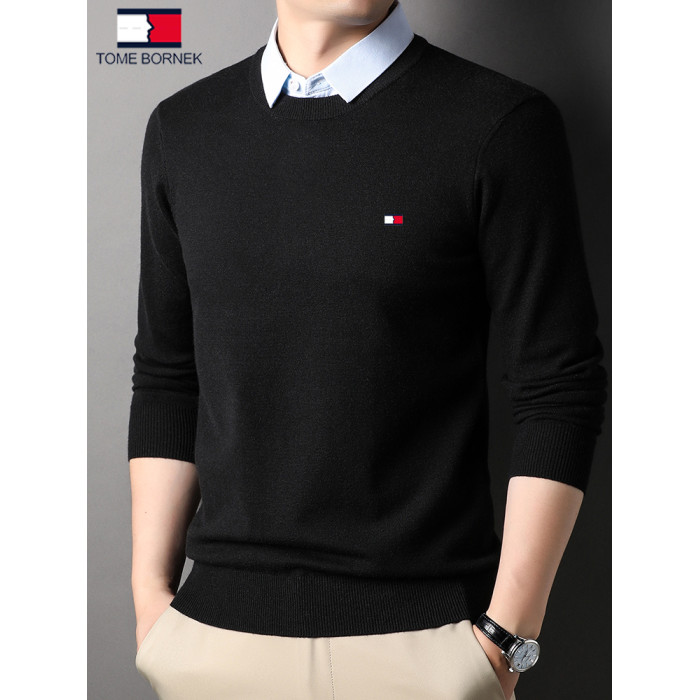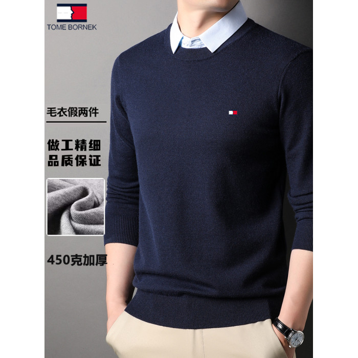 湯米希凱利秋冬季男士假兩件襯衫領毛衣保暖加厚款套頭針織衫休閒