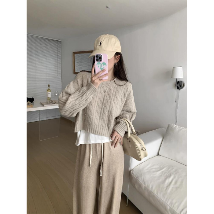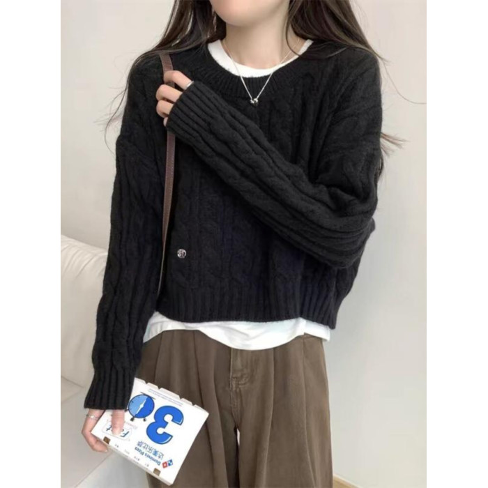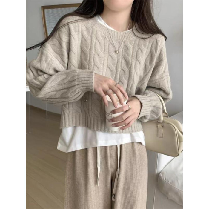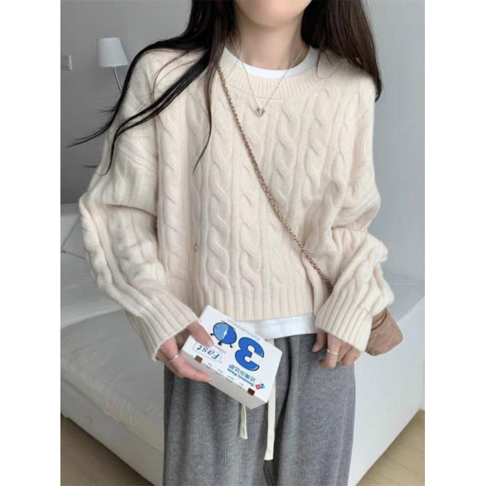 圓領套頭麻花針織衫上衣女裝春秋季新款內搭慵懶軟糯毛衣短款外套