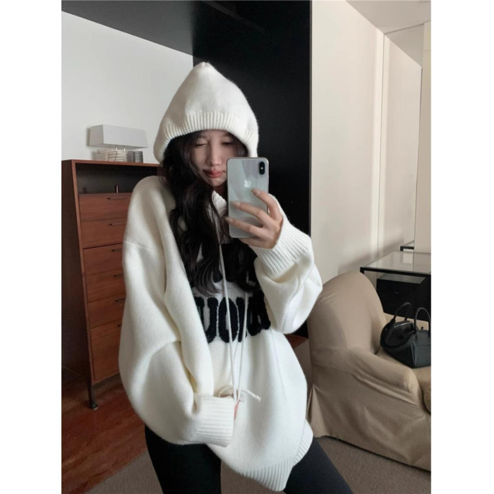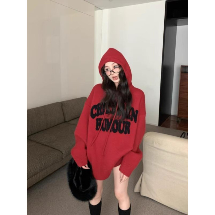 字母刺綉連帽套頭毛衣女秋季復古紅色針織衫慵懶寬松加厚長袖上衣