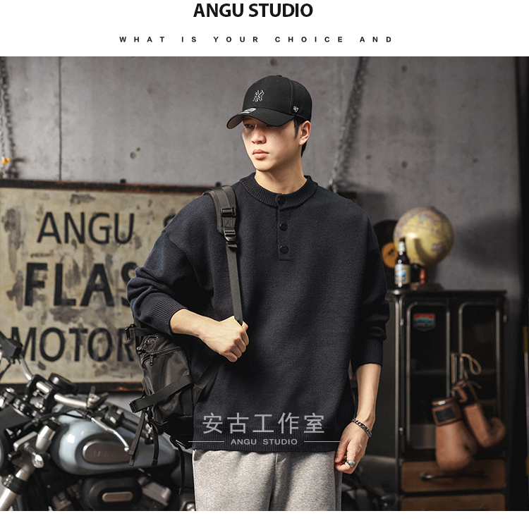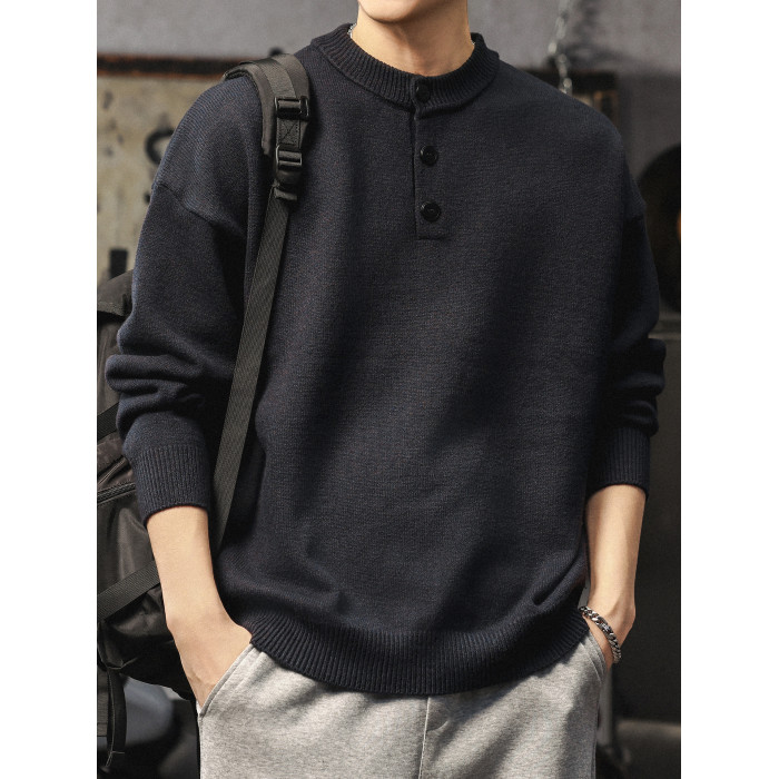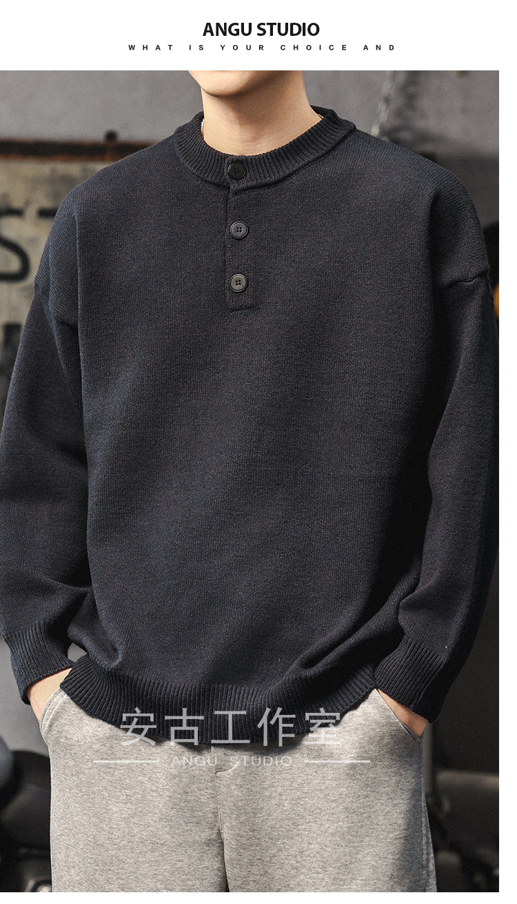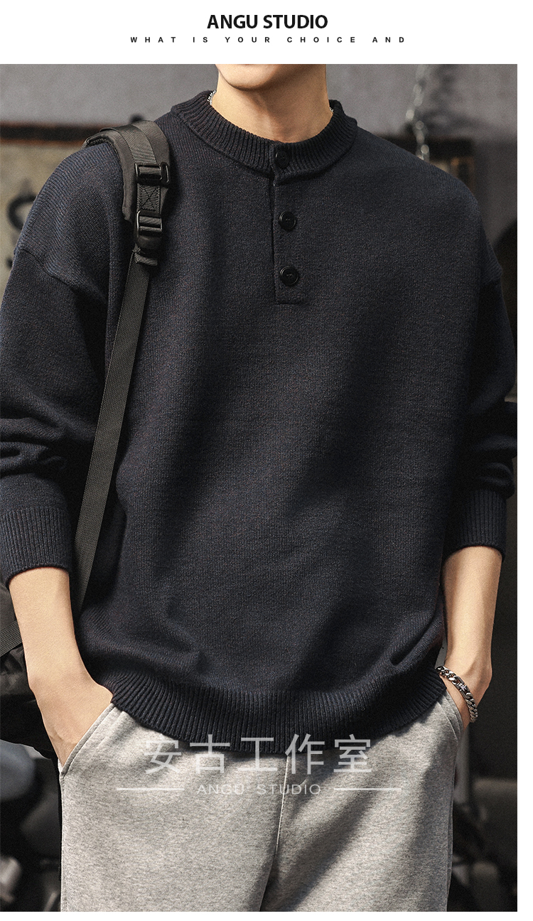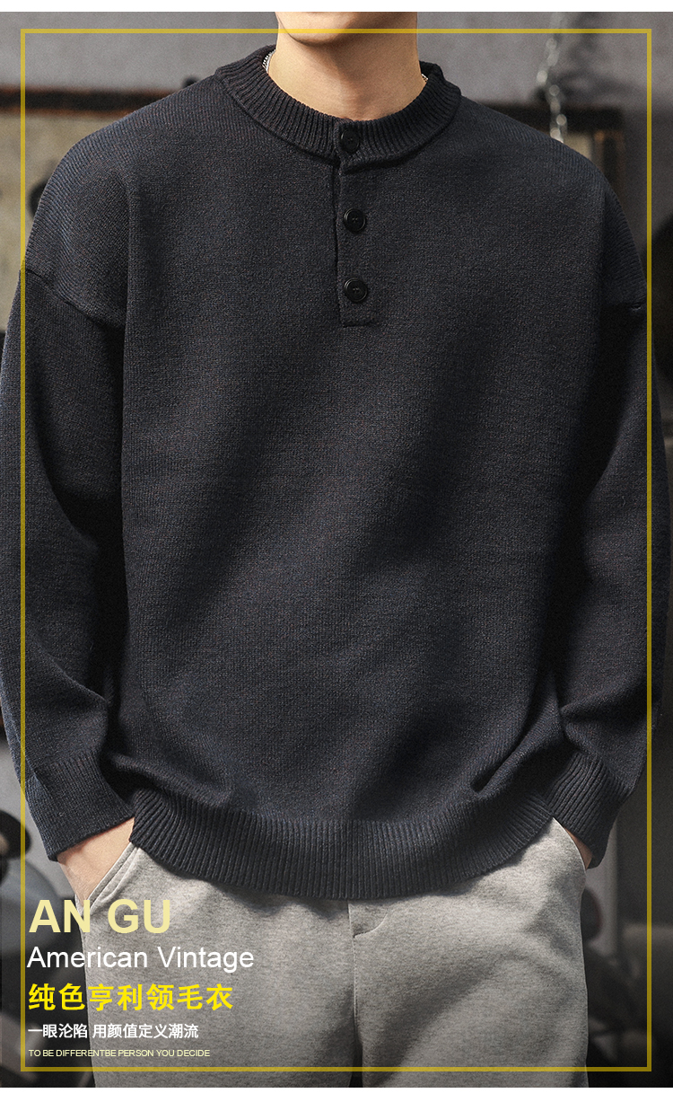 美式復古亨利領毛衣男輕熟風針織衫內搭冬季保暖男士黑色打底衫潮