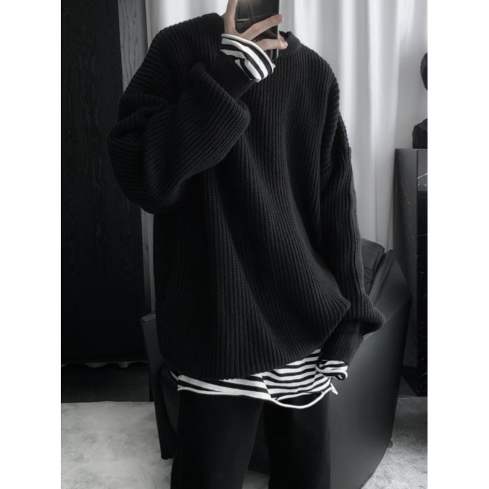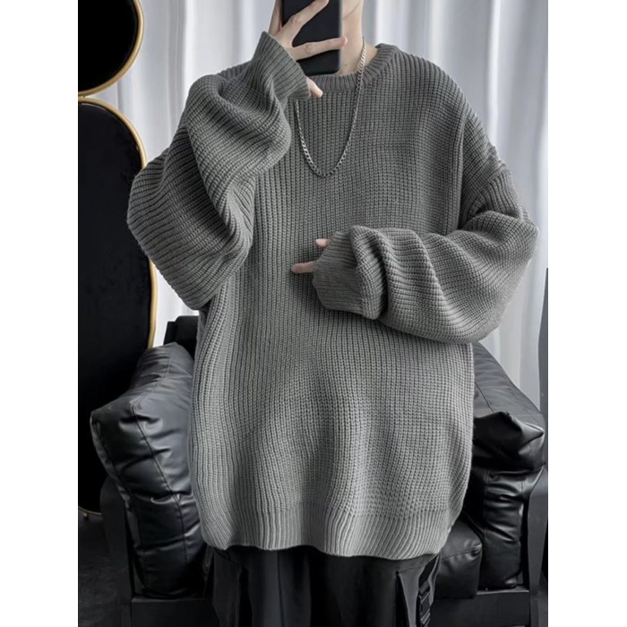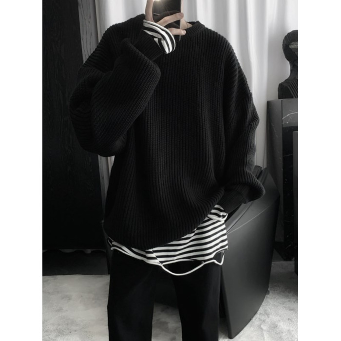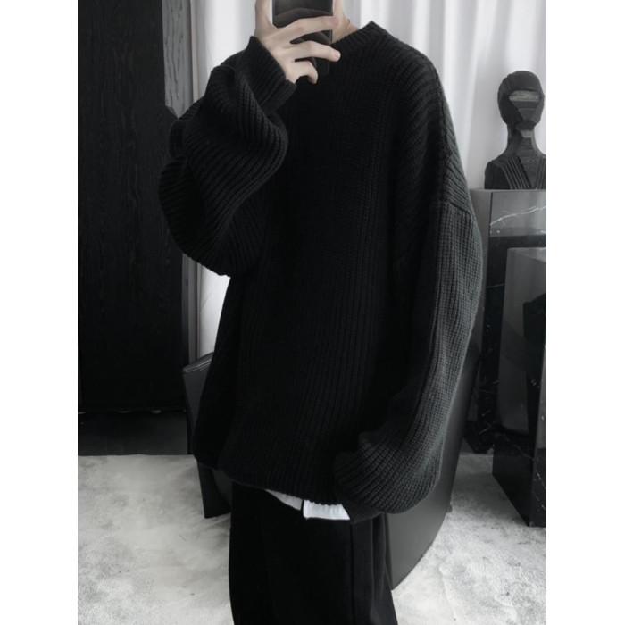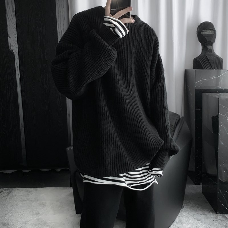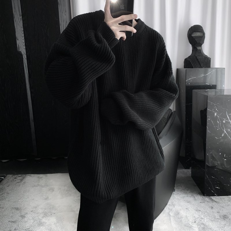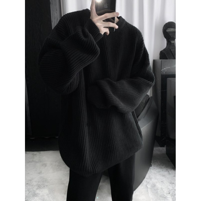 日系圓領針織衫男款冬季套頭慵懶風加厚保暖打底寬松毛衣復古線衣